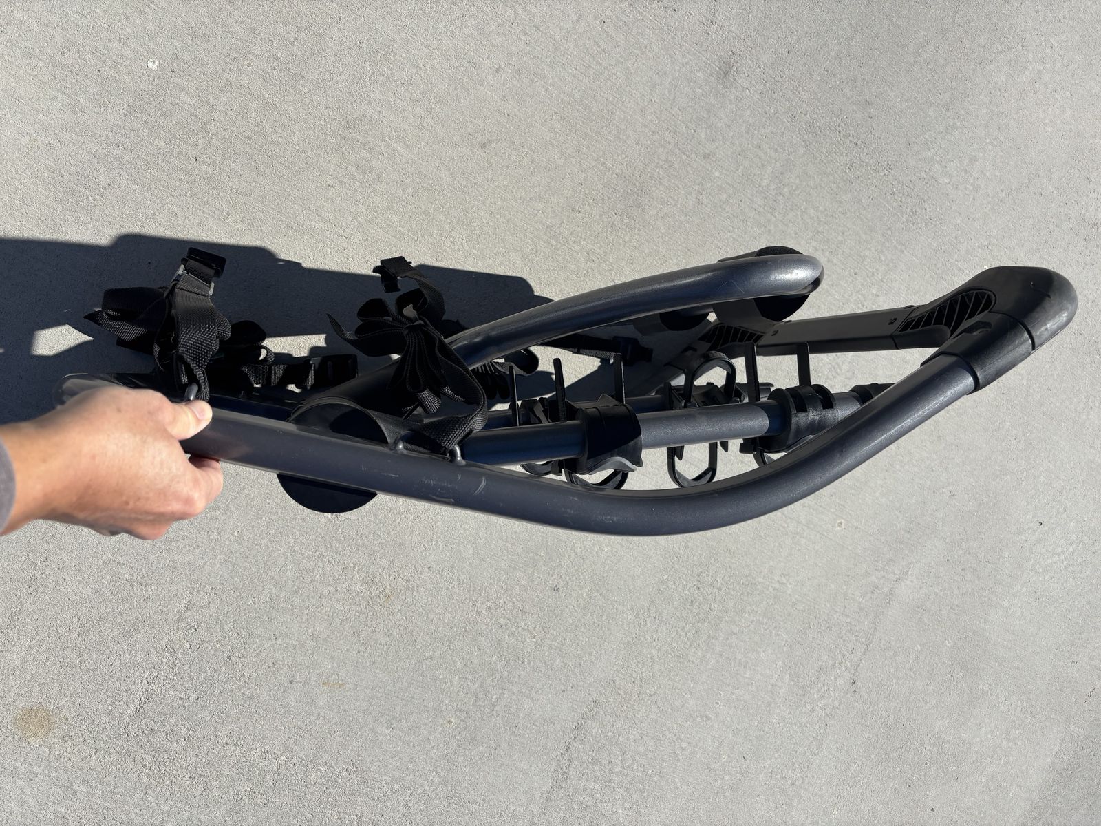 Folds down easily to slim size for storage in garage or inside trunk. Support arms swing up into various positions to accommodate most cars and vans and bikes.