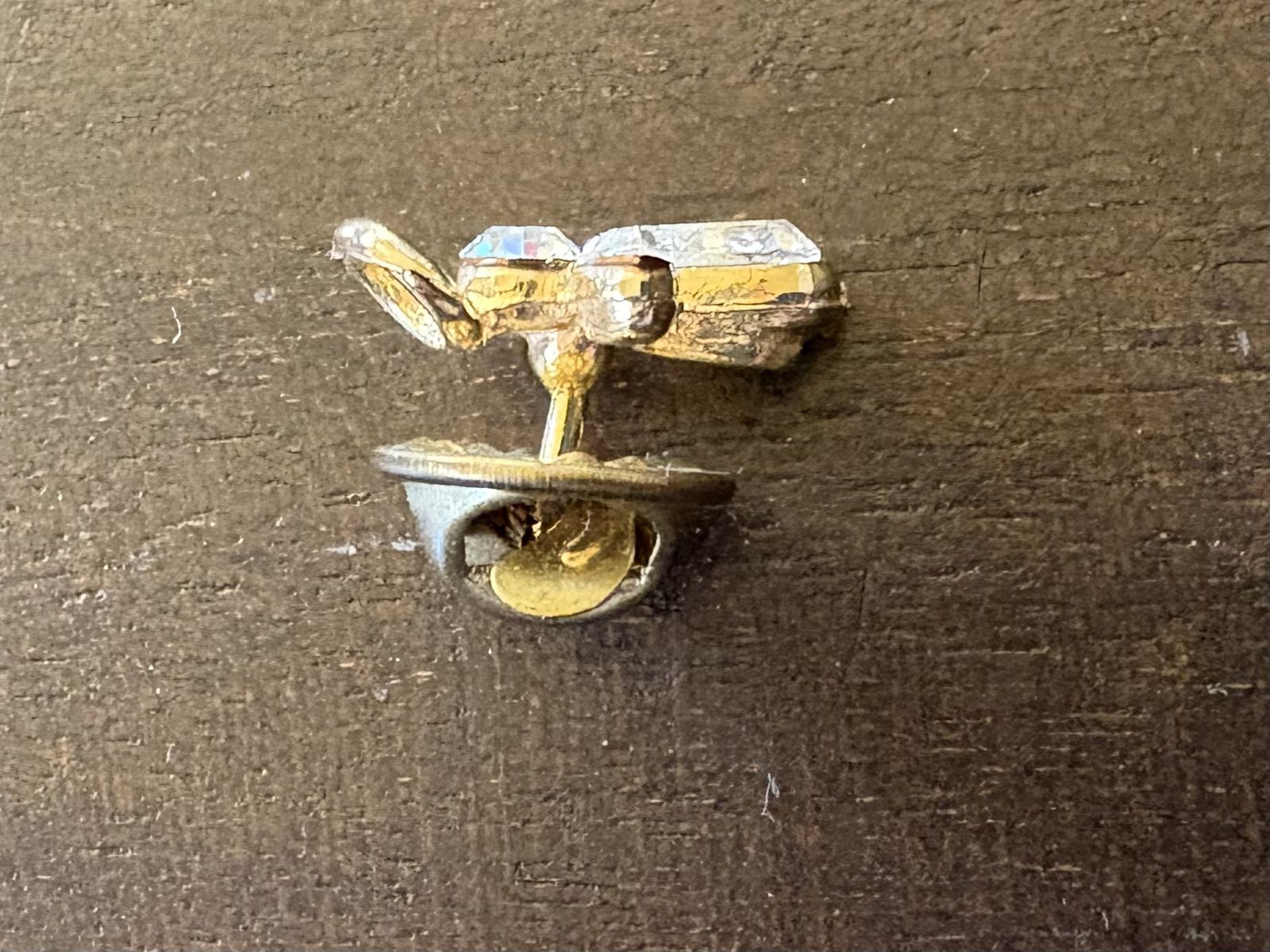 I have a vintage angel pin. It is gold tone with clear stones. I don’t know what the metal actually is but it does stick to a magnet. The back that holds it on doesn’t stick. It is 3/4 inches tall. The back is marked OSC. See my other ads for jewelry, artwork, home decor and more.