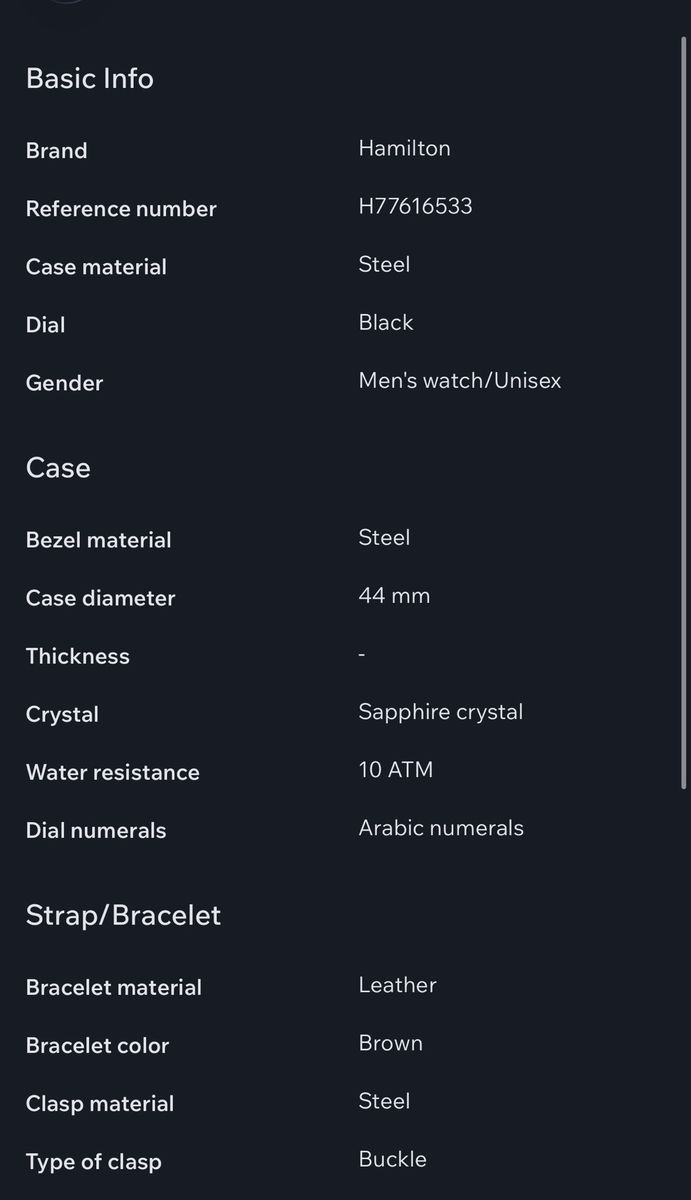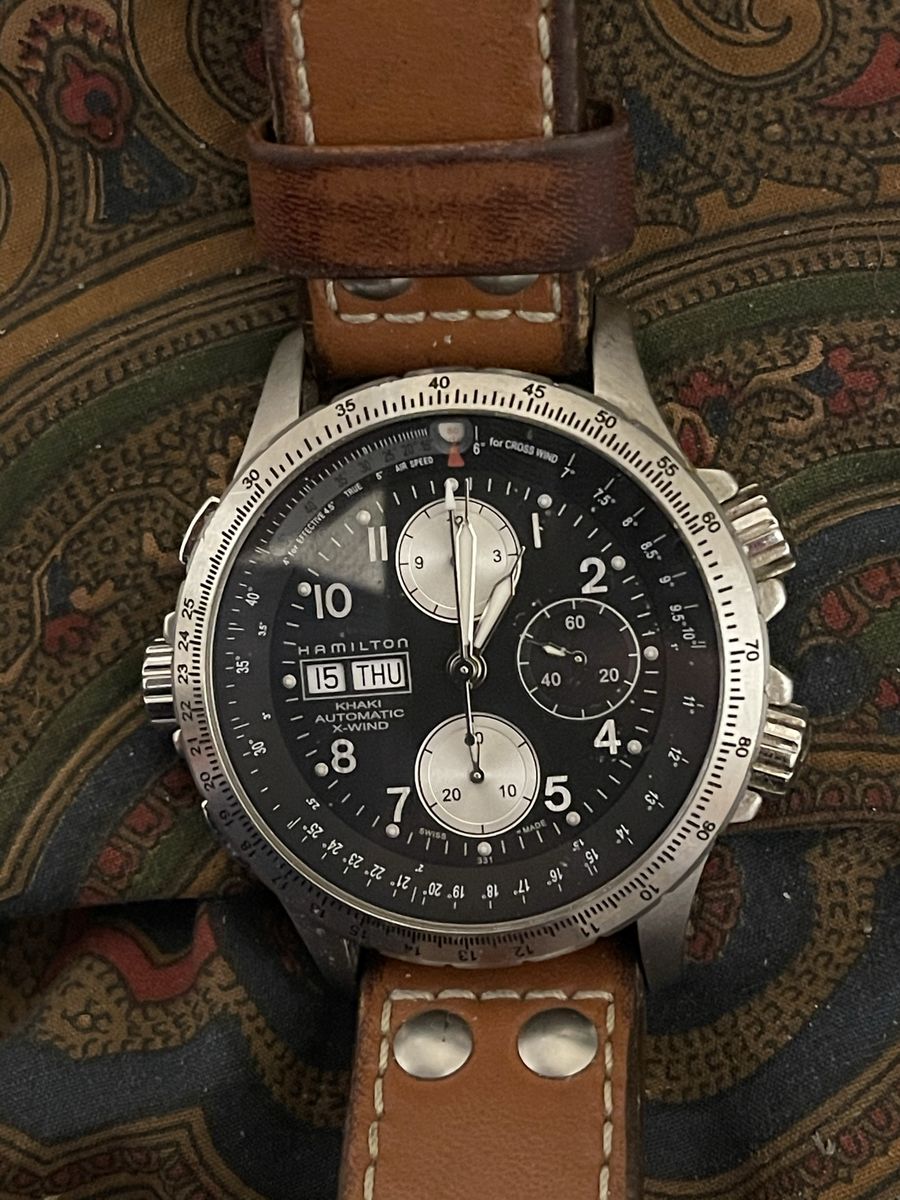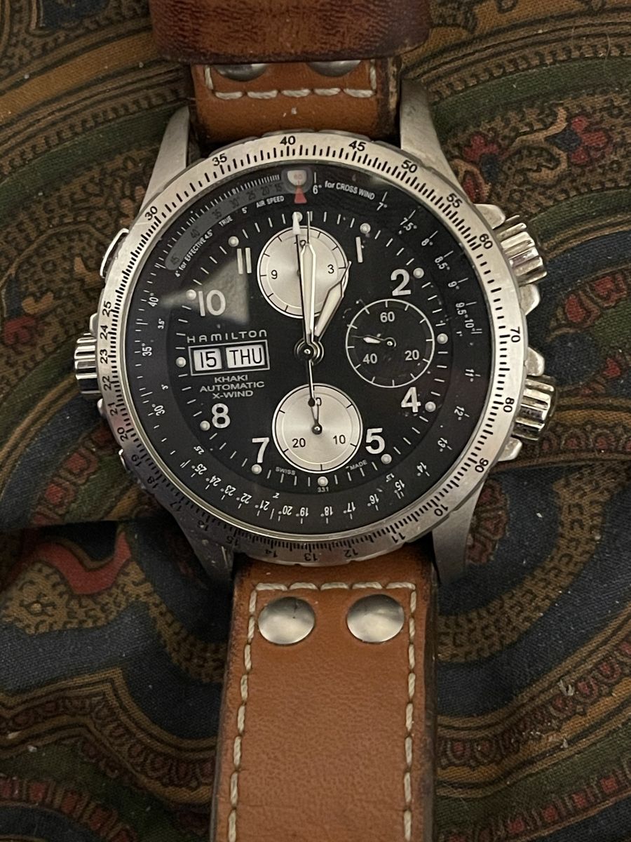 Pre owned Hamilton X-Wind chronograph in stainless steel and tan leather band. Chrono24 lists fair market value at $1018. See pictures for watch specifics. Leather band is darkened from wear. The watch crystal and case are flawless.