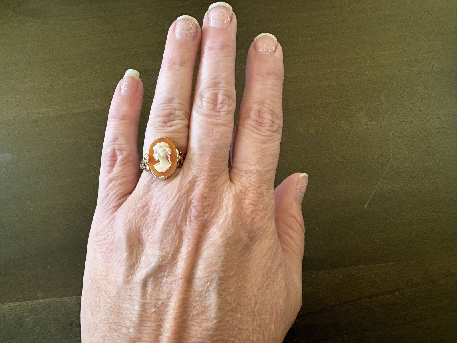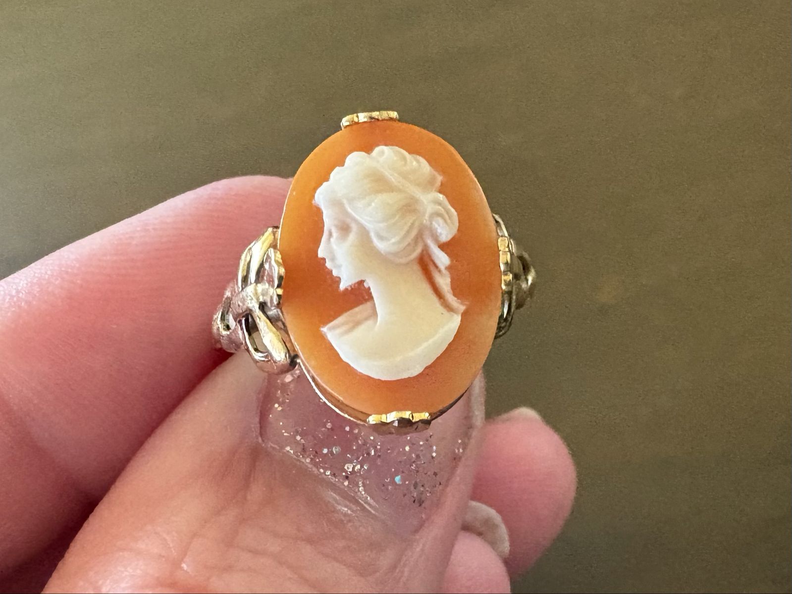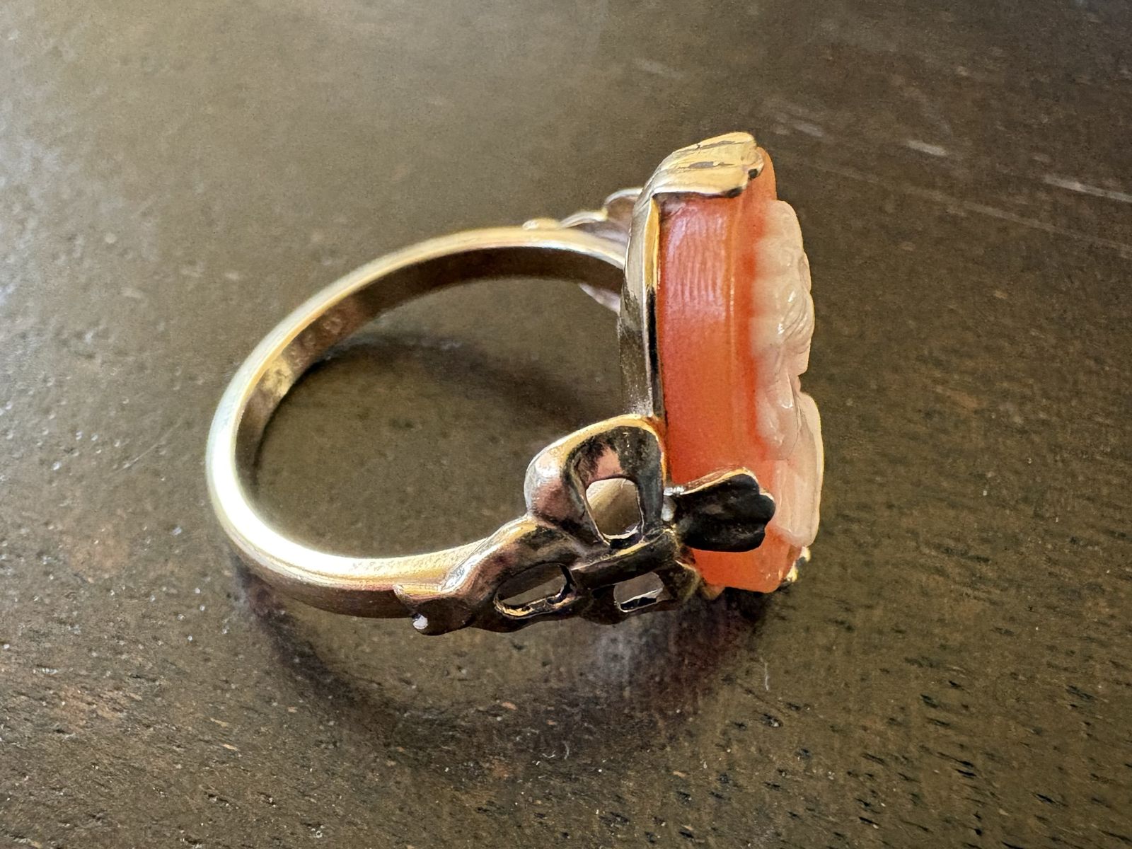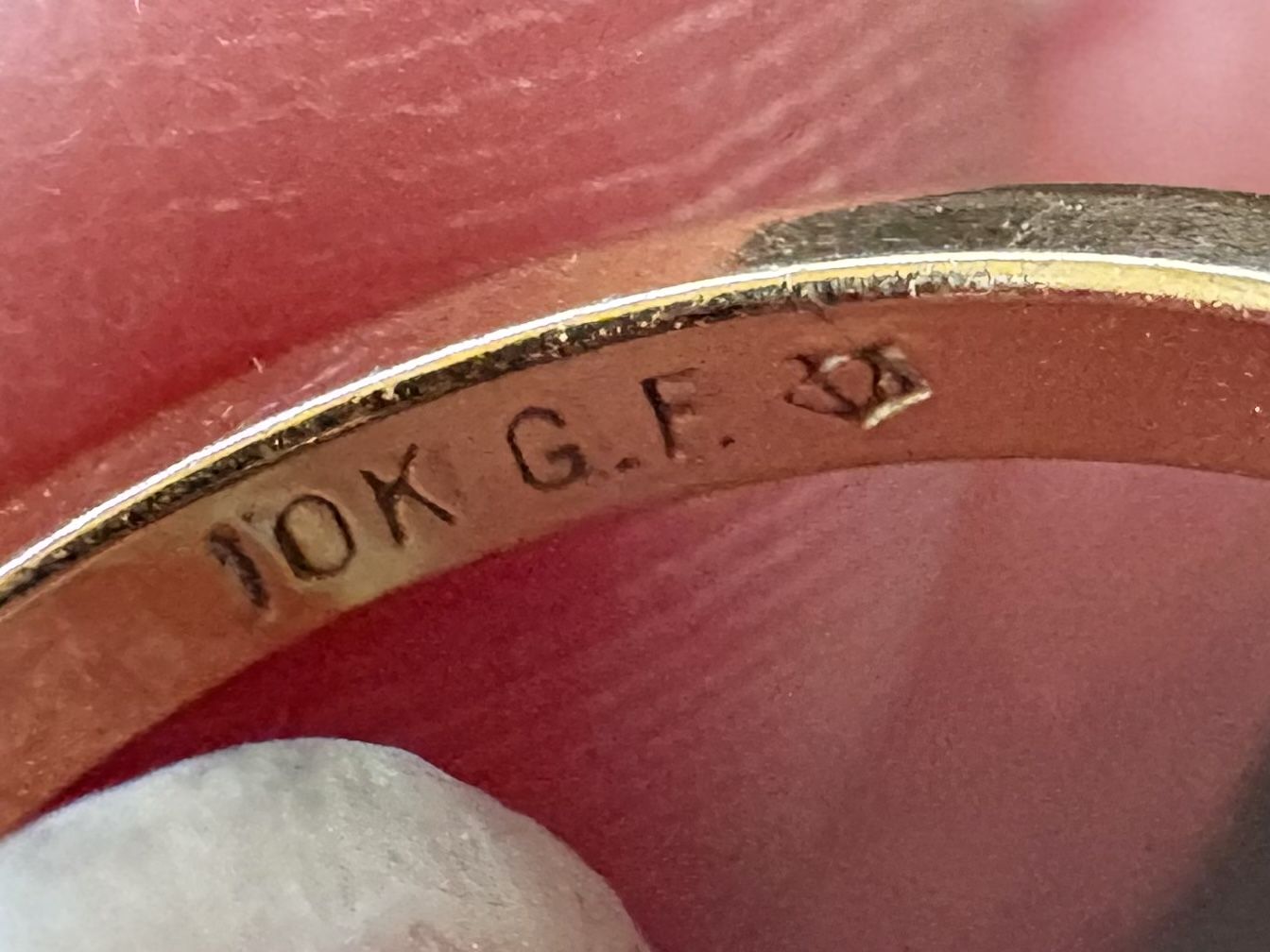 I have a beautiful vintage cameo ring. It is just under a size 6. It is marked 10K G.F. With a symbol next to it. The cameo is coral colored with a white bust. I’m not sure what it’s made of. It is 5/8 inches tall. See my other ads for jewelry, artwork, home decor and more.