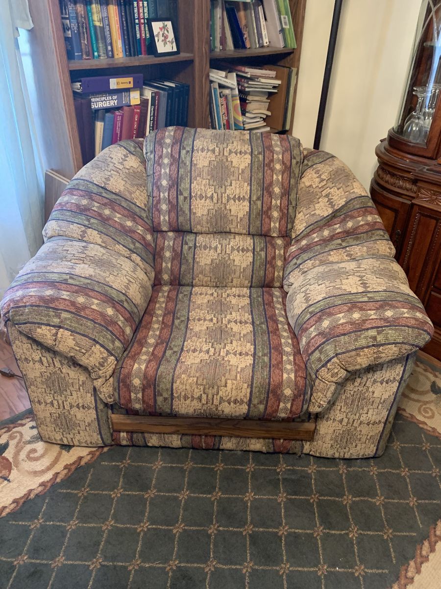 Patterned tan and green sofa and matching over stuffed chair. Good condition.