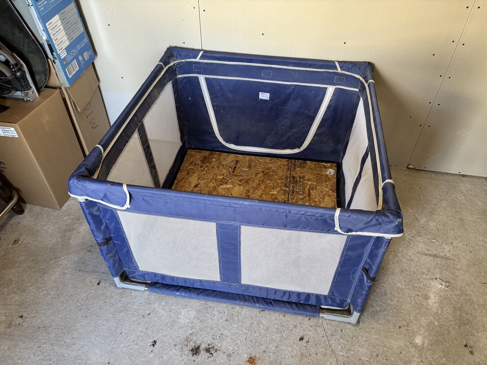 36”x 36” square playpen with plywood flooring that lays perfectly inside it.