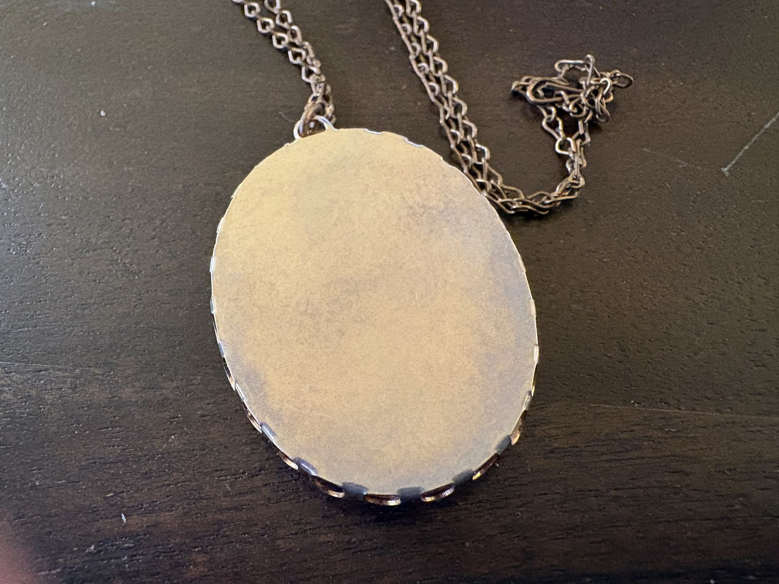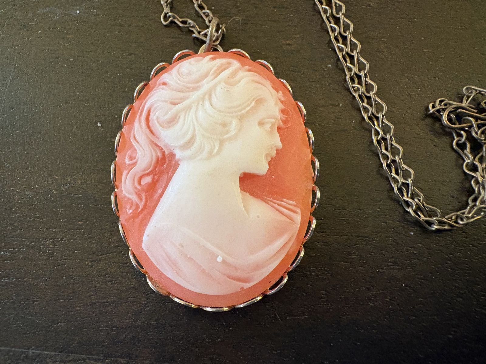 I have a vintage cameo pendant on a necklace. The chain is brass colored and doesn’t stick to a magnet. The back on the pendant is antique silver colored and does stick to a magnet. The cameo is coral colored with a white lady. I’m not sure what it’s made of. It is 1 3/4 inches tall. The chain is 20 inches long. See my other ads for jewelry, artwork, home decor and more.