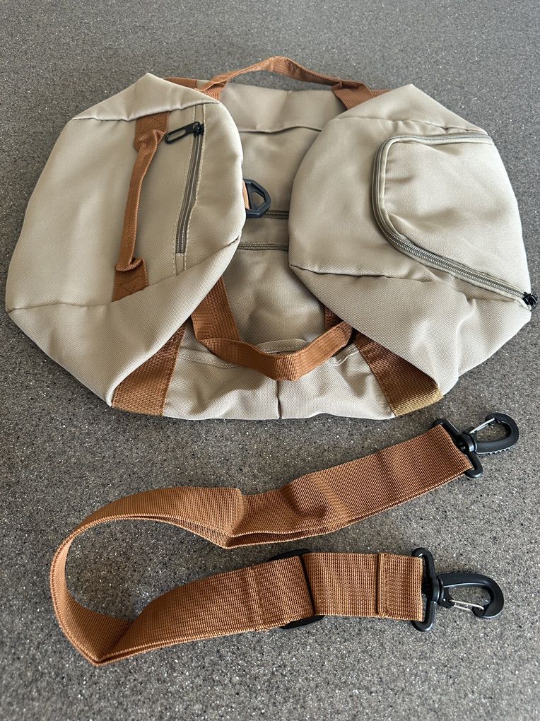 VenmoUpgrade your gym or travel game with this high-function, tan and brown duffle bag. Designed with specific compartments to keep your clean gear separate from your used gear, it's the perfect all-in-one bag for the gym, weekend trips, or sports.