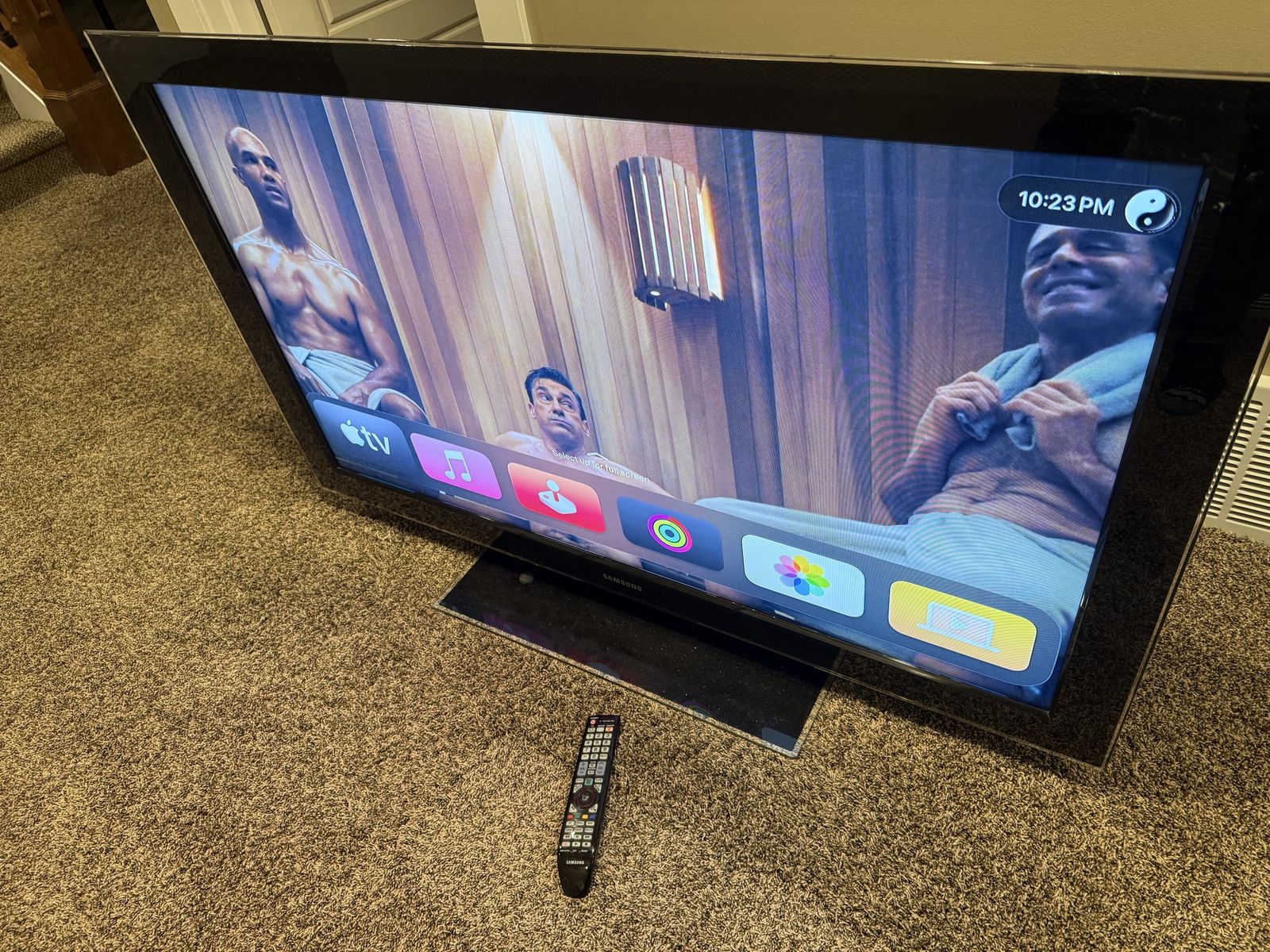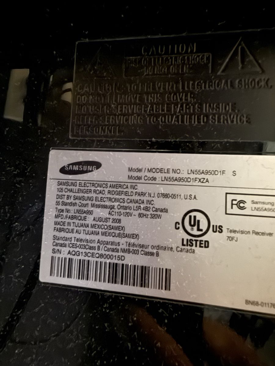 VenmoSamsung LN55A950D1F 55” TV from 2008. High end for its time, it’s obsolete today since it’s not a smart TV and it’s heavy and thick. The bezel glass is intact but not perfect. It comes with a stand (though I can’t find the screws for it, but it stands up without them). It also comes with remote and power cable. Picture quality is good and it has a lot of HDMI ports and other types too.