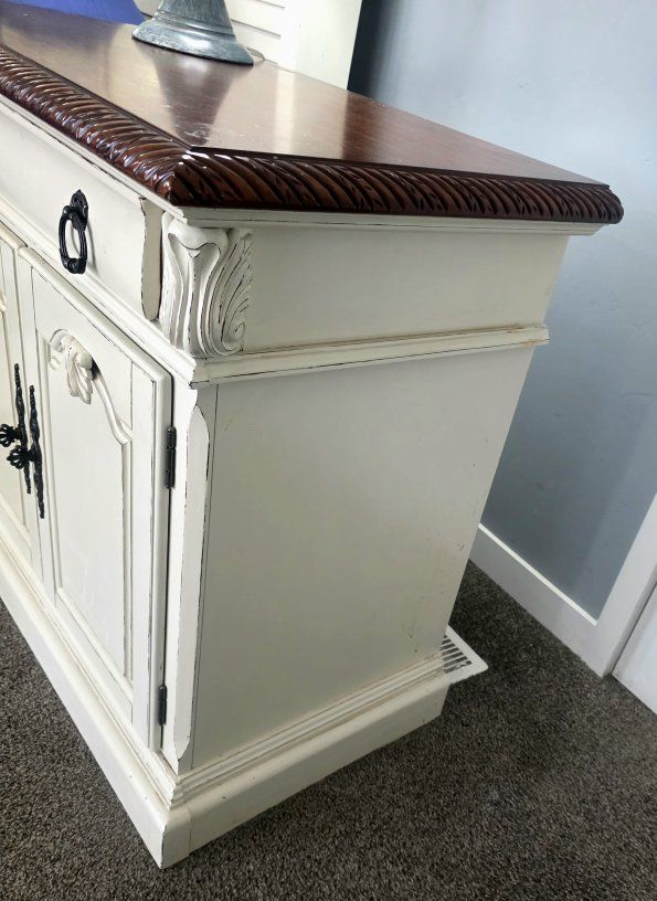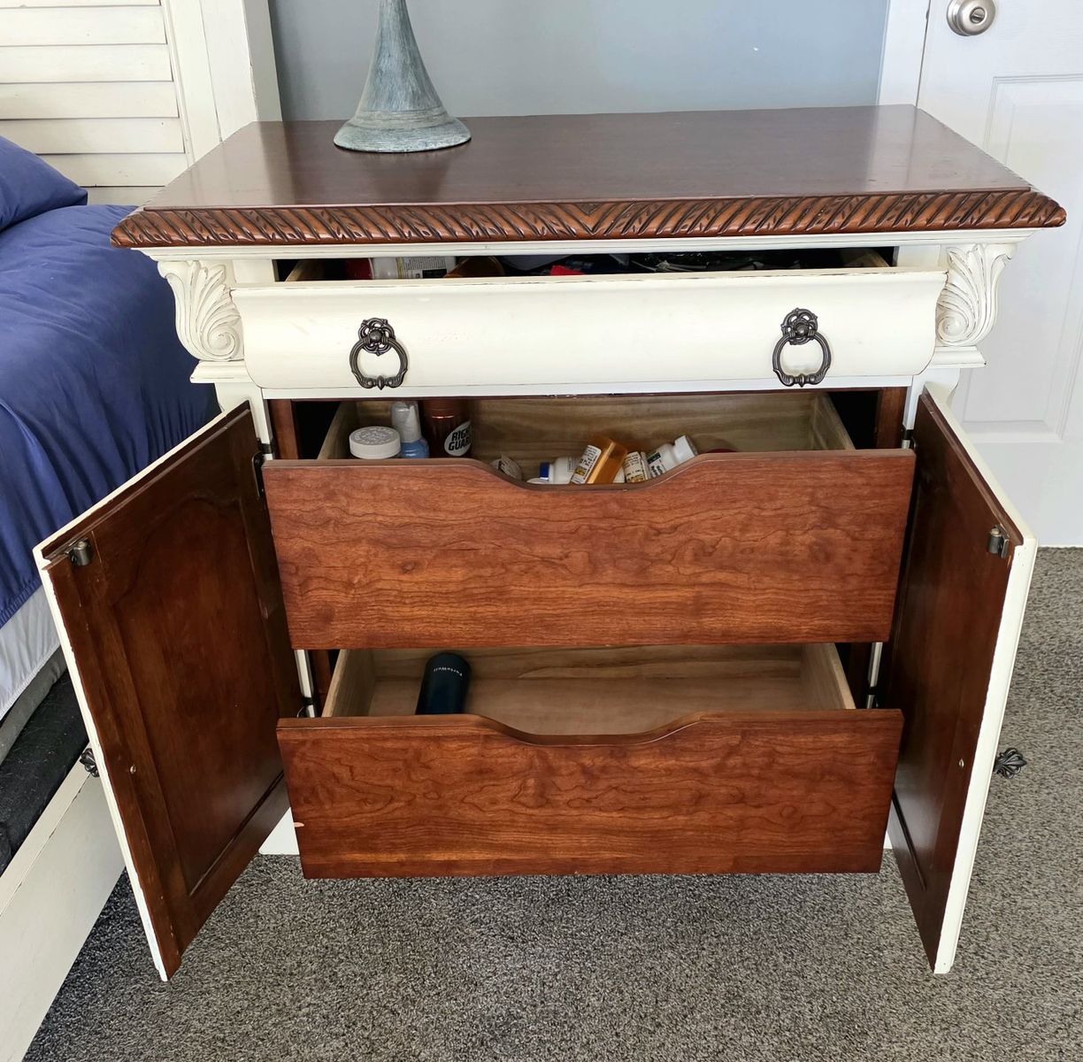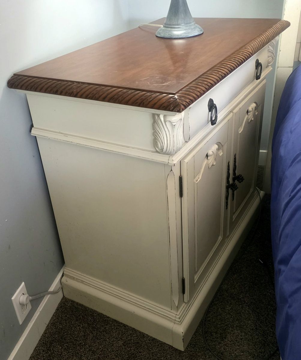 PayPal2 Beautiful large Nightstands or can be used for small dressers. 33" high x 36" wide x 20.5" deep. I don't know how old these are since I bought them from someone else. Solidly made pieces with 3 drawers & 2 of the drawers are inside the double doors. Farmhouse, Rustic, Vintage, Shabby Chic, classic design. I also have the matching Amoire & a mirror I'm selling if you want to check out my other listings.