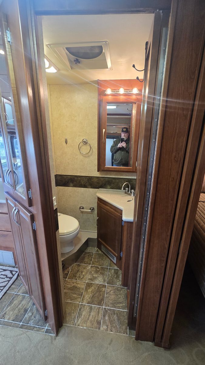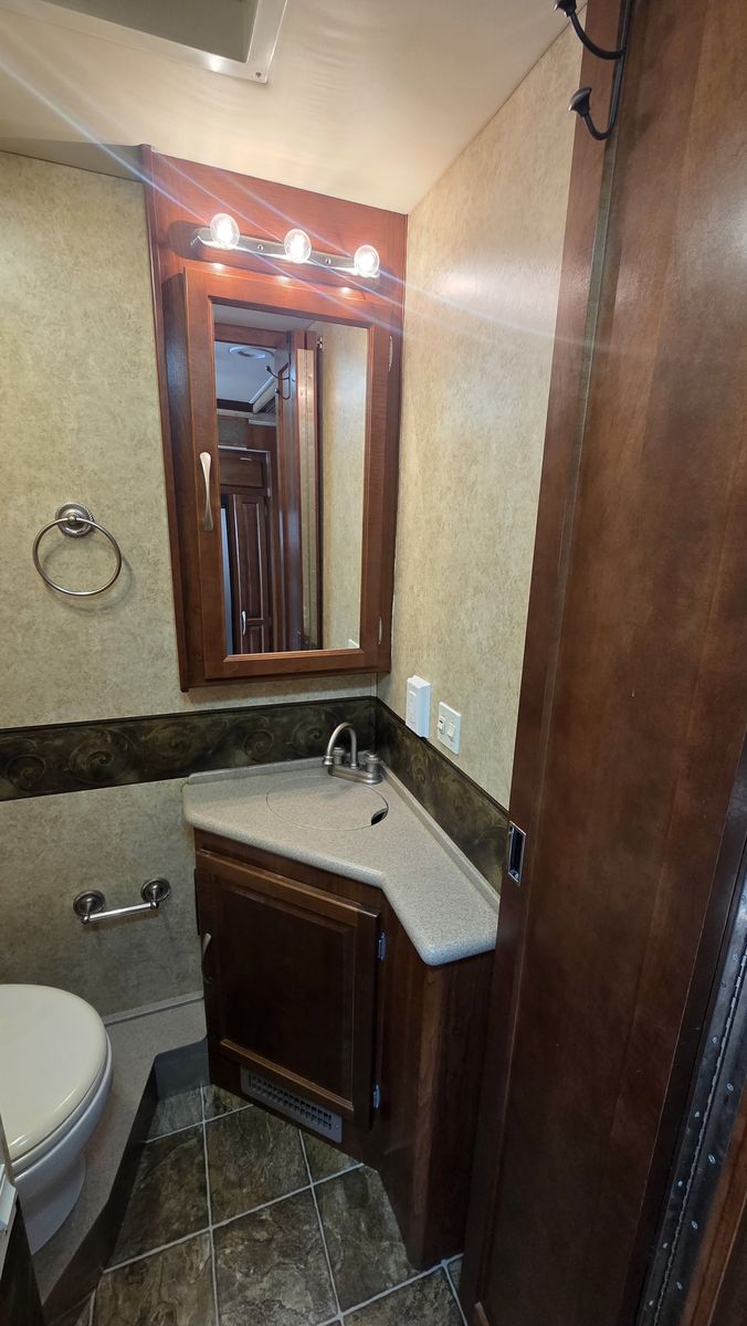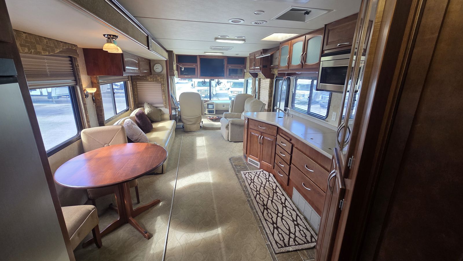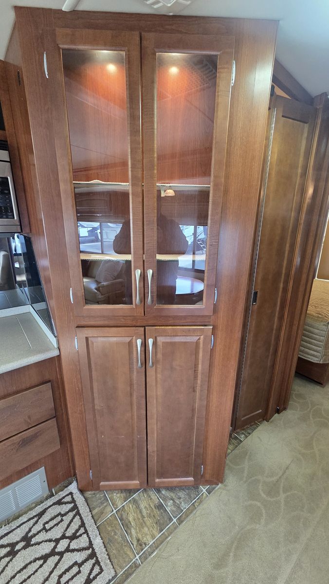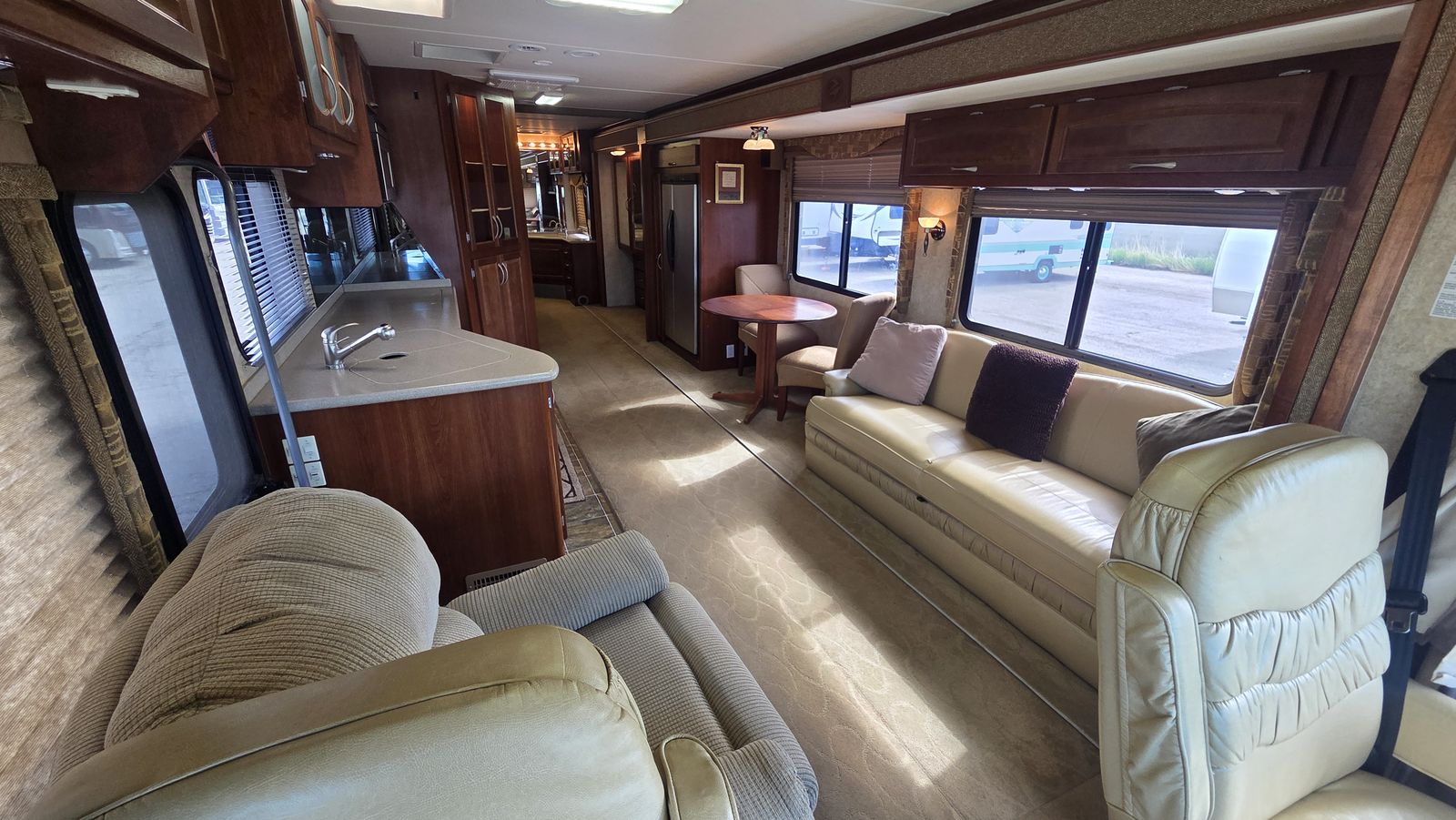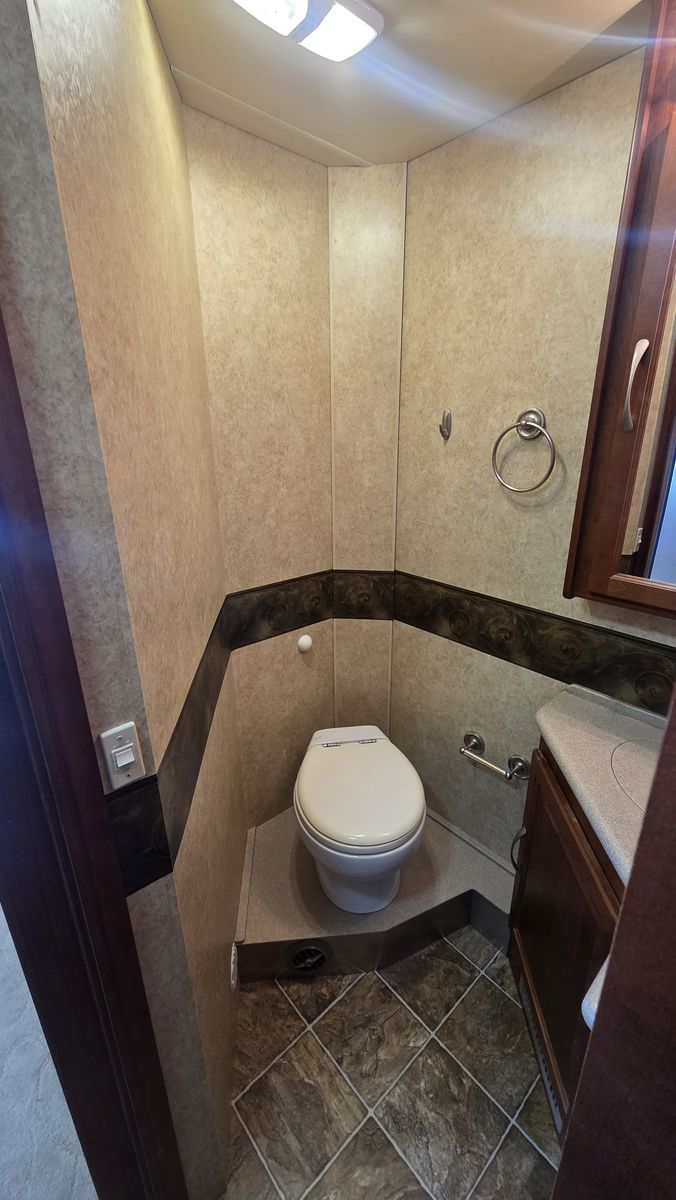 This Pace Arrow 36D stands out for its spacious layout and higher-end finishes for its class. The full wall slide dramatically increases living space, while the split bath design improves usability and privacy.