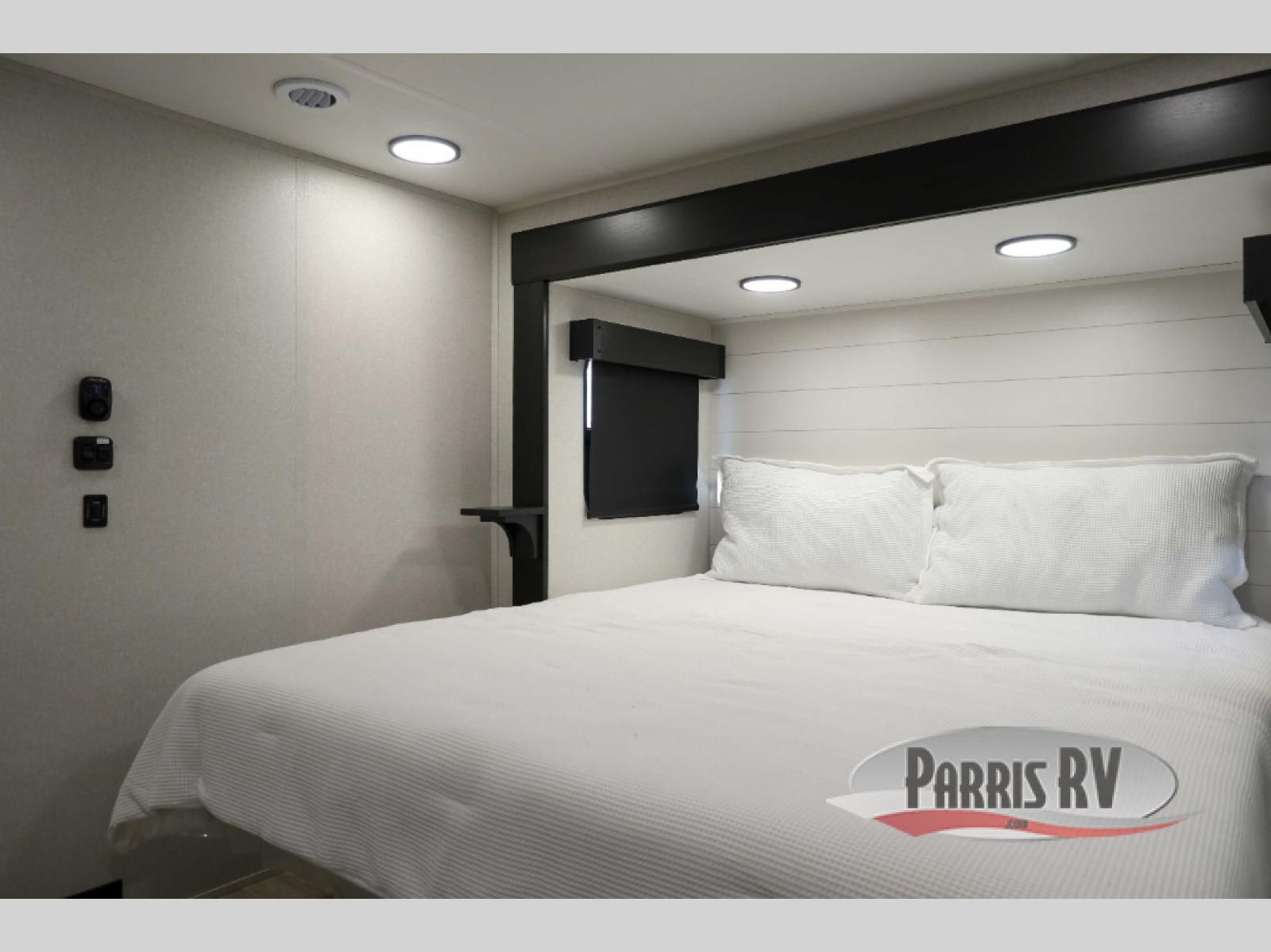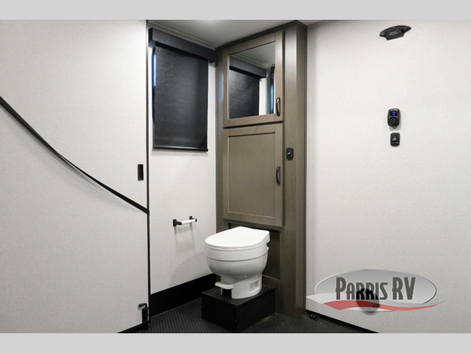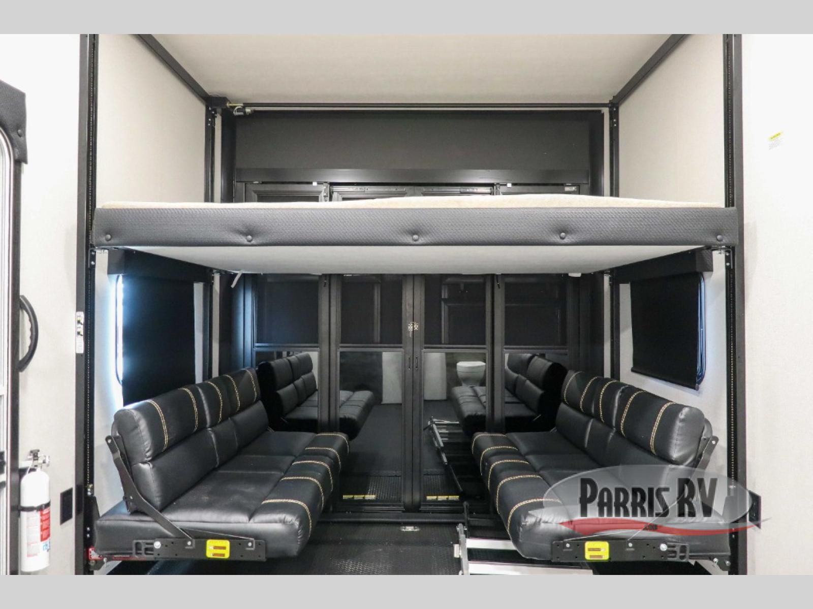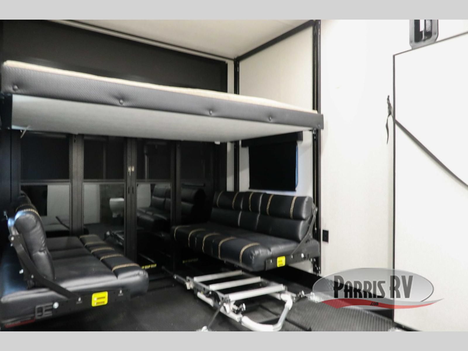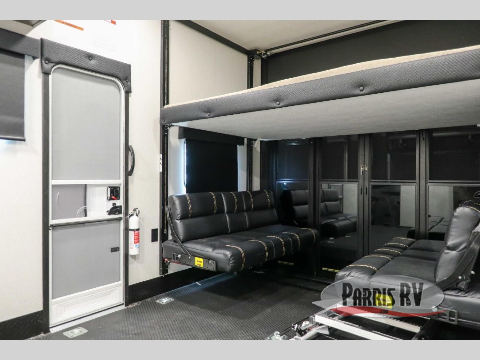 Get on the road with this toy hauler fifth wheel! The 14' garage is a playground for your toys, offering ample space for your ATV, motorcycle, or other gear. The loft above provides additional storage and an electric queen bed for a comfortable rest. The living room is a haven for relaxation, featuring an L-shaped sofa and a theater-style seat perfect for enjoying your favorite shows or movies on the TV. The kitchen is a culinary delight, equipped with a 12V refrigerator, microwave, overhead cabinets, and ample countertop space. The credenza with roll-out table is perfect for meal prep or serving, and the full bathroom provides a private space to freshen up, while the half bath option in the garage gives you more options. The cherry on top is that the front bedroom is a regal retreat, featuring a king bed, drawers, and a spacious walk-in closet.