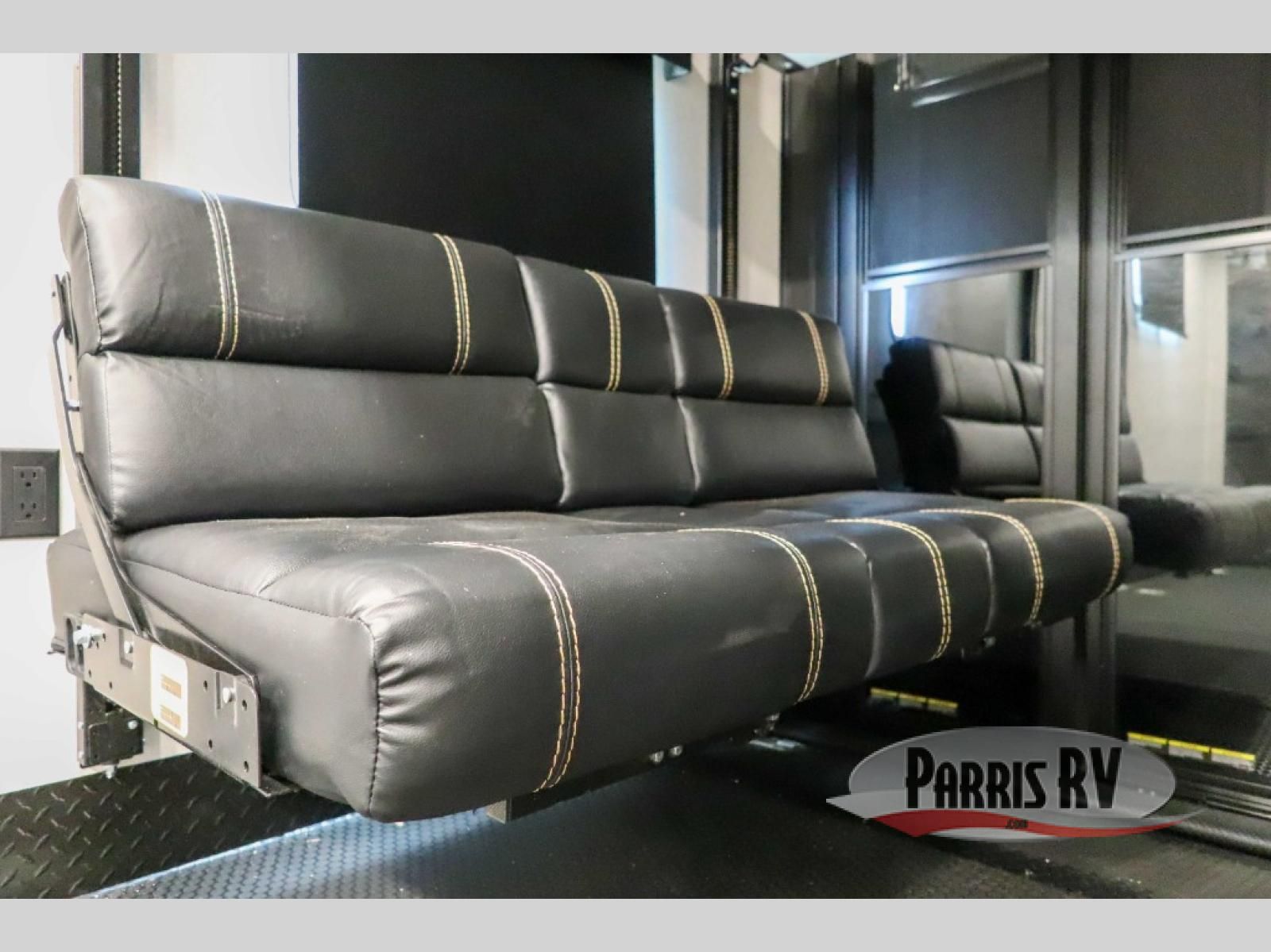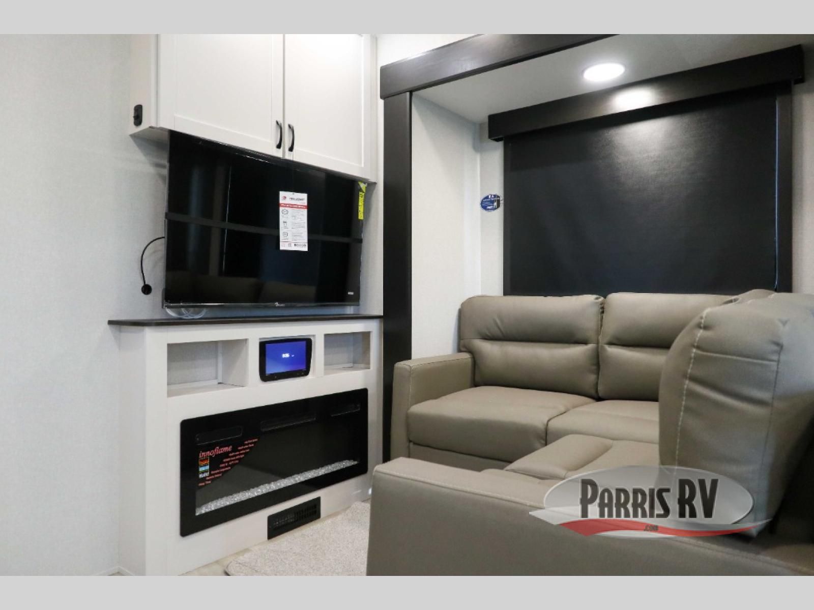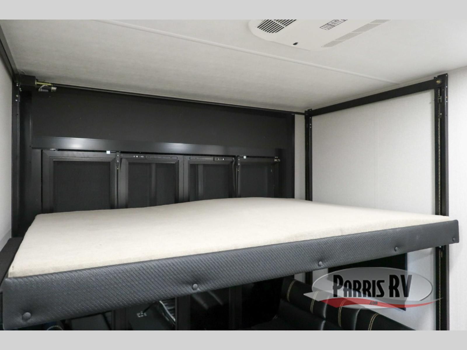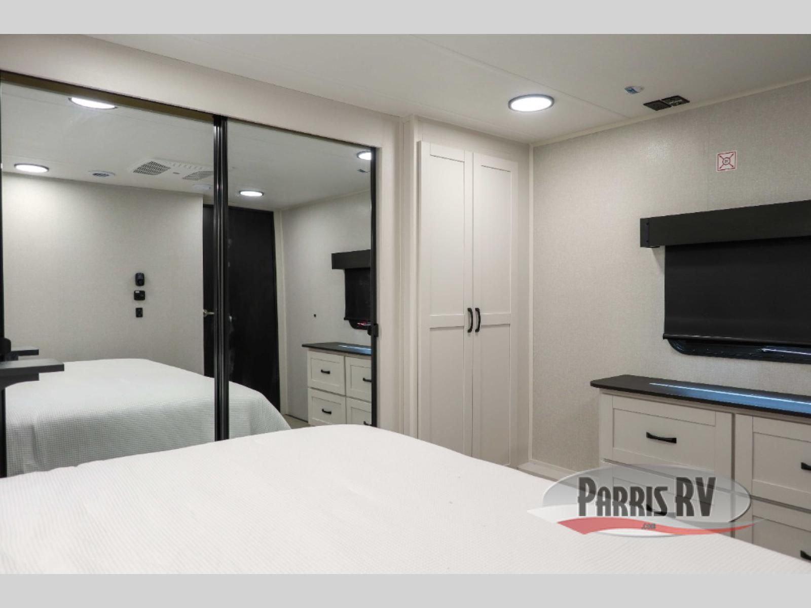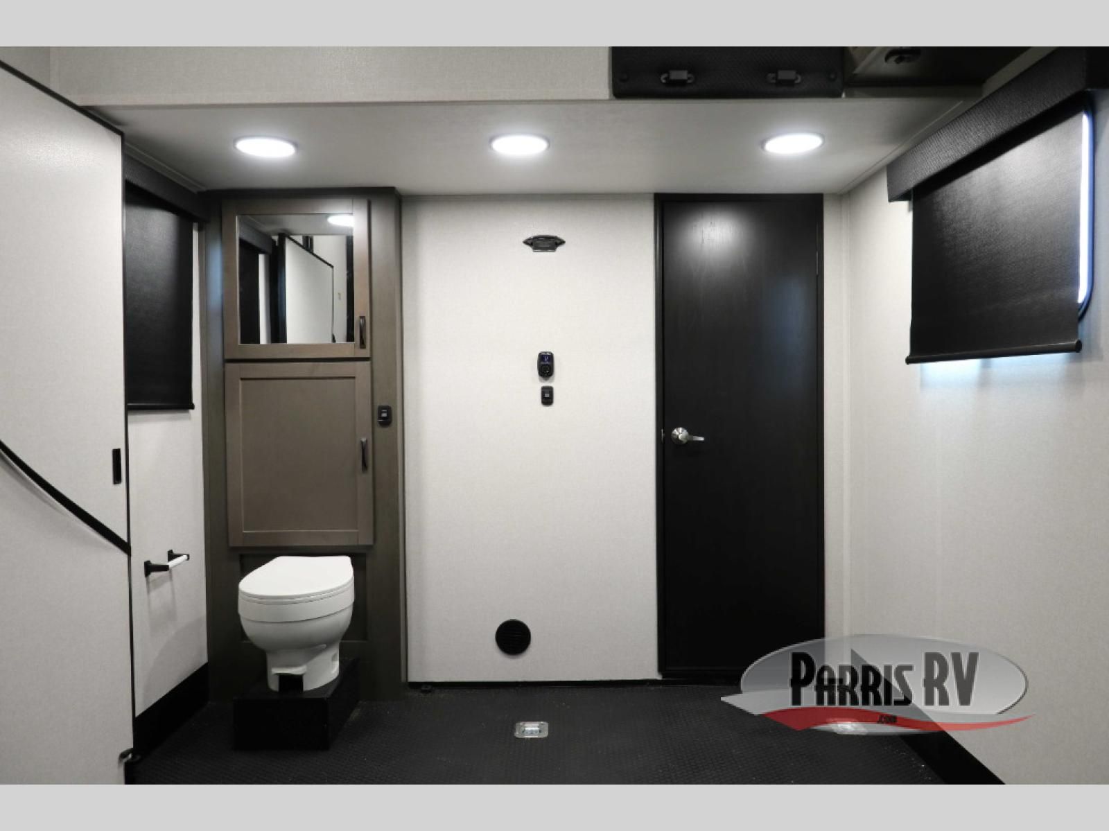 Get on the road with this toy hauler fifth wheel! The 14' garage is a playground for your toys, offering ample space for your ATV, motorcycle, or other gear. The loft above provides additional storage and an electric queen bed for a comfortable rest. The living room is a haven for relaxation, featuring an L-shaped sofa and a theater-style seat perfect for enjoying your favorite shows or movies on the TV. The kitchen is a culinary delight, equipped with a 12V refrigerator, microwave, overhead cabinets, and ample countertop space. The credenza with roll-out table is perfect for meal prep or serving, and the full bathroom provides a private space to freshen up, while the half bath option in the garage gives you more options. The cherry on top is that the front bedroom is a regal retreat, featuring a king bed, drawers, and a spacious walk-in closet.