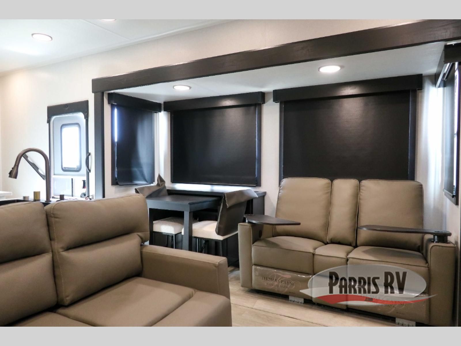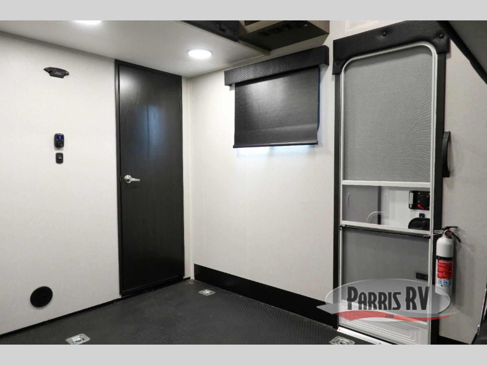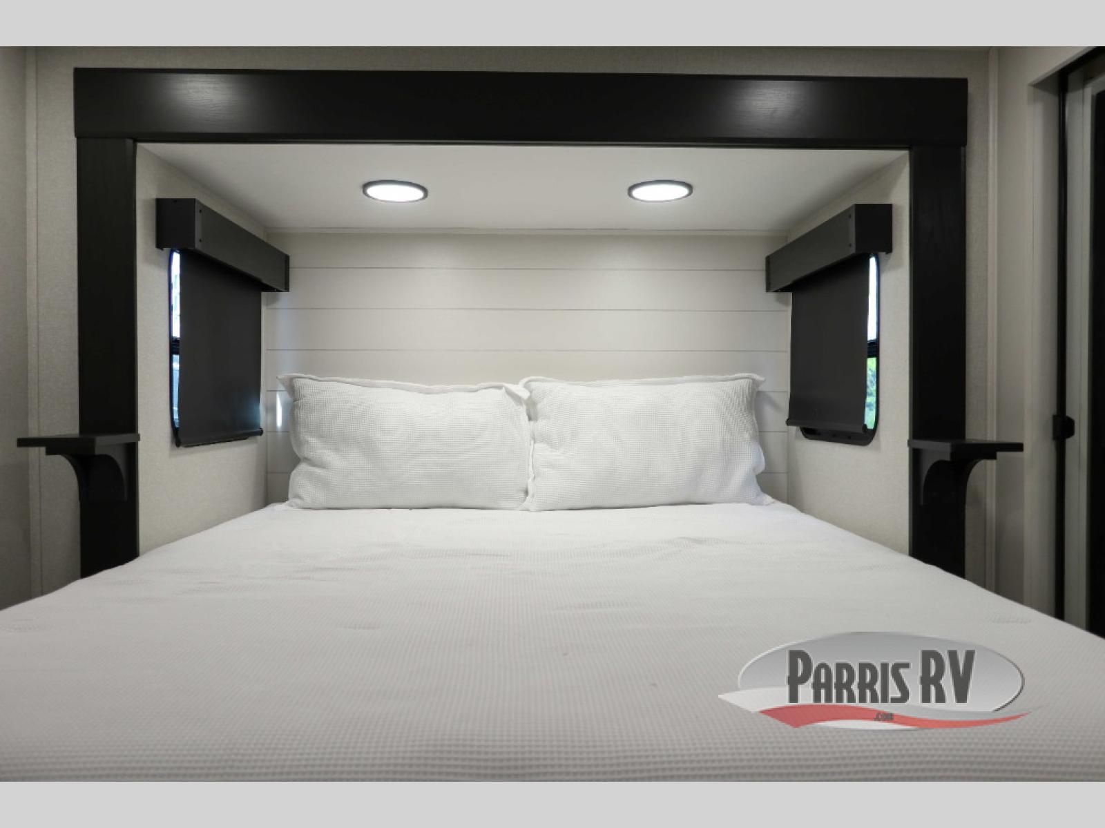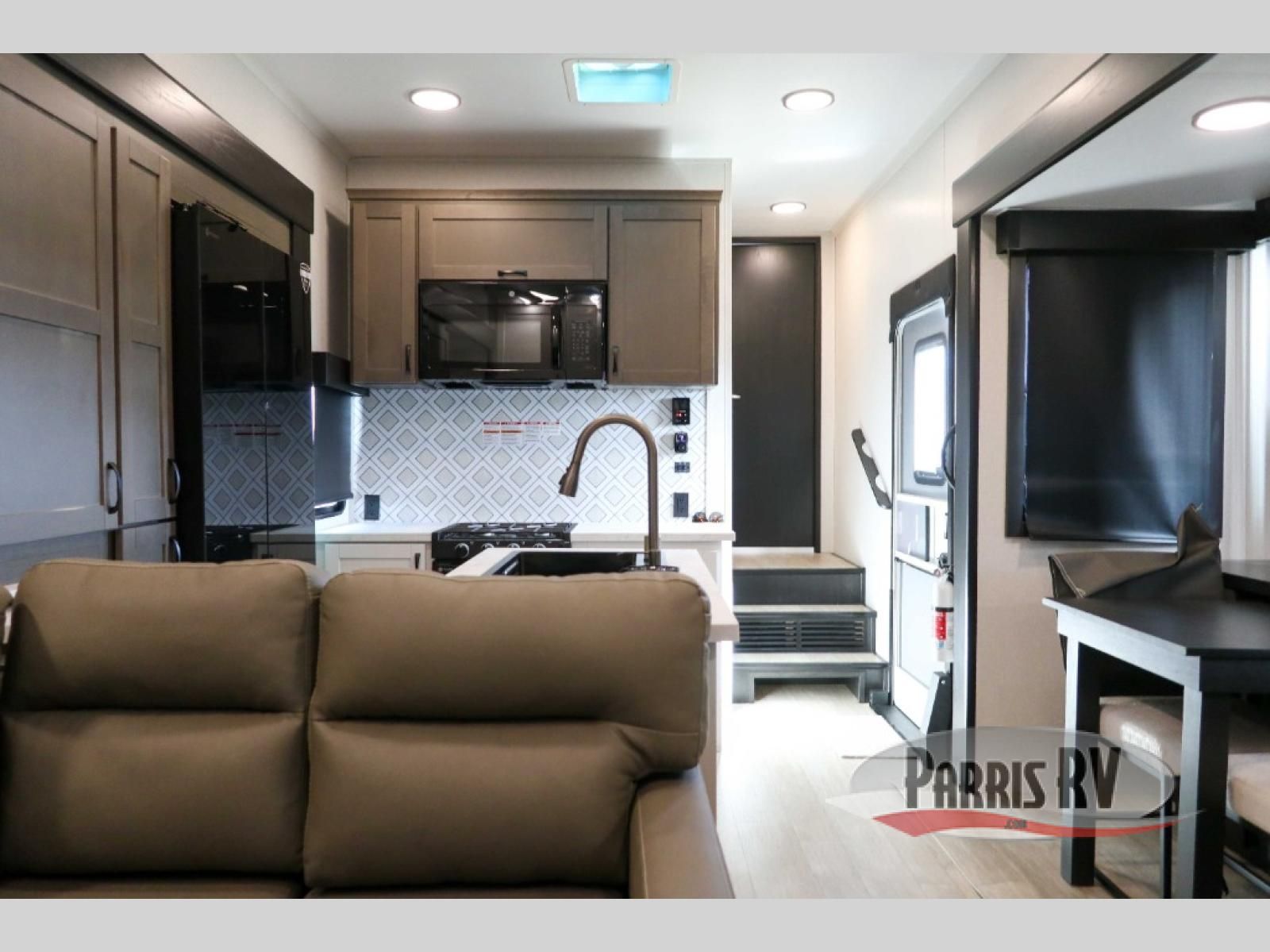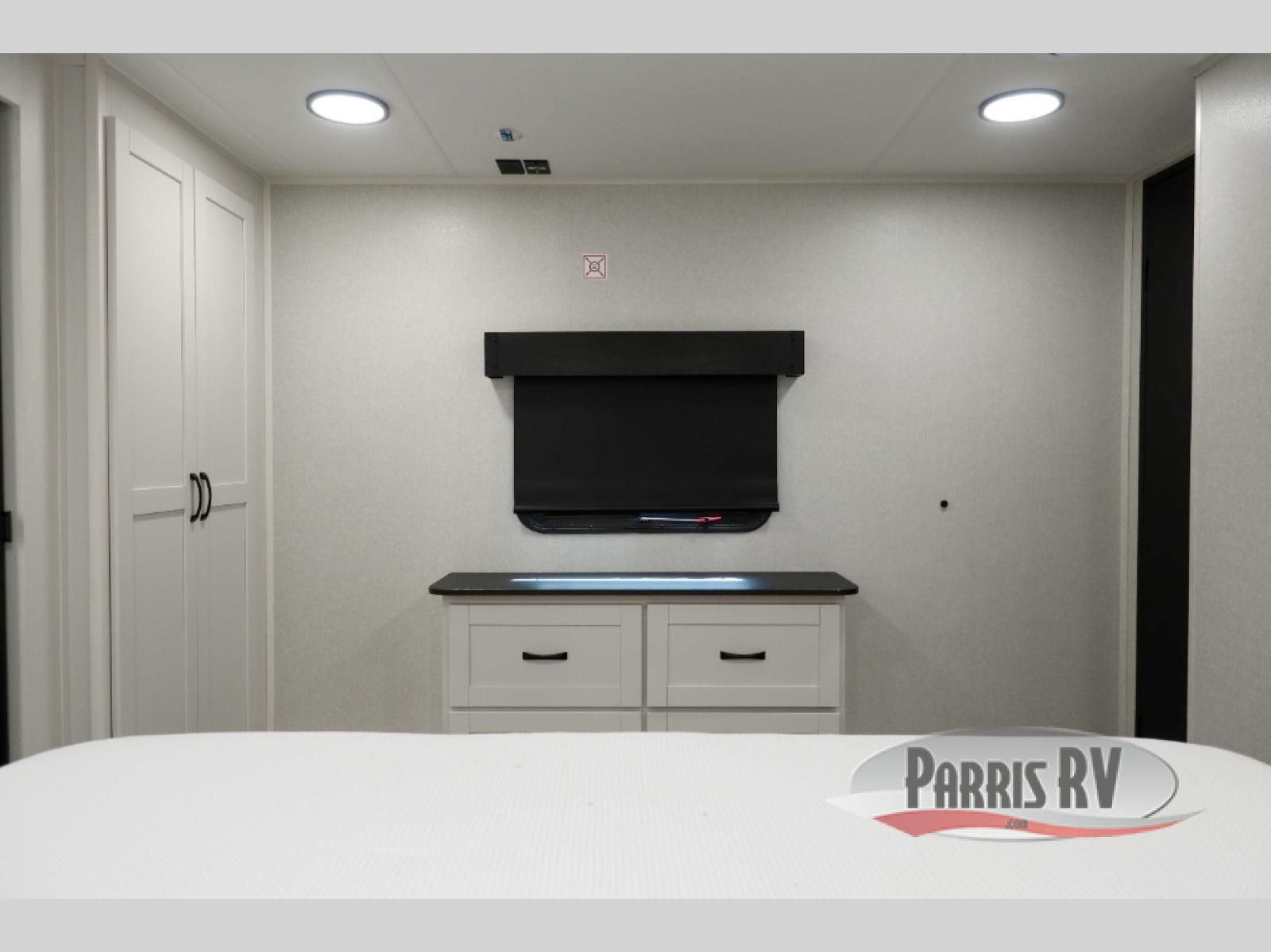 Get on the road with this toy hauler fifth wheel! The 14' garage is a playground for your toys, offering ample space for your ATV, motorcycle, or other gear. The loft above provides additional storage and an electric queen bed for a comfortable rest. The living room is a haven for relaxation, featuring an L-shaped sofa and a theater-style seat perfect for enjoying your favorite shows or movies on the TV. The kitchen is a culinary delight, equipped with a 12V refrigerator, microwave, overhead cabinets, and ample countertop space. The credenza with roll-out table is perfect for meal prep or serving, and the full bathroom provides a private space to freshen up, while the half bath option in the garage gives you more options. The cherry on top is that the front bedroom is a regal retreat, featuring a king bed, drawers, and a spacious walk-in closet.