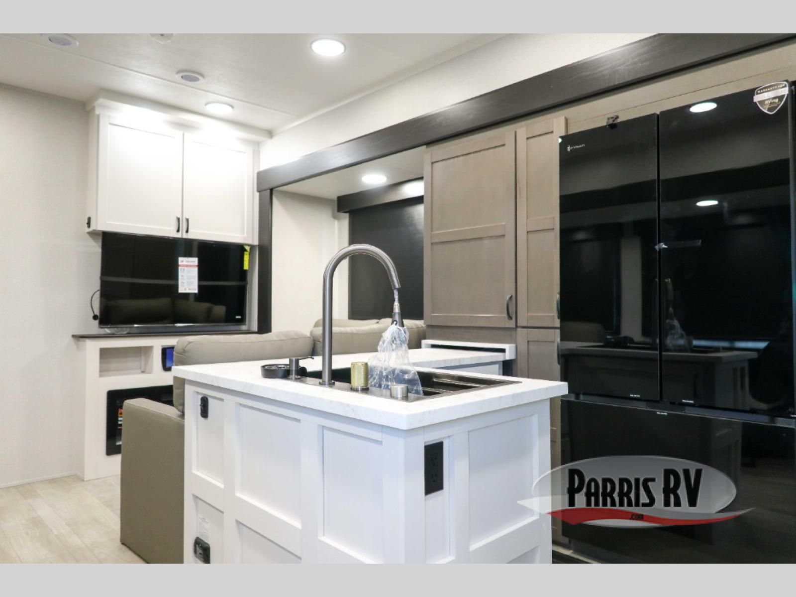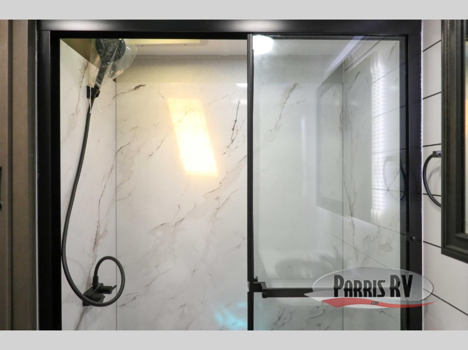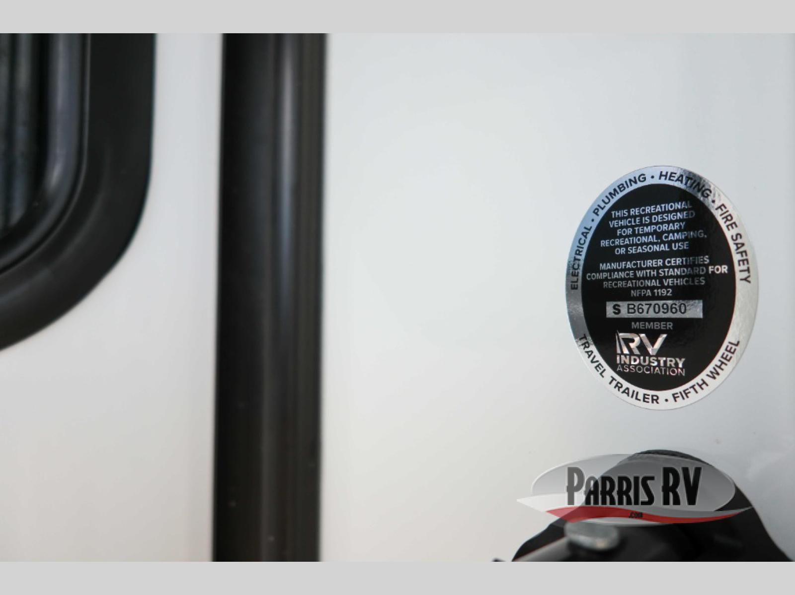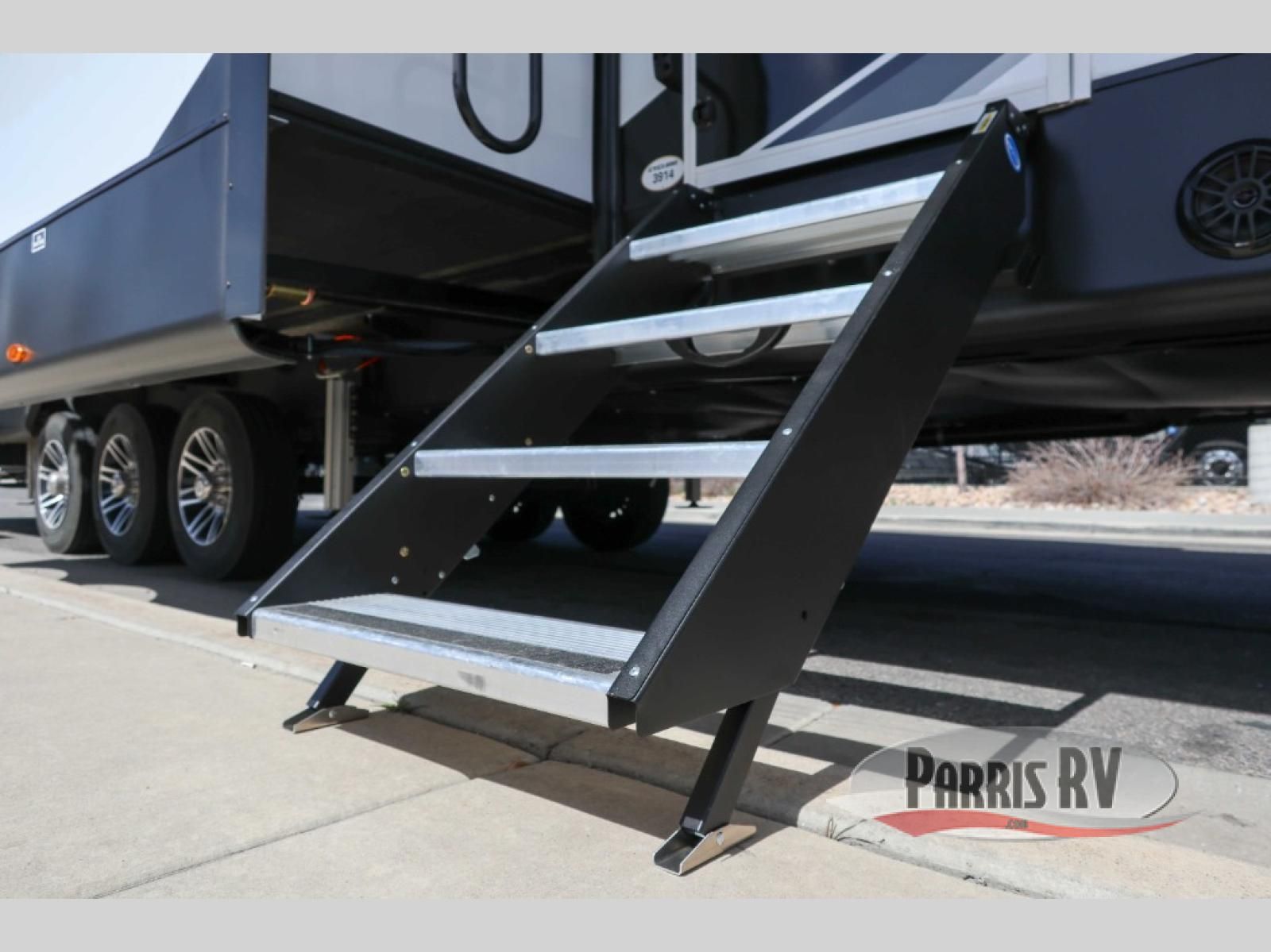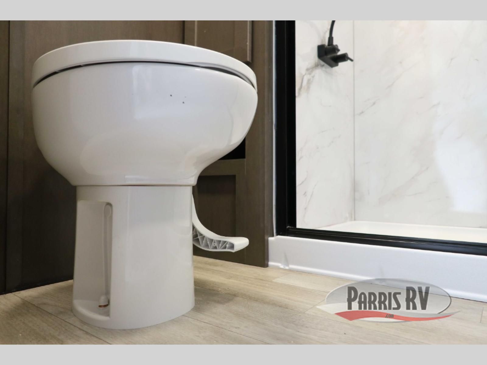 Get on the road with this toy hauler fifth wheel! The 14' garage is a playground for your toys, offering ample space for your ATV, motorcycle, or other gear. The loft above provides additional storage and an electric queen bed for a comfortable rest. The living room is a haven for relaxation, featuring an L-shaped sofa and a theater-style seat perfect for enjoying your favorite shows or movies on the TV. The kitchen is a culinary delight, equipped with a 12V refrigerator, microwave, overhead cabinets, and ample countertop space. The credenza with roll-out table is perfect for meal prep or serving, and the full bathroom provides a private space to freshen up, while the half bath option in the garage gives you more options. The cherry on top is that the front bedroom is a regal retreat, featuring a king bed, drawers, and a spacious walk-in closet.