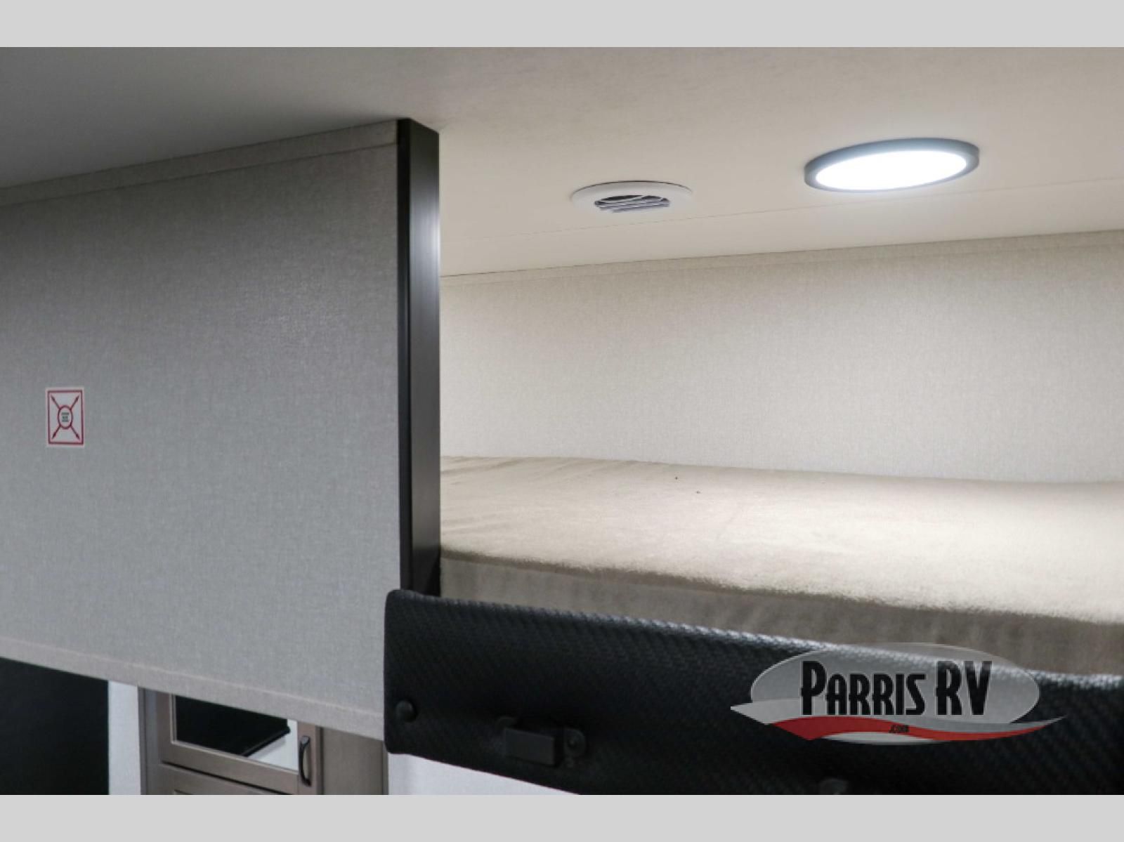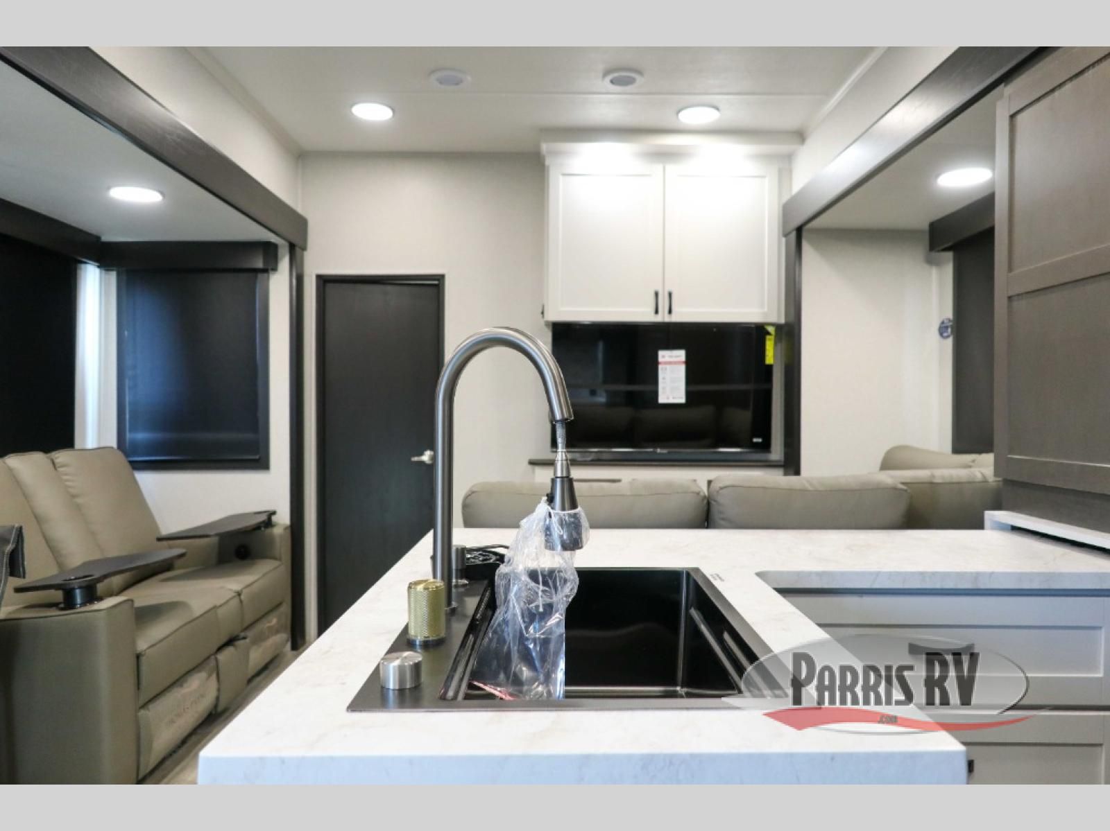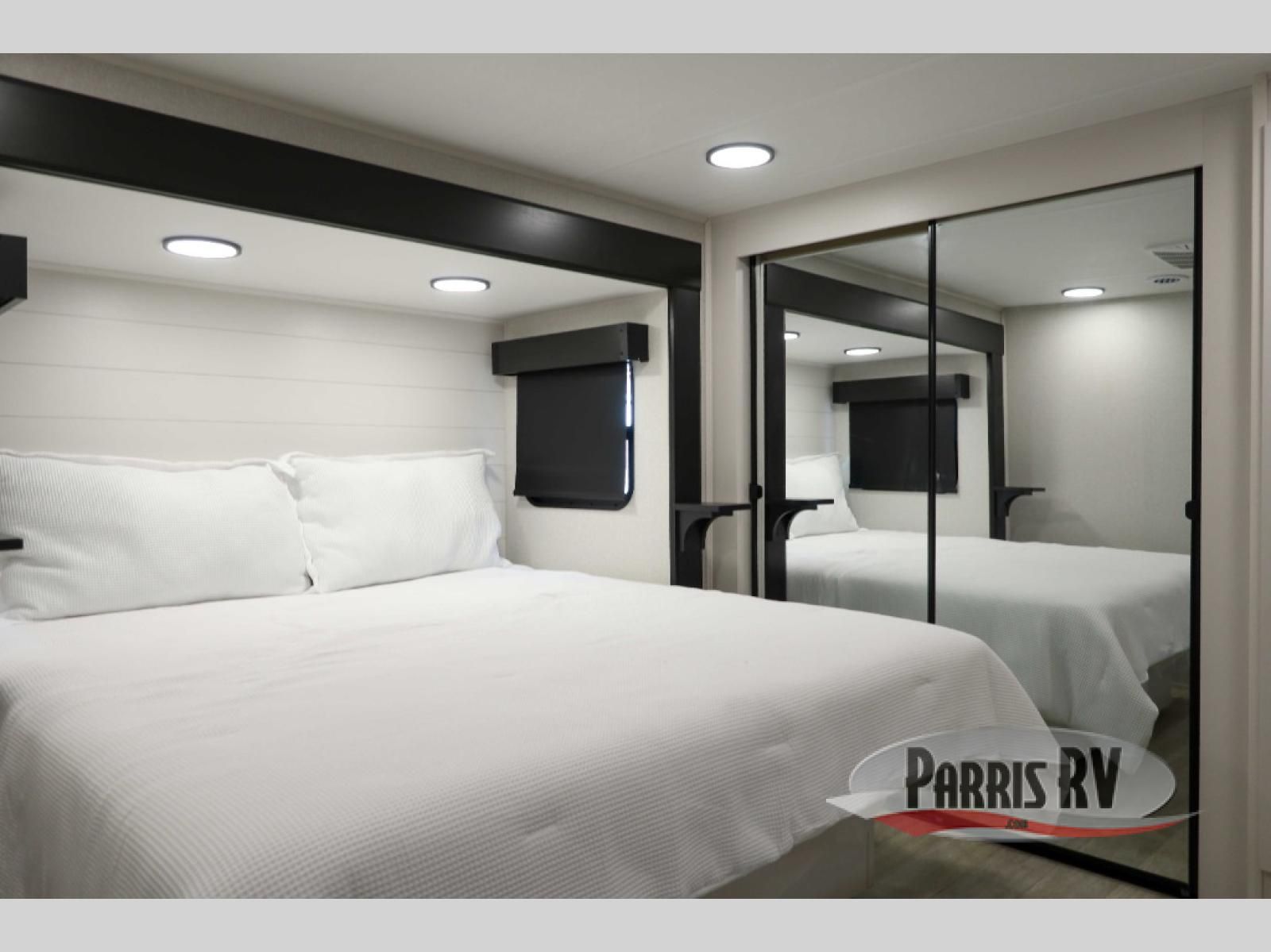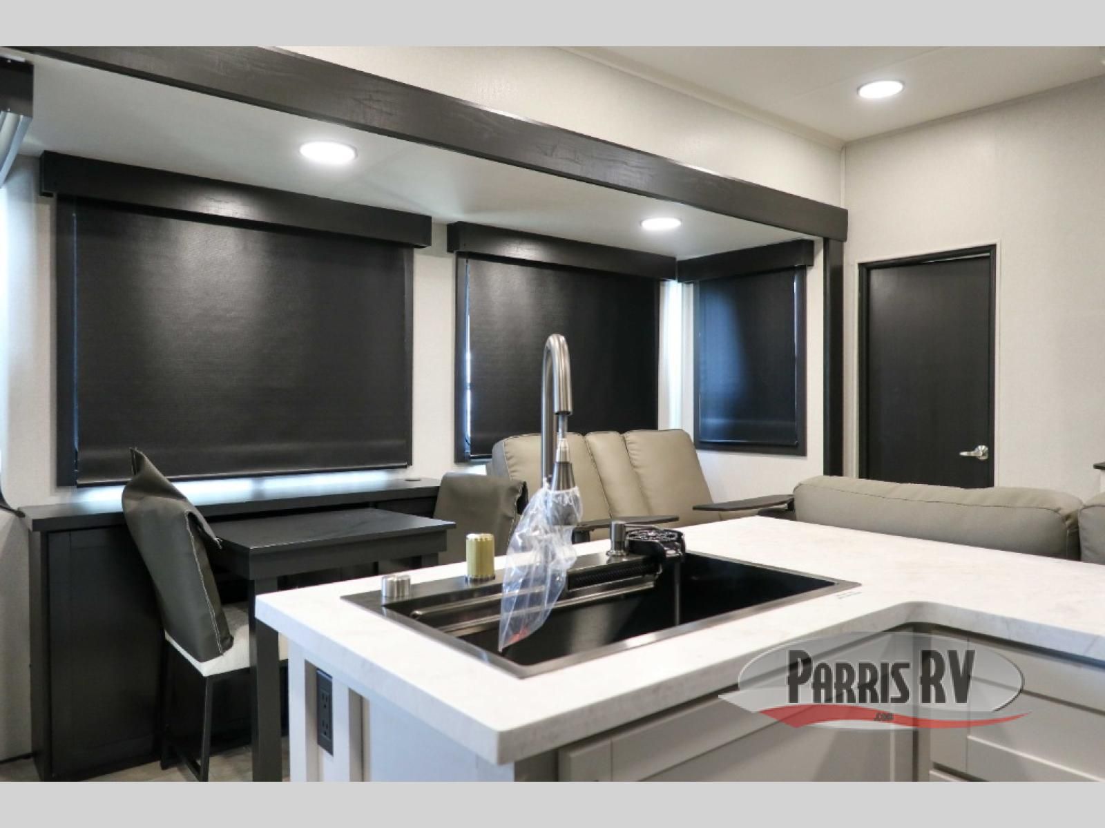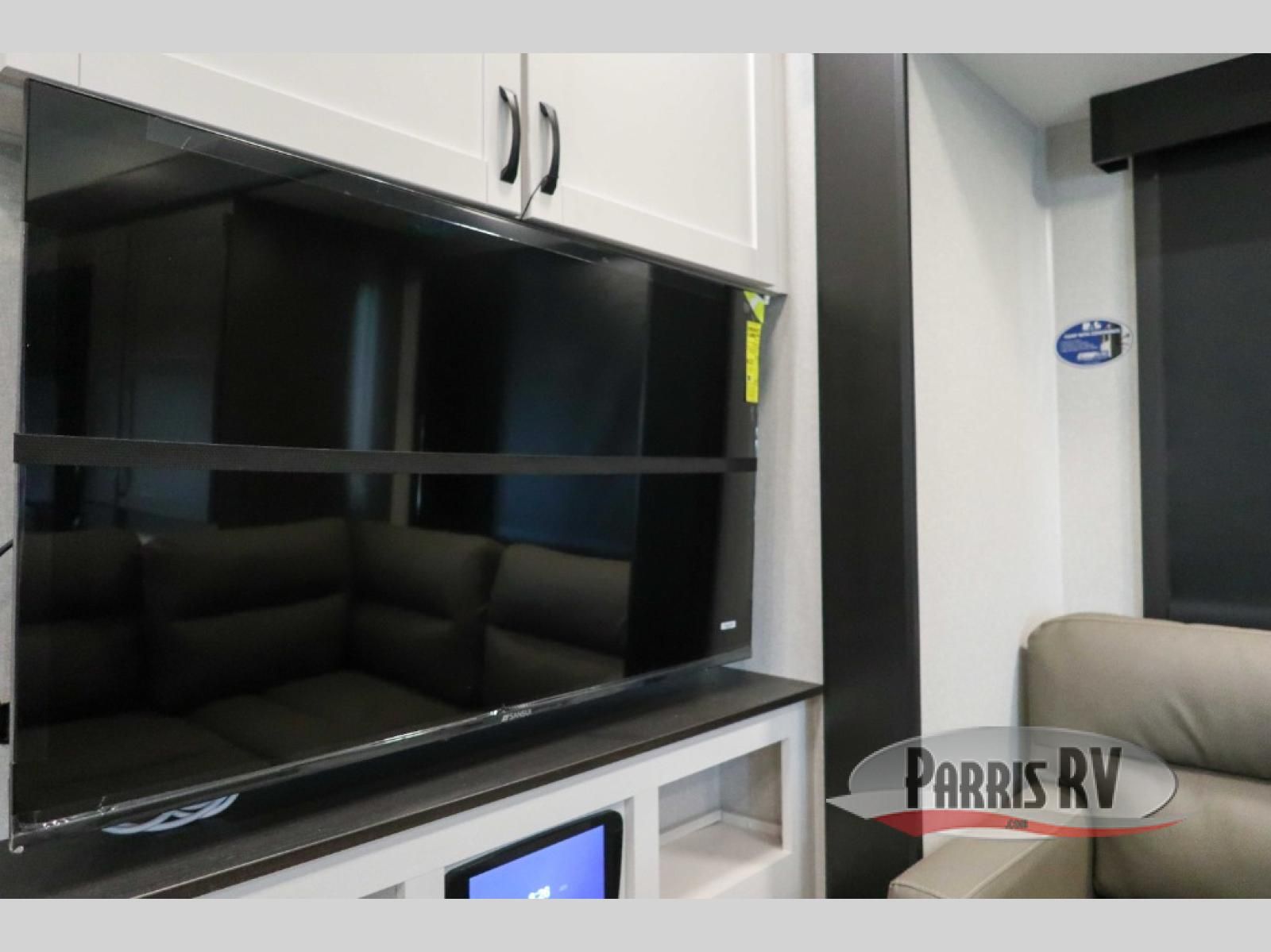 Get on the road with this toy hauler fifth wheel! The 14' garage is a playground for your toys, offering ample space for your ATV, motorcycle, or other gear. The loft above provides additional storage and an electric queen bed for a comfortable rest. The living room is a haven for relaxation, featuring an L-shaped sofa and a theater-style seat perfect for enjoying your favorite shows or movies on the TV. The kitchen is a culinary delight, equipped with a 12V refrigerator, microwave, overhead cabinets, and ample countertop space. The credenza with roll-out table is perfect for meal prep or serving, and the full bathroom provides a private space to freshen up, while the half bath option in the garage gives you more options. The cherry on top is that the front bedroom is a regal retreat, featuring a king bed, drawers, and a spacious walk-in closet.