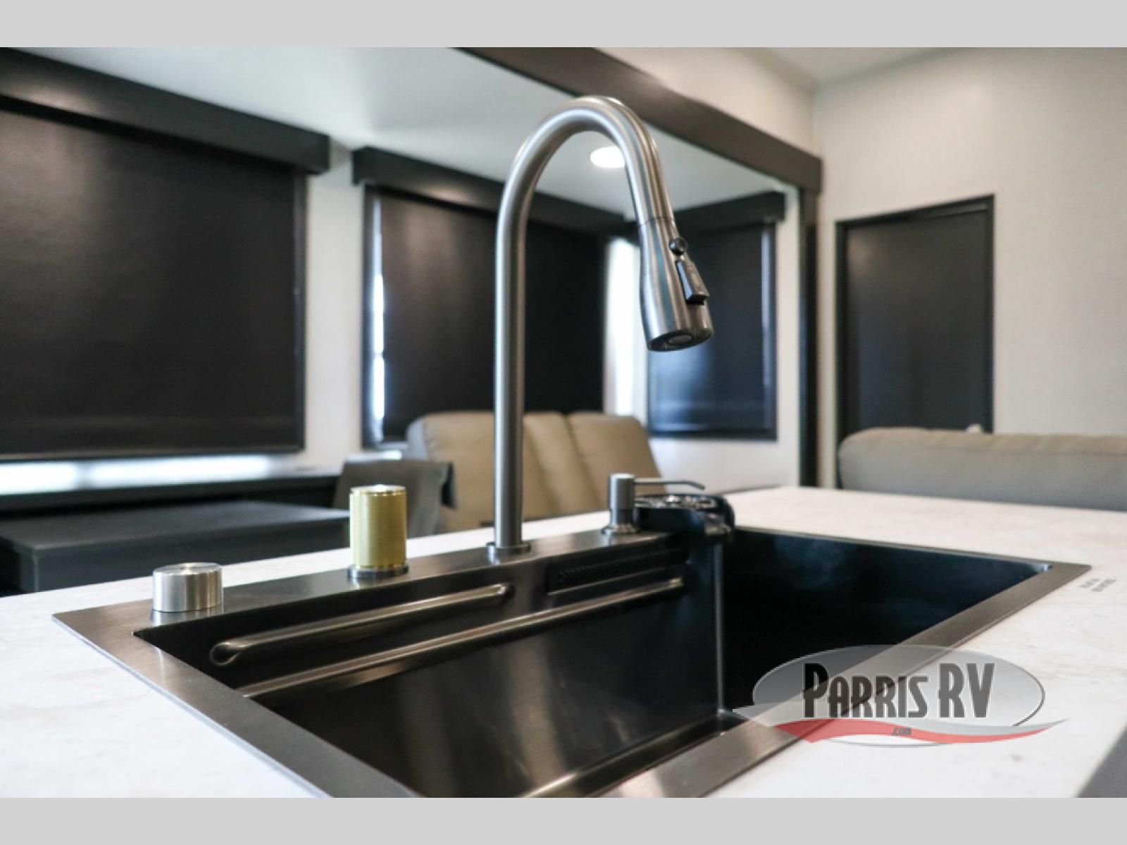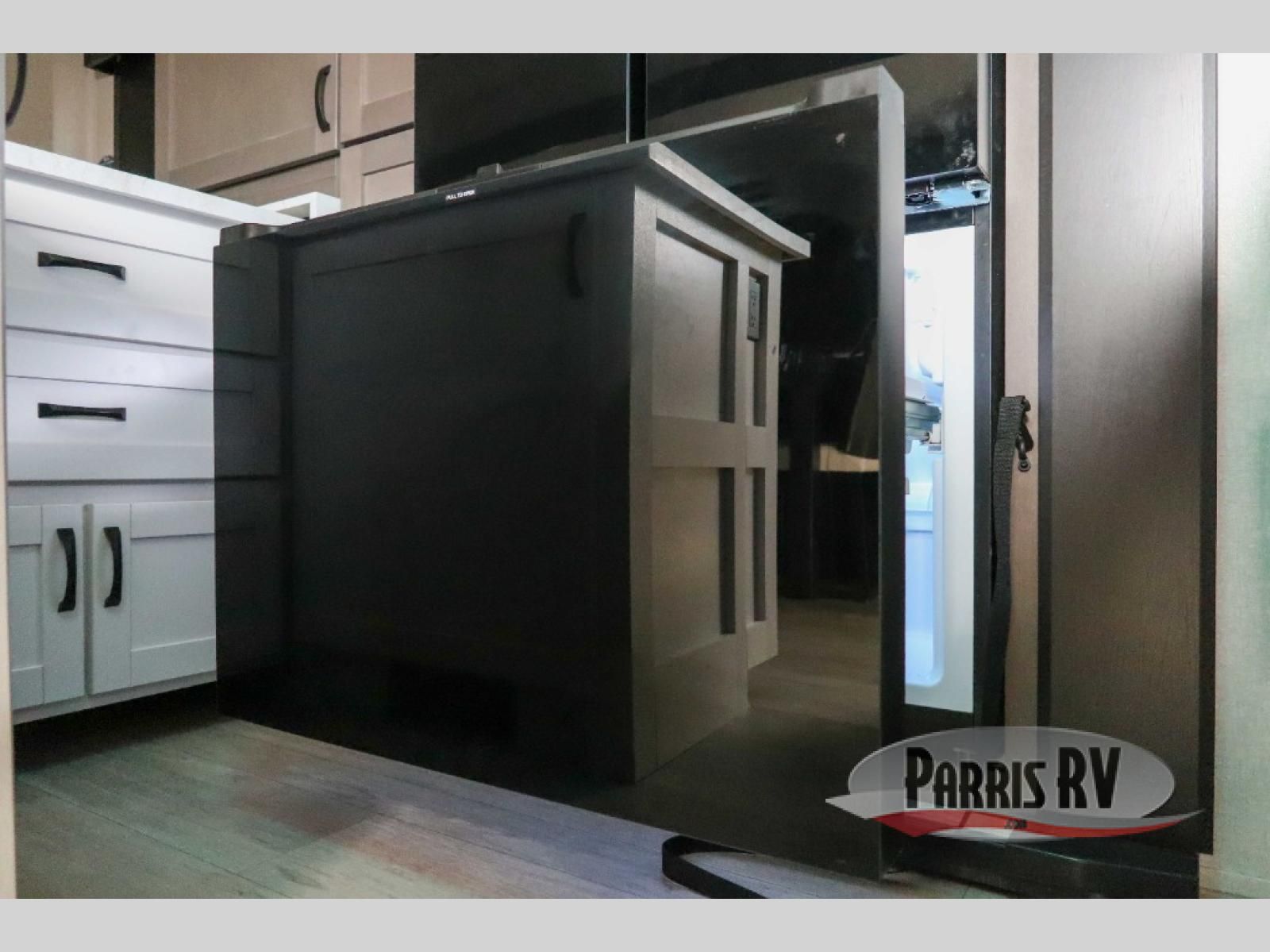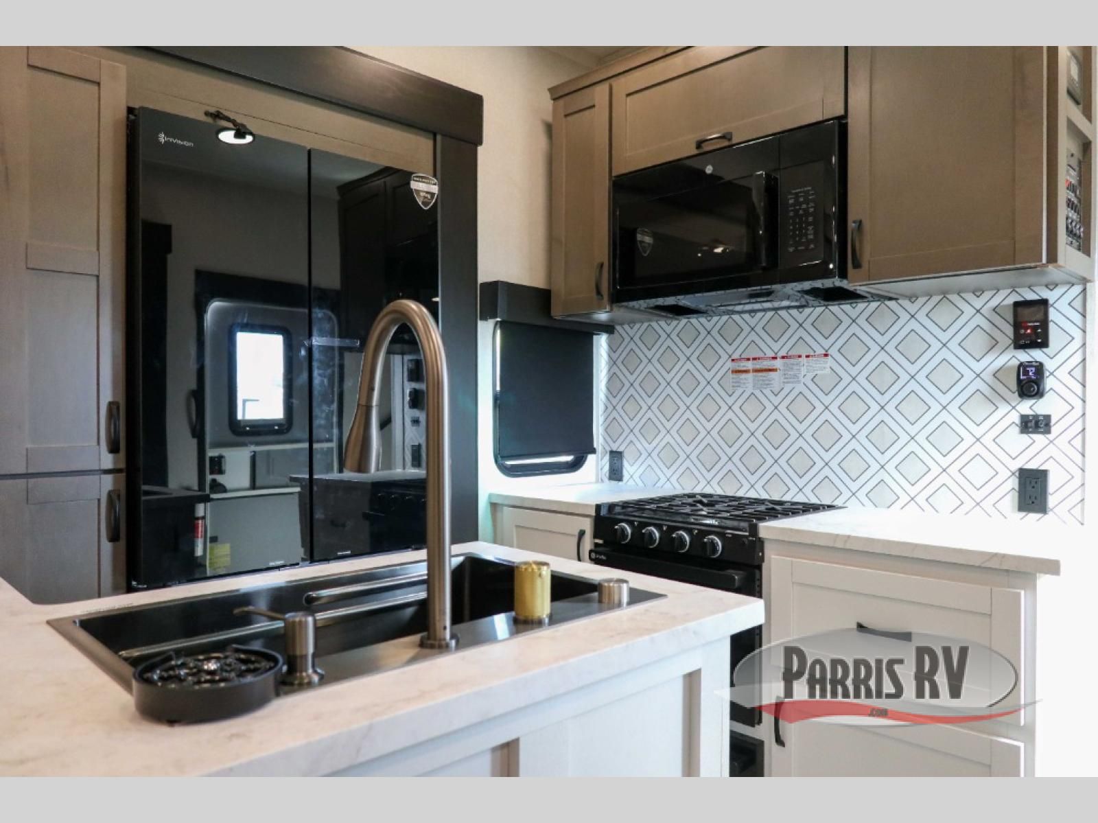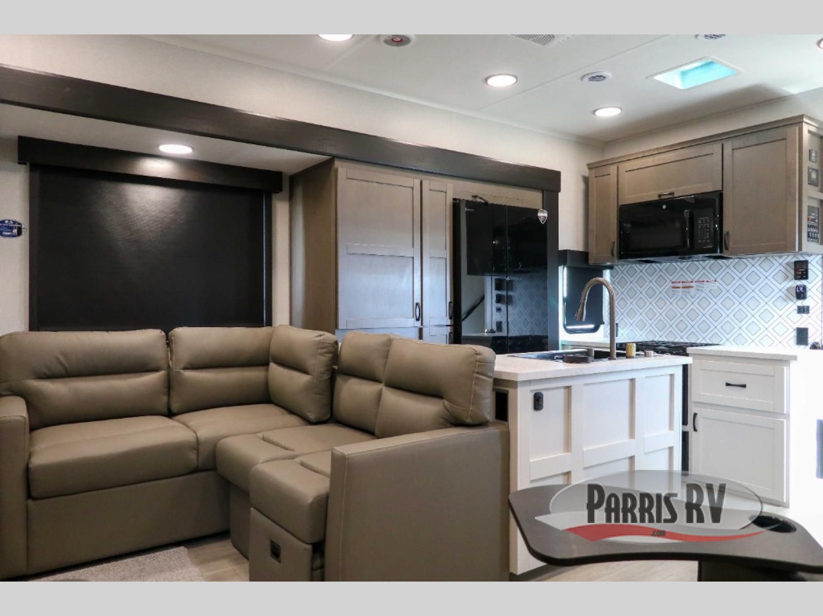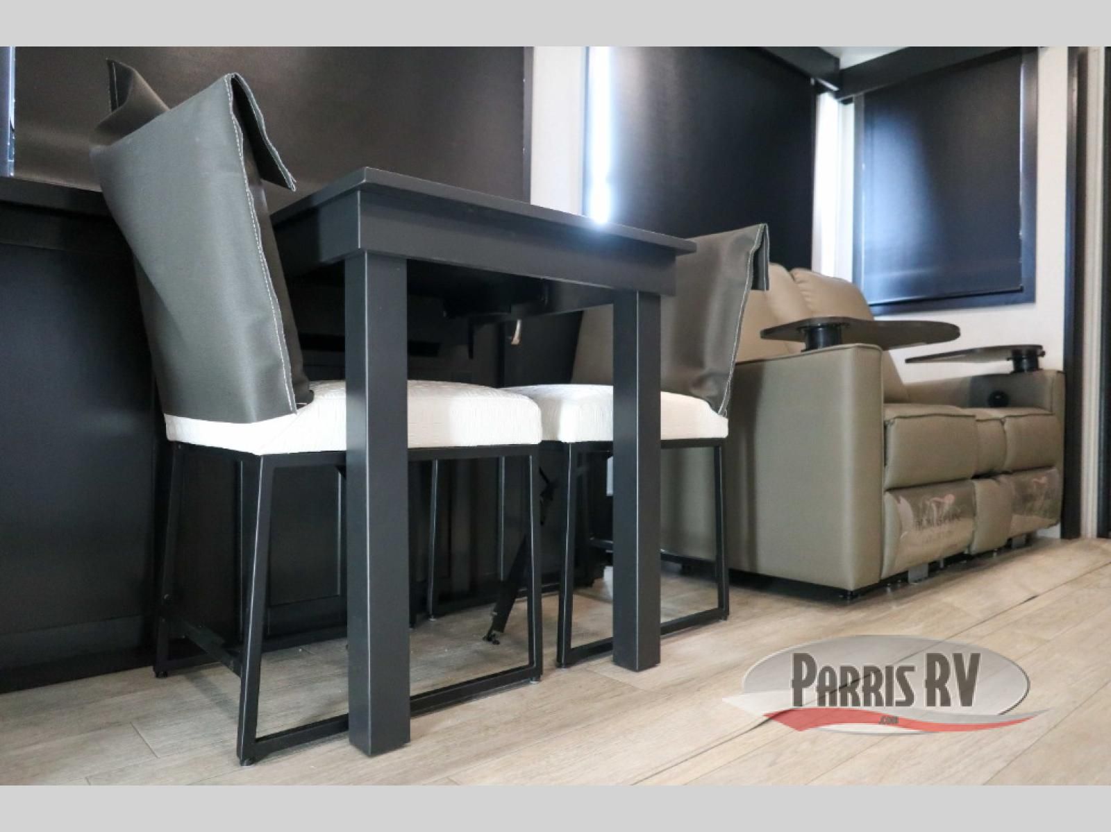 Get on the road with this toy hauler fifth wheel! The 14' garage is a playground for your toys, offering ample space for your ATV, motorcycle, or other gear. The loft above provides additional storage and an electric queen bed for a comfortable rest. The living room is a haven for relaxation, featuring an L-shaped sofa and a theater-style seat perfect for enjoying your favorite shows or movies on the TV. The kitchen is a culinary delight, equipped with a 12V refrigerator, microwave, overhead cabinets, and ample countertop space. The credenza with roll-out table is perfect for meal prep or serving, and the full bathroom provides a private space to freshen up, while the half bath option in the garage gives you more options. The cherry on top is that the front bedroom is a regal retreat, featuring a king bed, drawers, and a spacious walk-in closet.