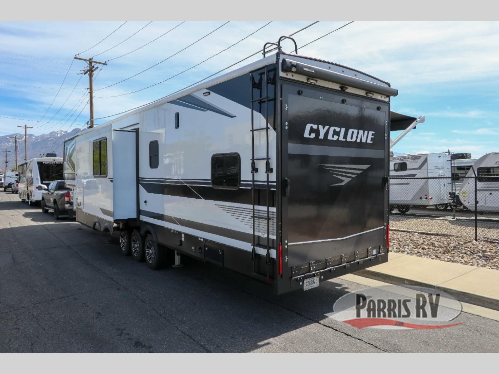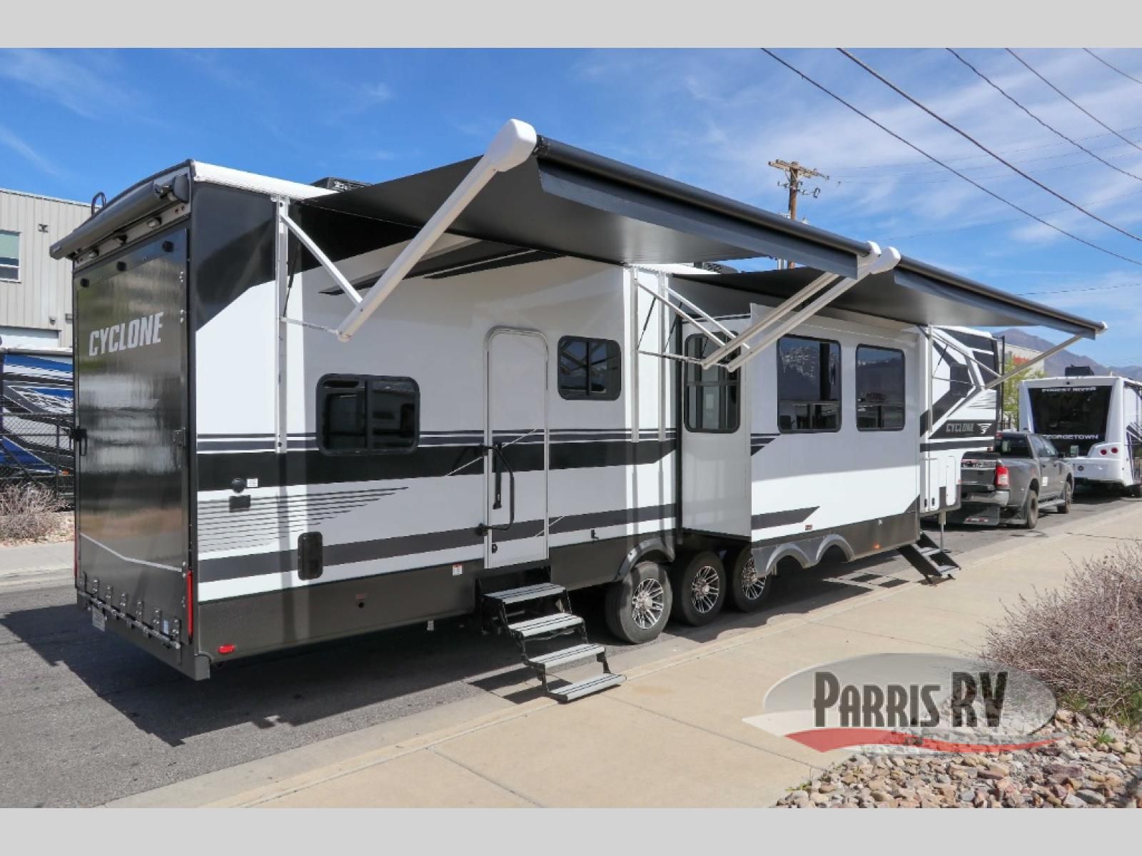 Satisfy your wanderlust with a Heartland Cyclone fifth wheel toy hauler! You won't have to sacrifice any luxury either, with indulgent features like the ducted, fully enclosed, and heated underbelly provides added protection and warmth. Inside, the LED interior lighting throughout ensures that every corner of your RV is bright and inviting, and the bathroom skylight brings in natural light and fresh air, creating a welcoming and refreshing space. Plus, the central command center with built-in tank monitoring keeps you informed and in control, making it easy to manage your resources. Also, the camping in comfort package includes diverse features such as Dexter axles with ABS and tow assist with sway mitigation, and the Keyed-Alike lock system ensures that all your locks are keyed the same, providing added security and convenience. Come find the perfect model for you today!