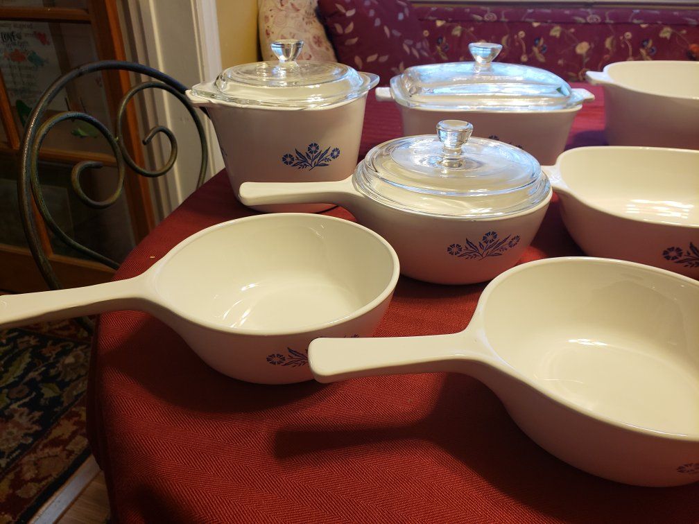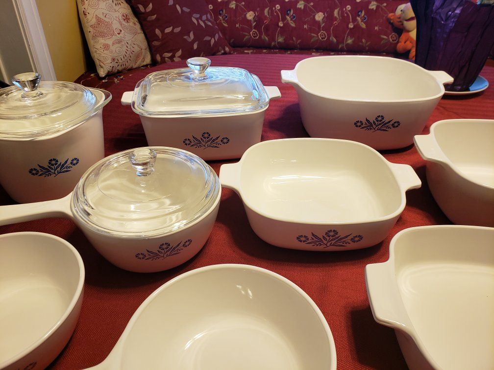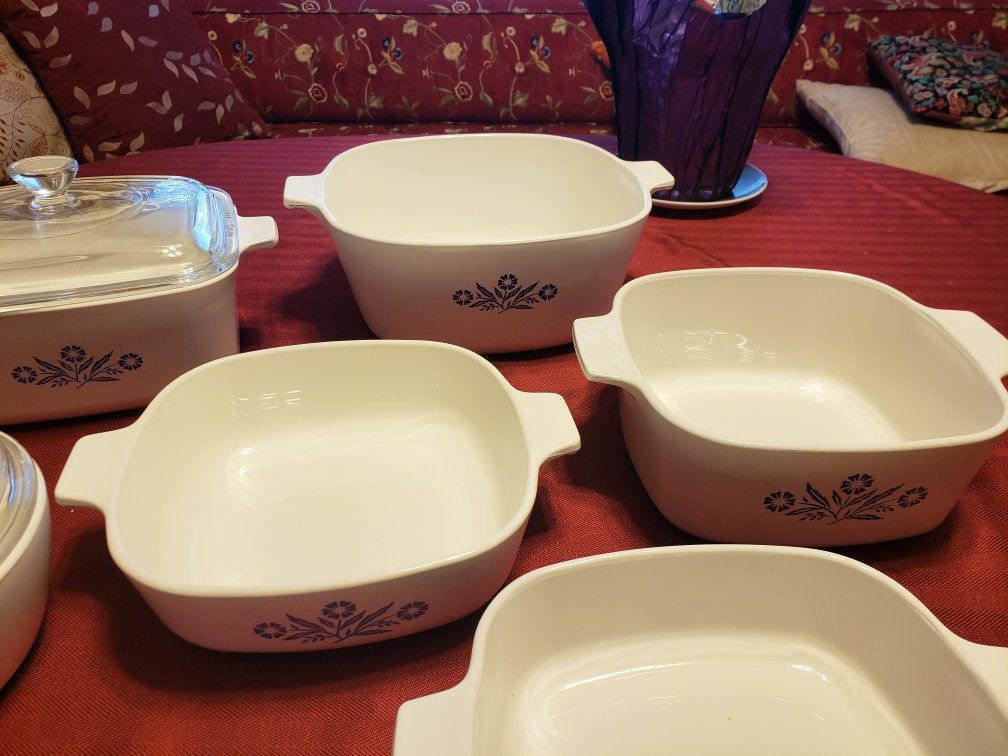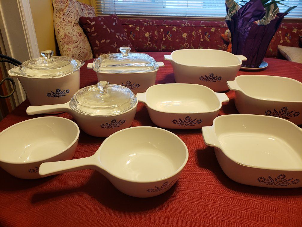 9 dishes and 3 lids! Blue cornflower design.