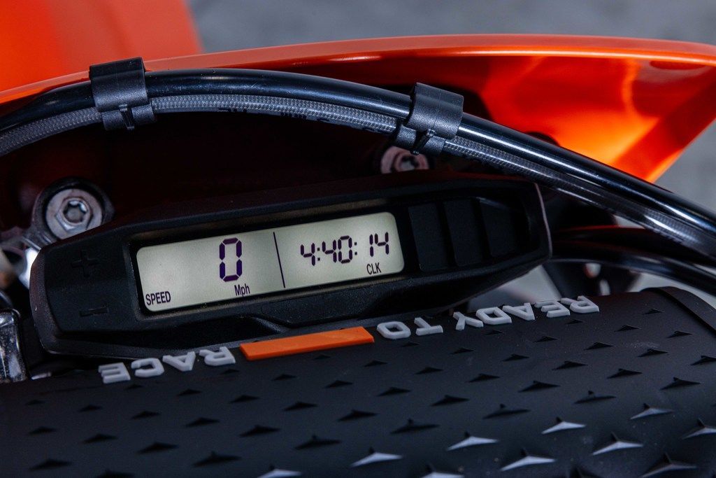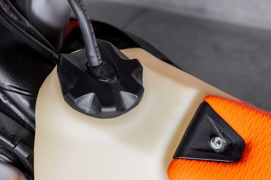 An all-new Offroad Control Unit - or OCU - under the seat replaces all the electronic fuses and relays. All outputs are switched depending on signals from the voltage regulator and the ECU continuously. In the event of over-current, outputs are deactivated individually. This makes for easy error detection as the status of each output is indicated by a red or green LED light. This means diagnosing an electrical issue out on the trail is as easy as lifting the seat, and there's no more need to carry fiddly fuses.