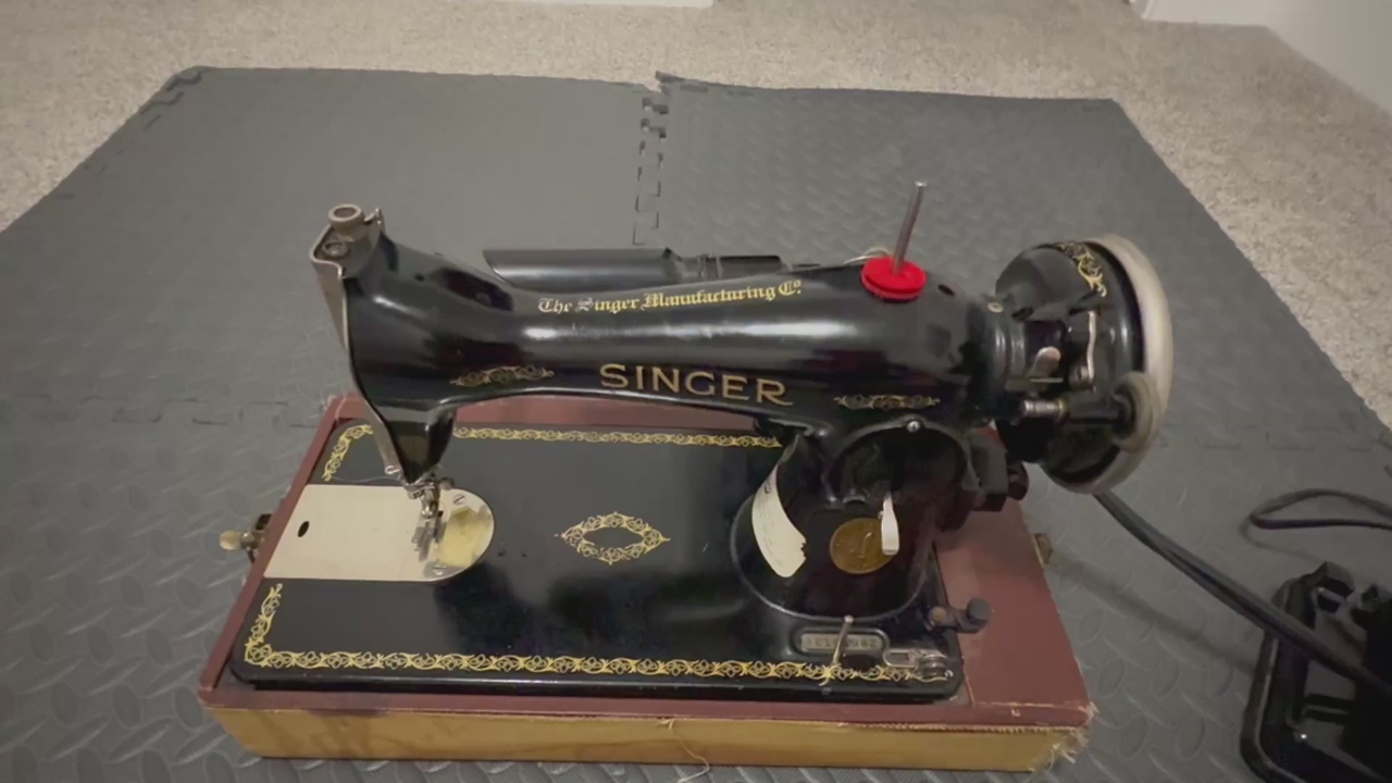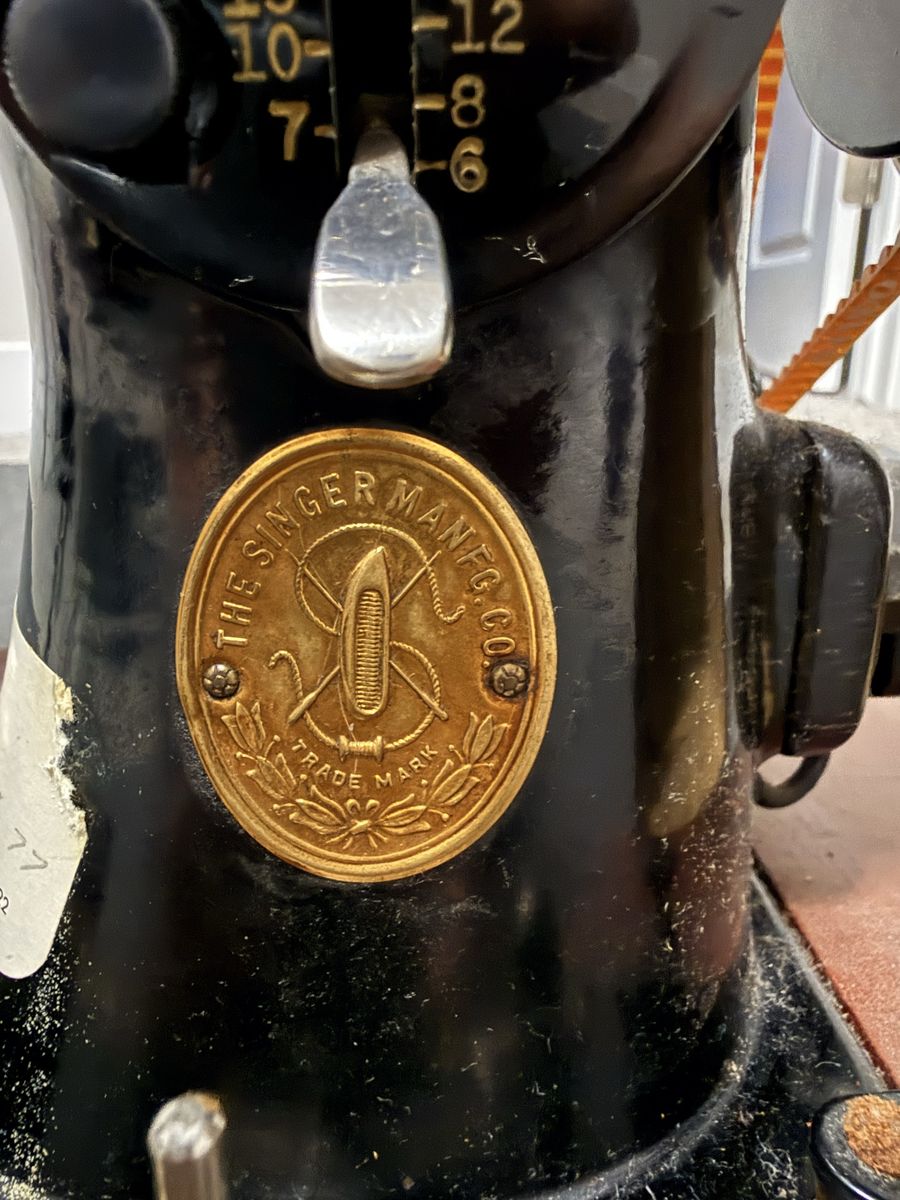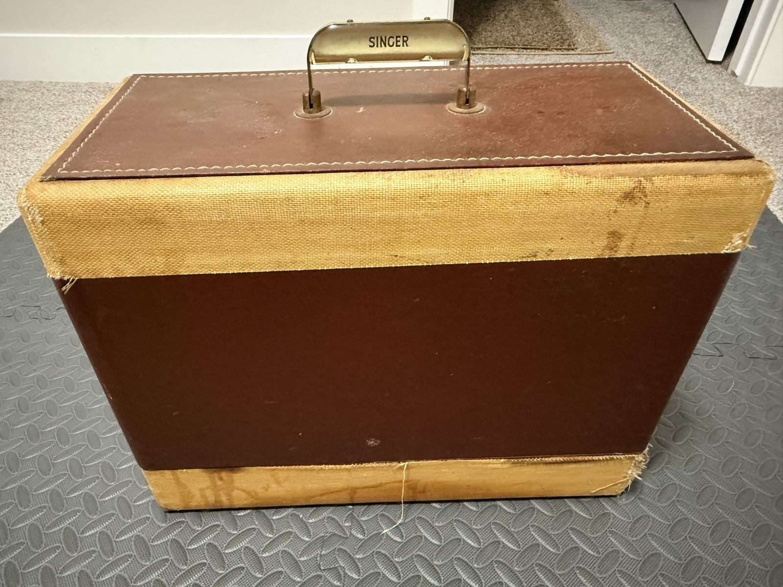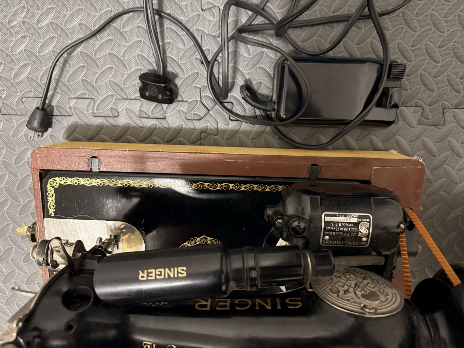 VenmoClassic black Singer sewing machine has gold filigree decals and original wooden base. This electric model includes the attached motor, foot pedal, and power cords. It comes with a hard-shell carrying case that has a brass-tone handle. Machine is heavy-duty metal construction with a gold-tone Singer trade mark badge.
