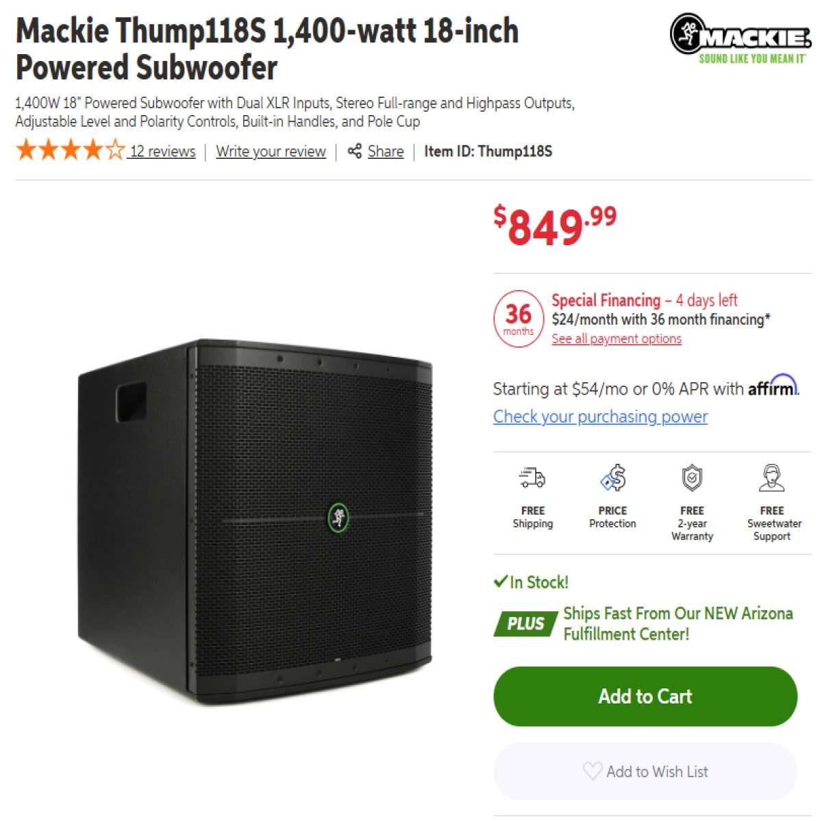 Elevate your sound system with the Mackie Thump118S 1,400-watt 18-inch Powered Subwoofer. Engineered for powerful, punchy bass, the Thump118S is ideal for DJs, live performers, and venues seeking deep, rich low-end enhancement. Its robust 1,400-watt Class D amplifier delivers tight, responsive bass ideal for professional PA and DJ setups. The 18-inch high-performance woofer ensures clarity and depth, while built-in stereo XLR inputs and outputs offer versatile connections for seamless integration with any sound system. Featuring three selectable crossover presets, the Thump118S adapts easily to different setups and room sizes. A rugged front grille and sturdy enclosure protect the subwoofer during transport and touring. The compact yet highly durable design simplifies setup and mobility, making it perfect for events on the go. Experience deep bass, reliable performance, and true flexibility—choose the Mackie Thump118S for the best in live audio. Buy now to transform your event’s sound with industry-leading low-frequency power!