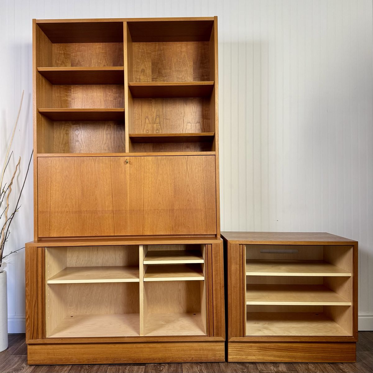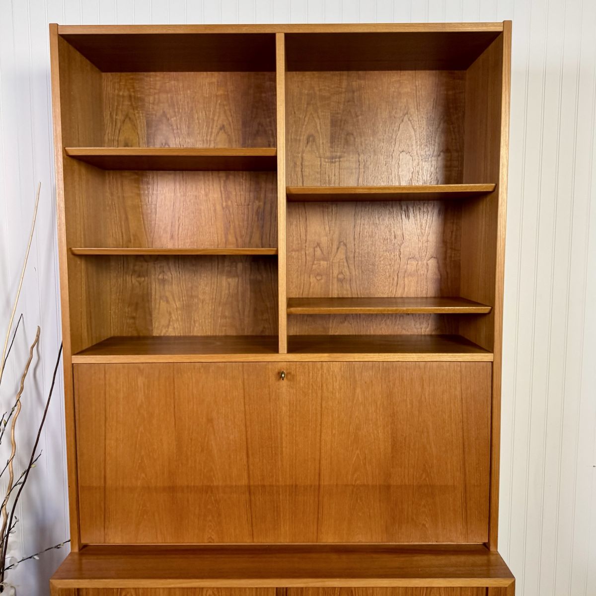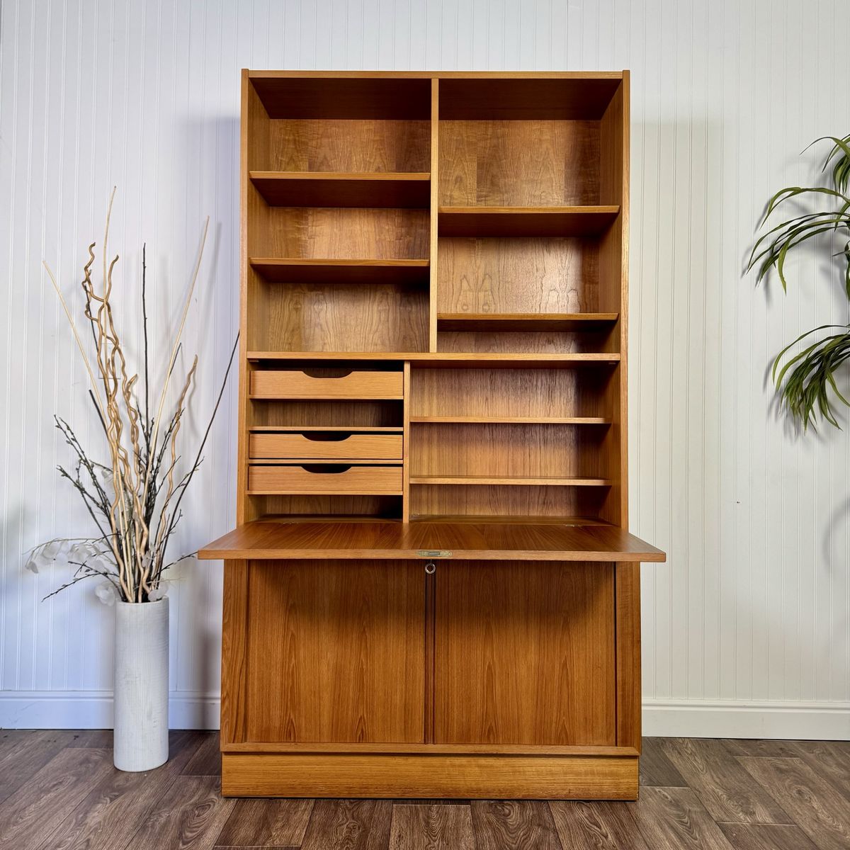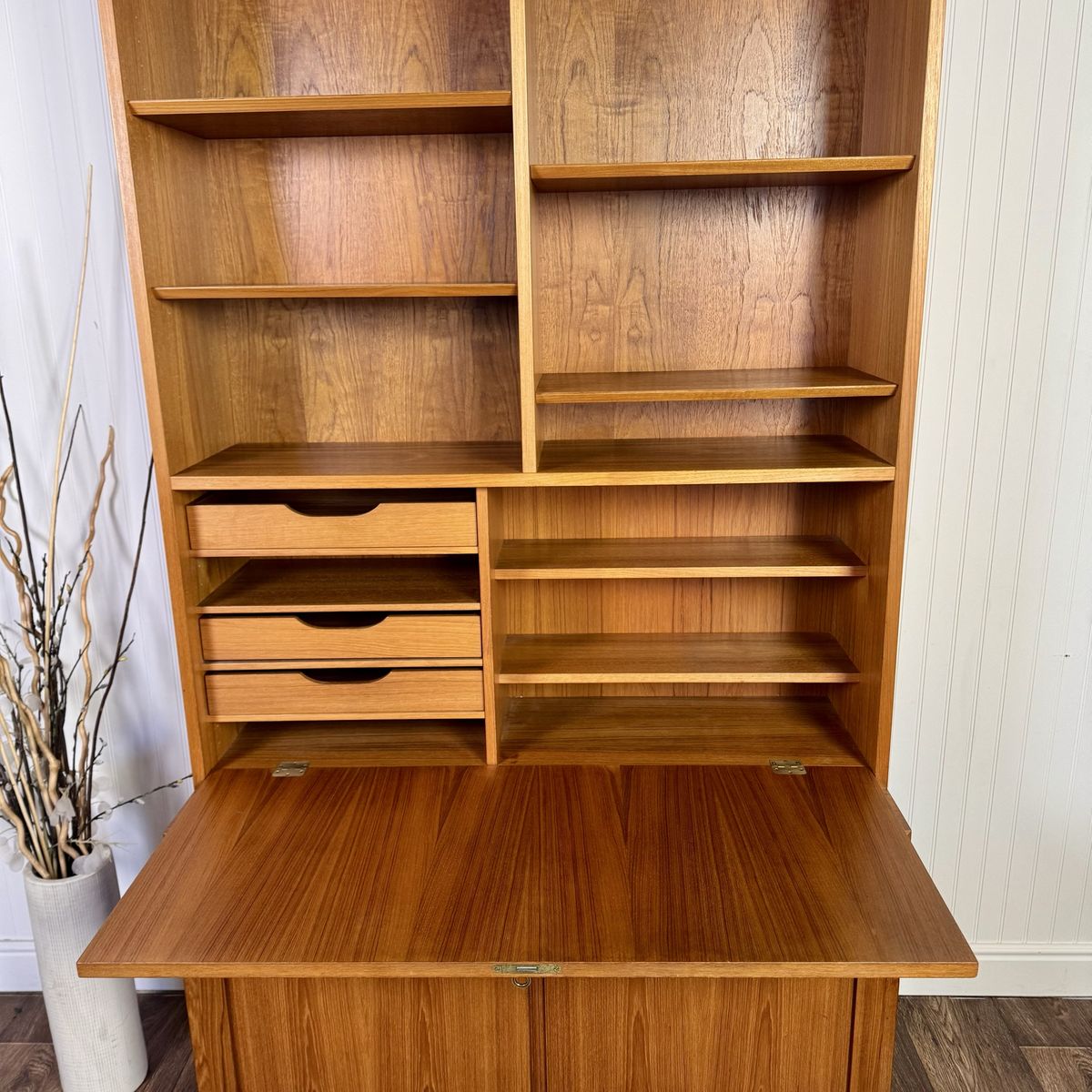 VenmoAuthentic vintage Danish modern teak secretary wall unit by Hundevad, made in Denmark. This modular system combines clean Scandinavian design with highly functional storage, featuring a drop-front writing desk, adjustable shelving, and lower cabinet storage.