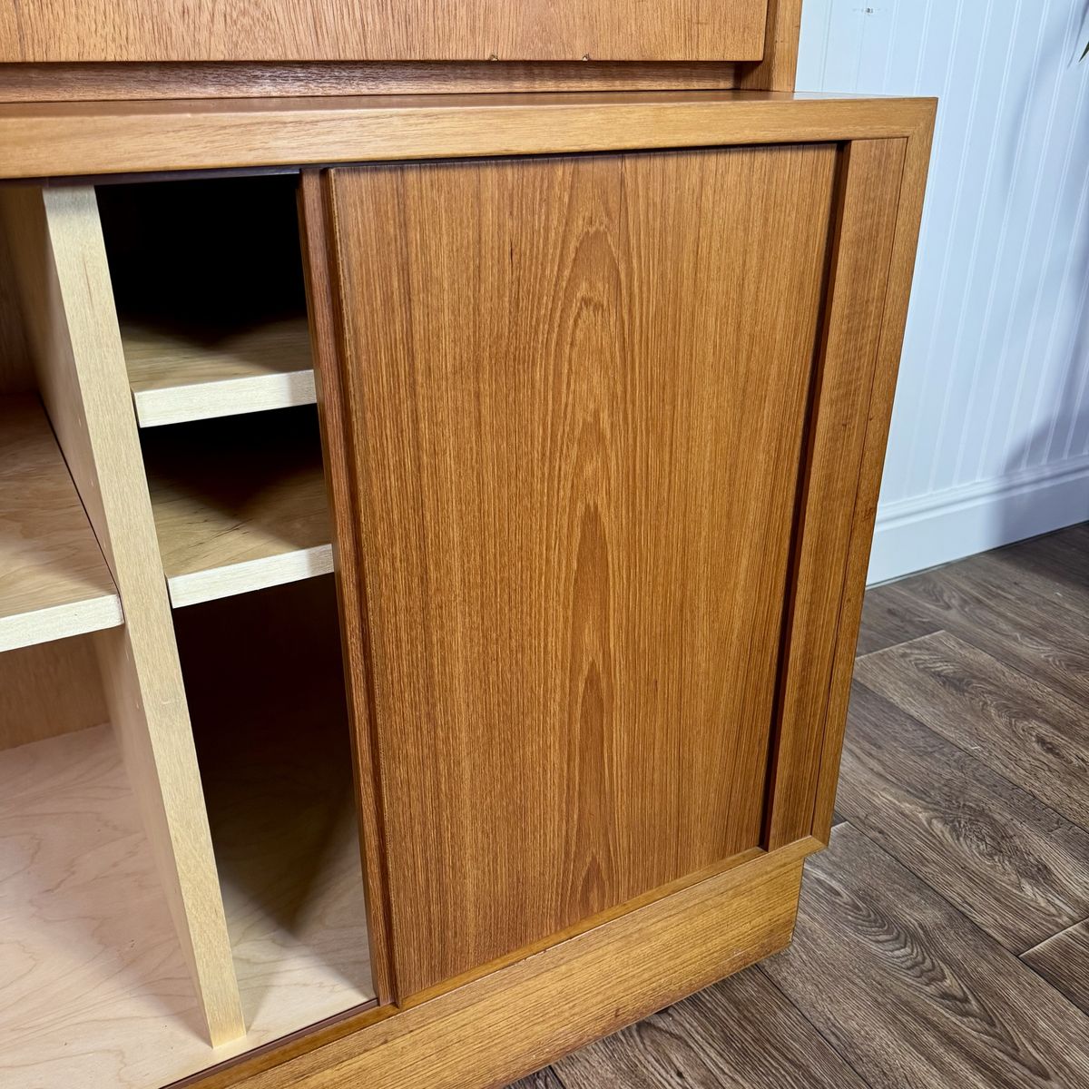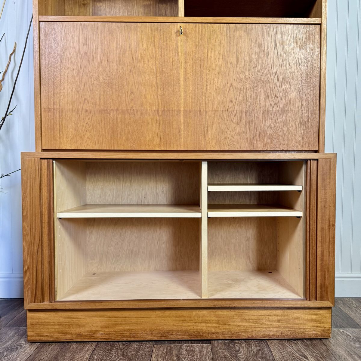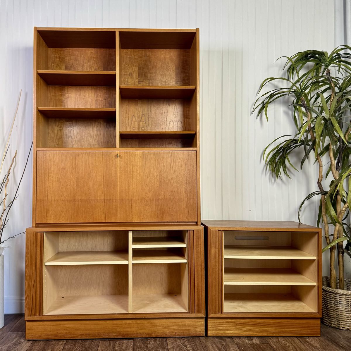 VenmoAuthentic vintage Danish modern teak secretary wall unit by Hundevad, made in Denmark. This modular system combines clean Scandinavian design with highly functional storage, featuring a drop-front writing desk, adjustable shelving, and lower cabinet storage.