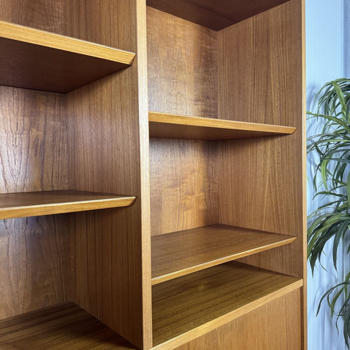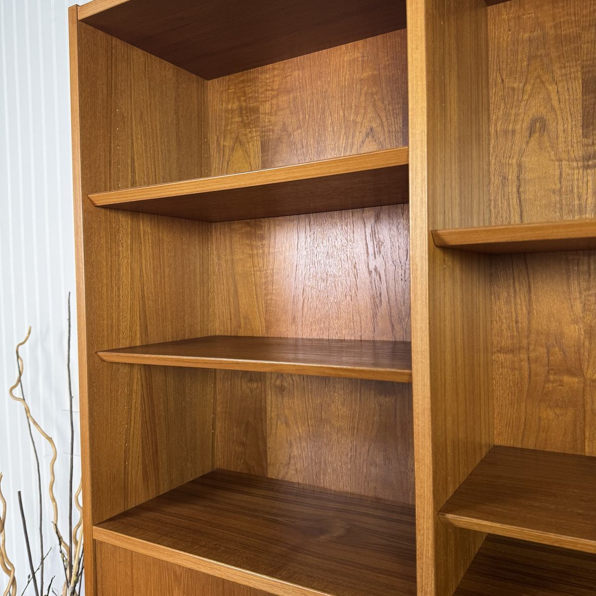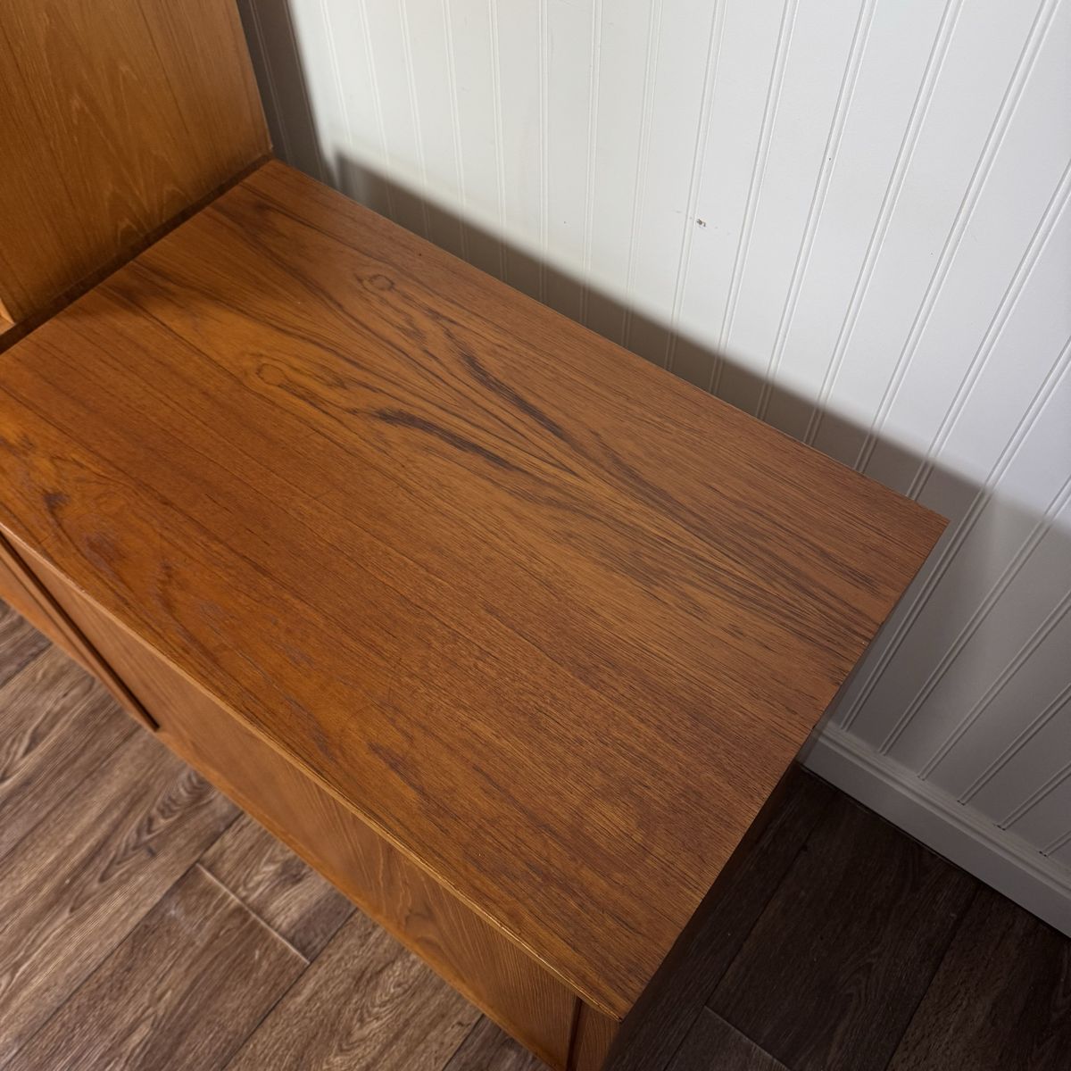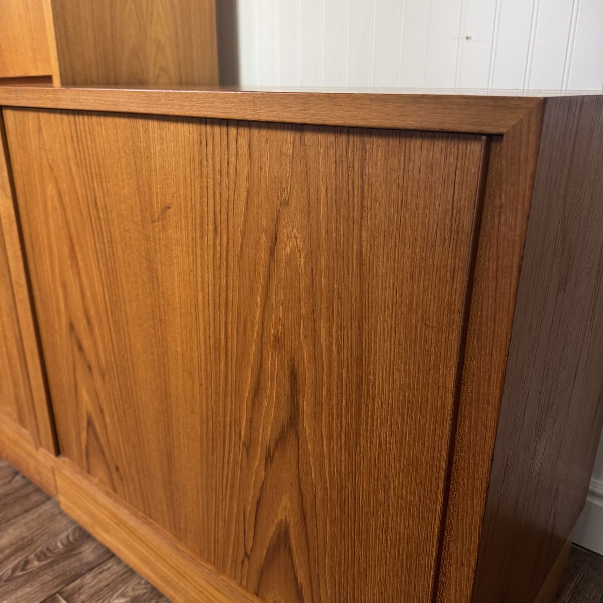 VenmoAuthentic vintage Danish modern teak secretary wall unit by Hundevad, made in Denmark. This modular system combines clean Scandinavian design with highly functional storage, featuring a drop-front writing desk, adjustable shelving, and lower cabinet storage.