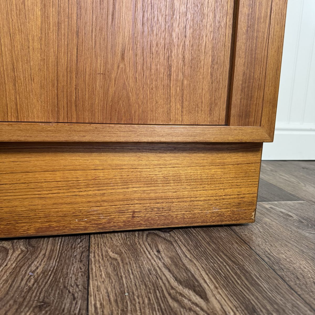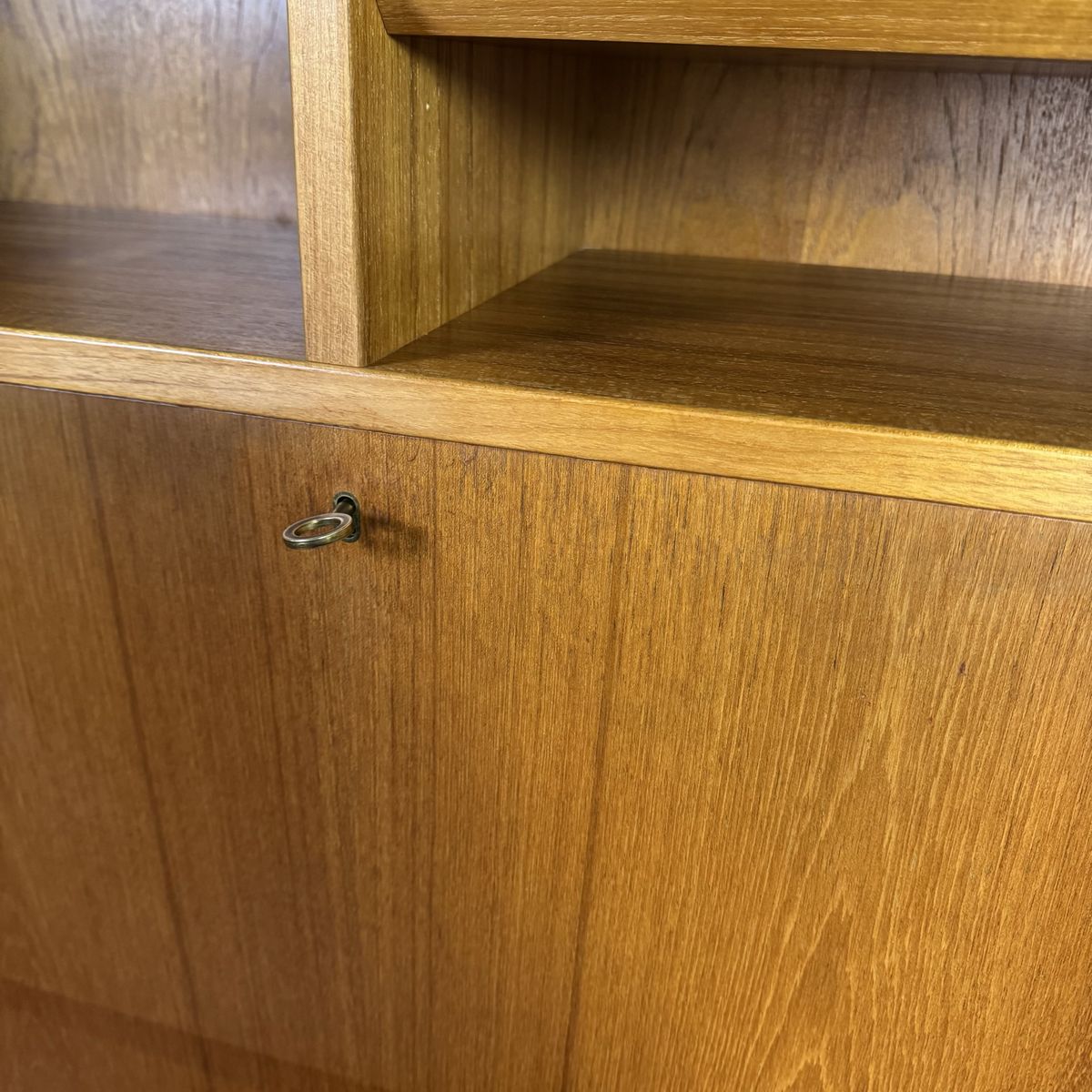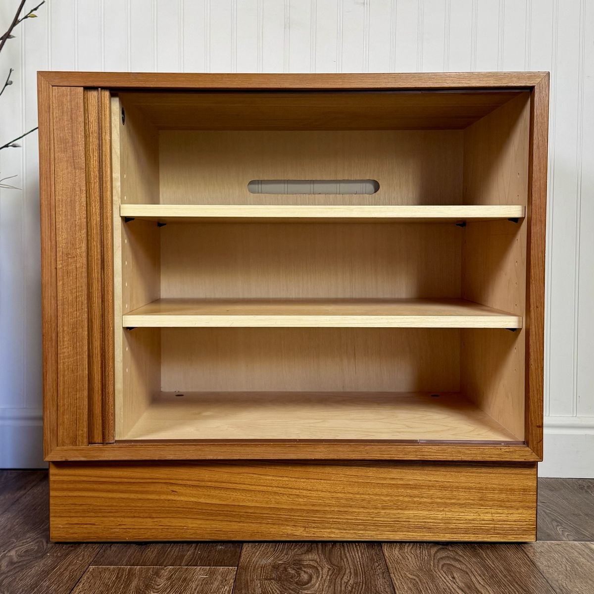 The desk opens to reveal multiple interior drawers and workspace storage, while the modular base units can be used together or separately depending on your space. Clean-lined sliding teak doors set in recessed tracks—allowing for a streamlined look without the need for swing clearance.