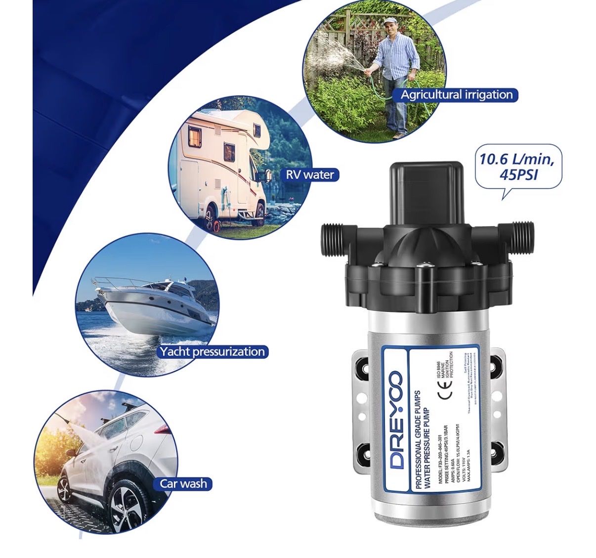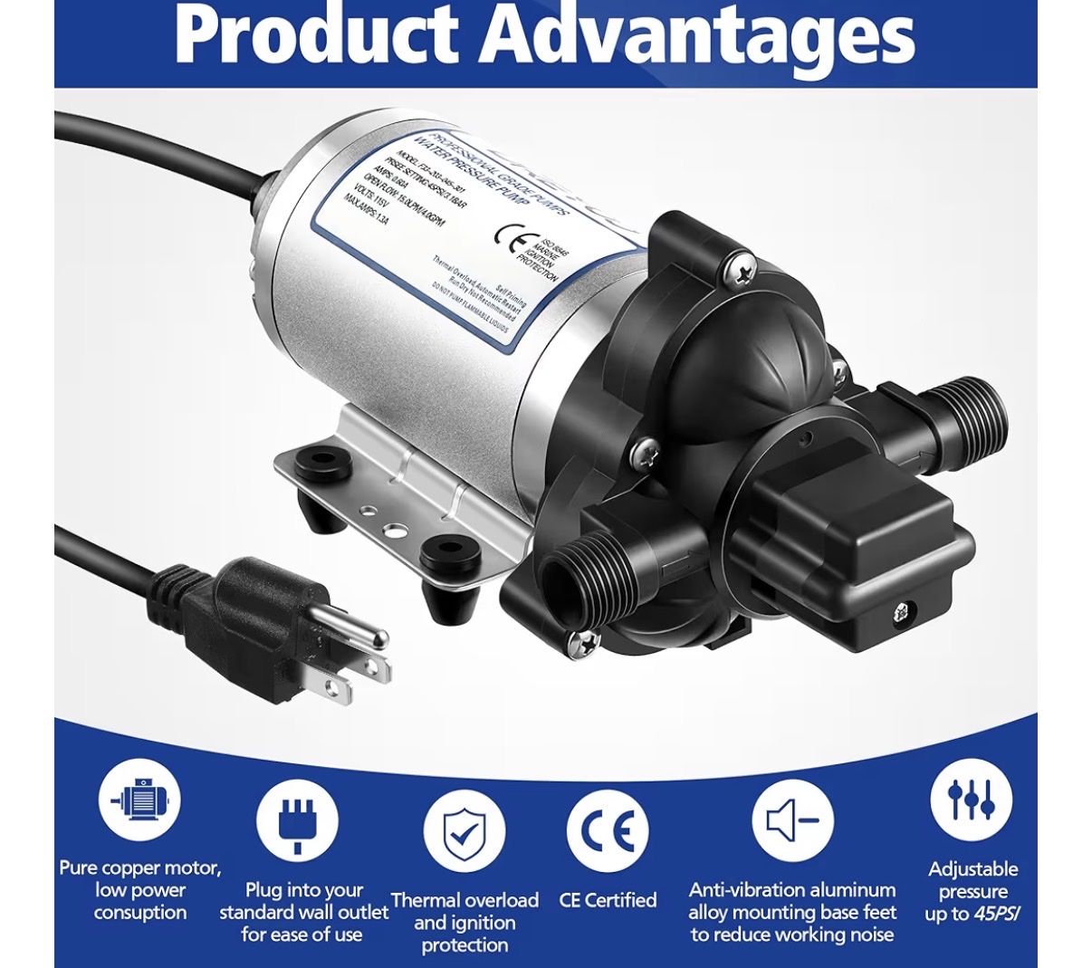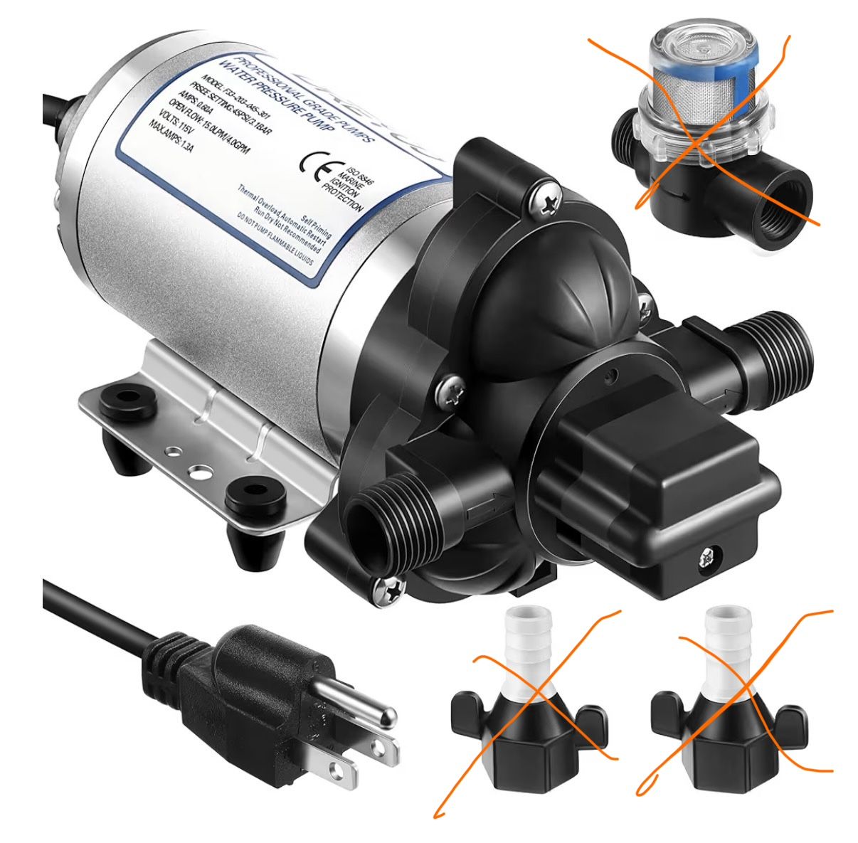 Water Pressure Diaphragm Pump Industrial 115V 4 GPM 45 PSI, Self Priming Water Booster Pump with Power Plug for Bathroom RV Marine Caravan, Food Truck,