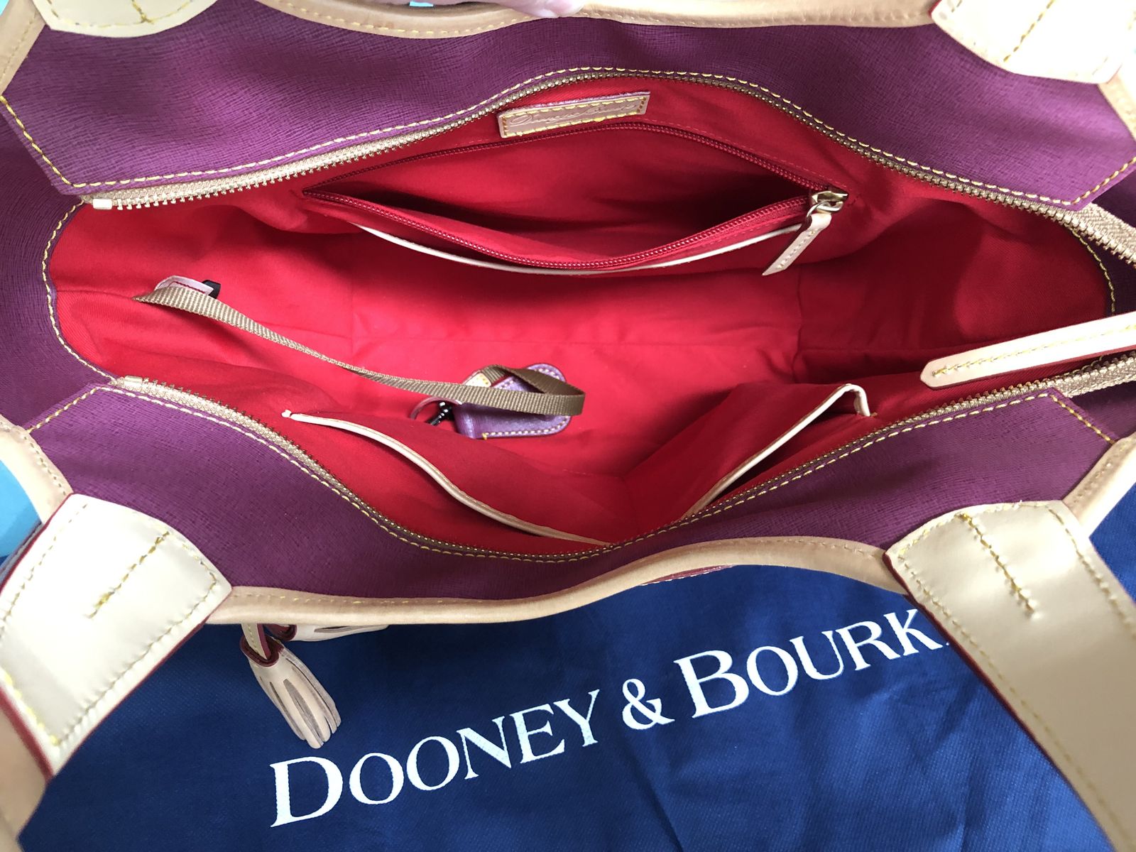 Lined interior, front-wall zip pocket and slip pocket, two back-wall slip pockets, key hook