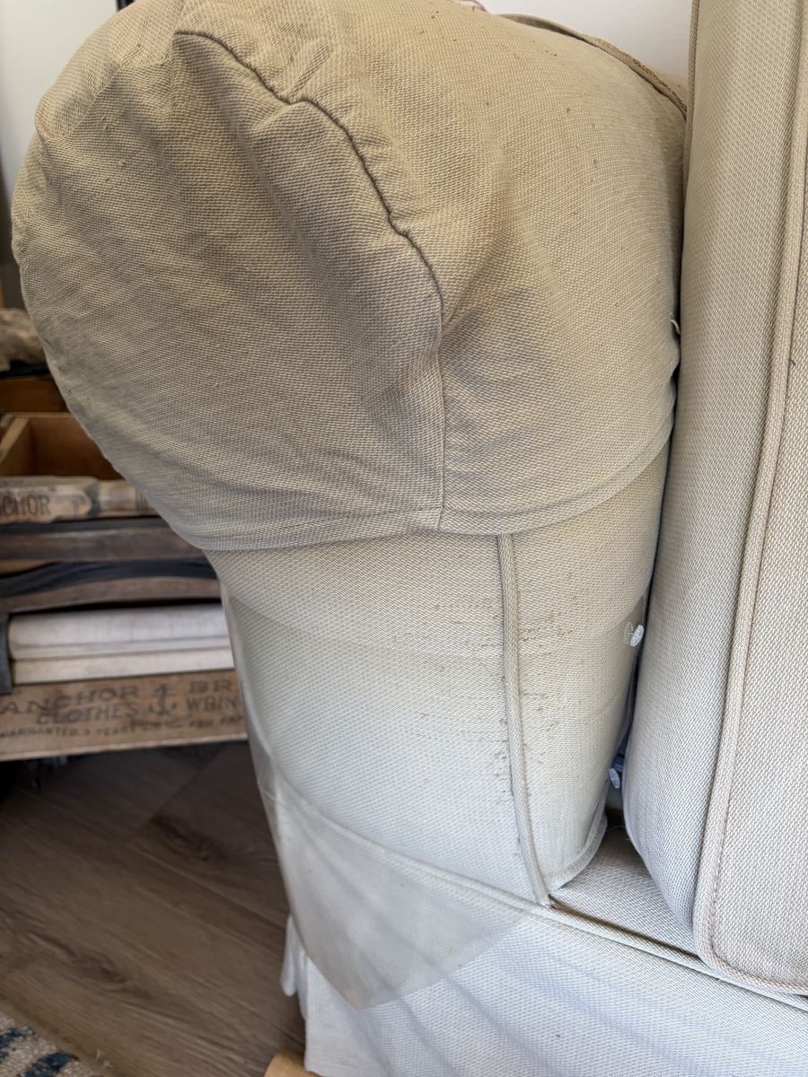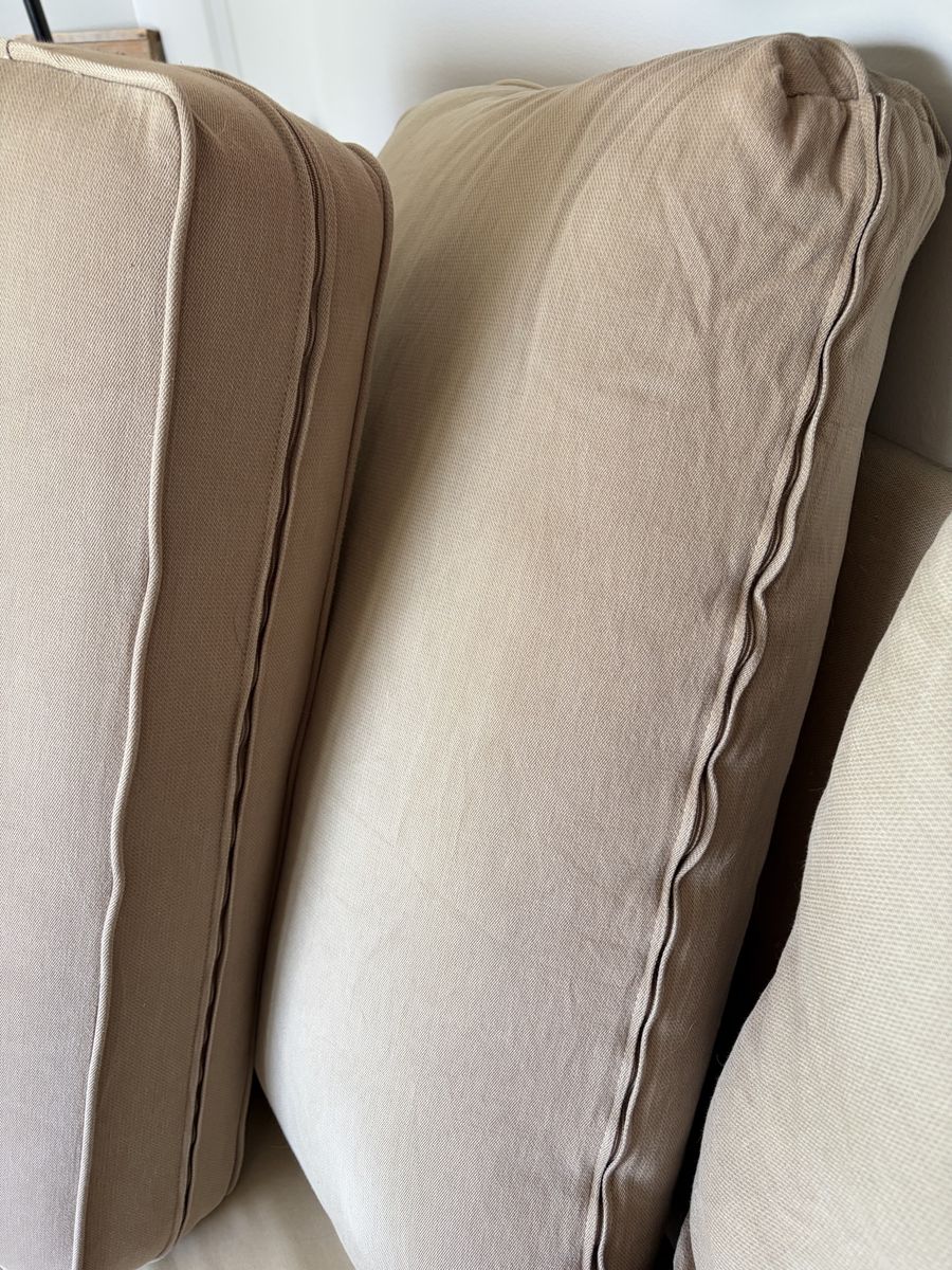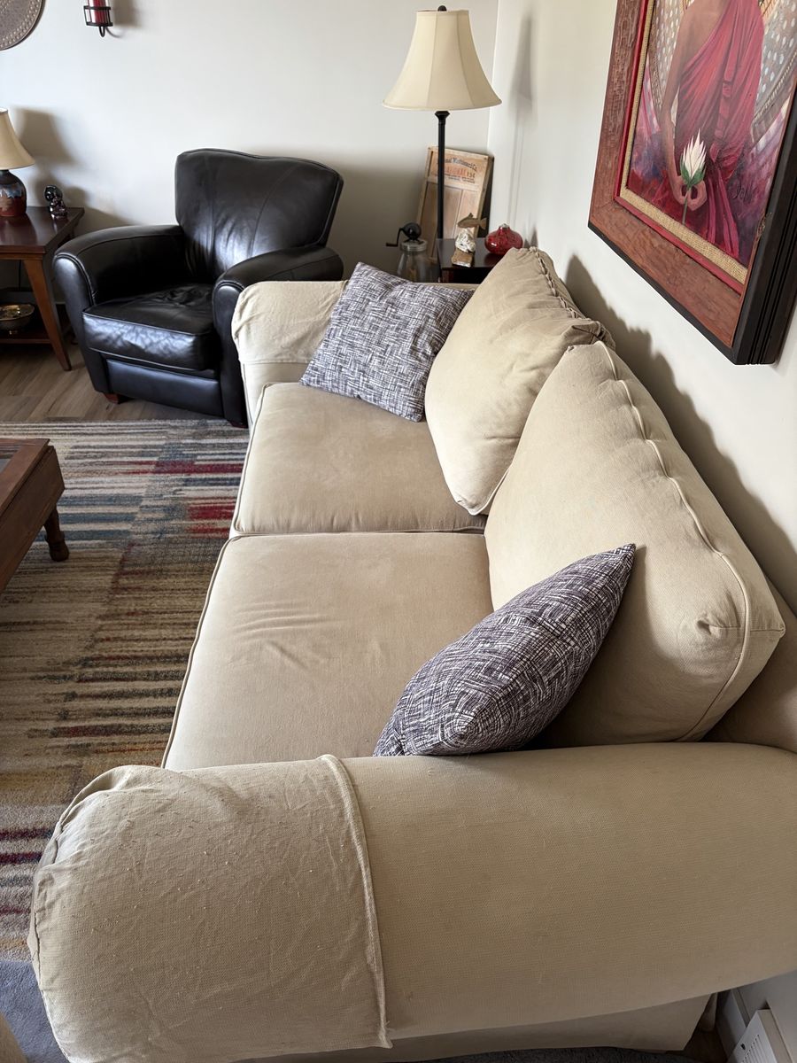 Venmo86 inch long deep seated beige couch. comfortable and cushions still have support. all 4 cushions zip off so can be washed. some fading and minor cat scratches. you will need a truck and some people to move it