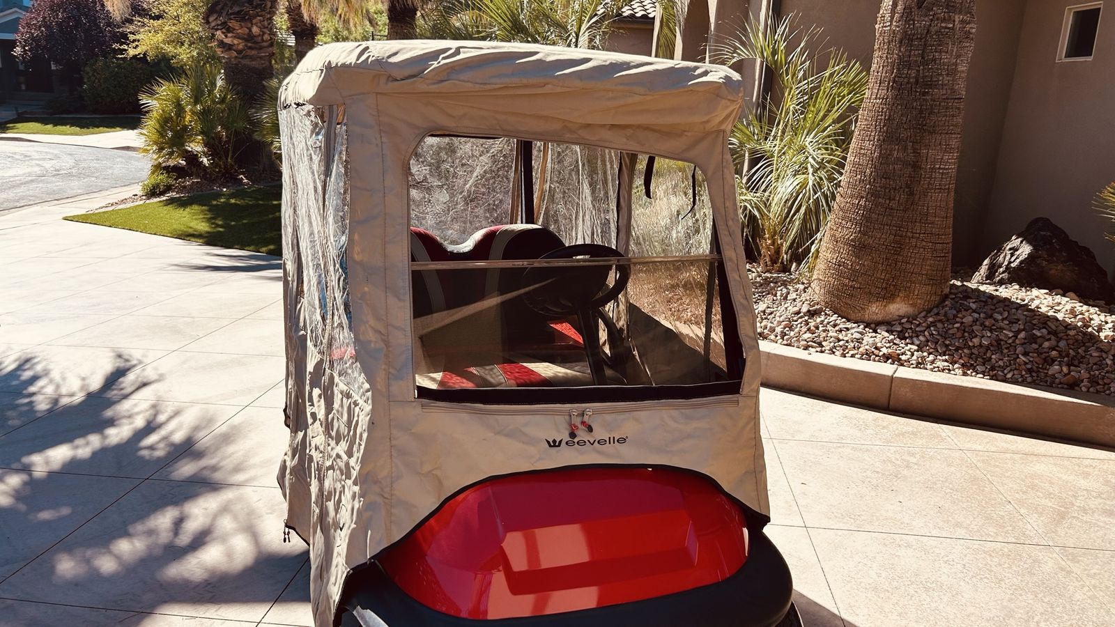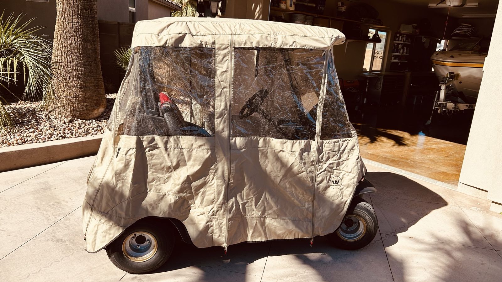 Evelle Green Line waterproof Golf Cart enclosure. It will fit from 2008 to 2018 car precedent. Other than being wrinkled from being stored in its carrying bag it is an excellent shape.