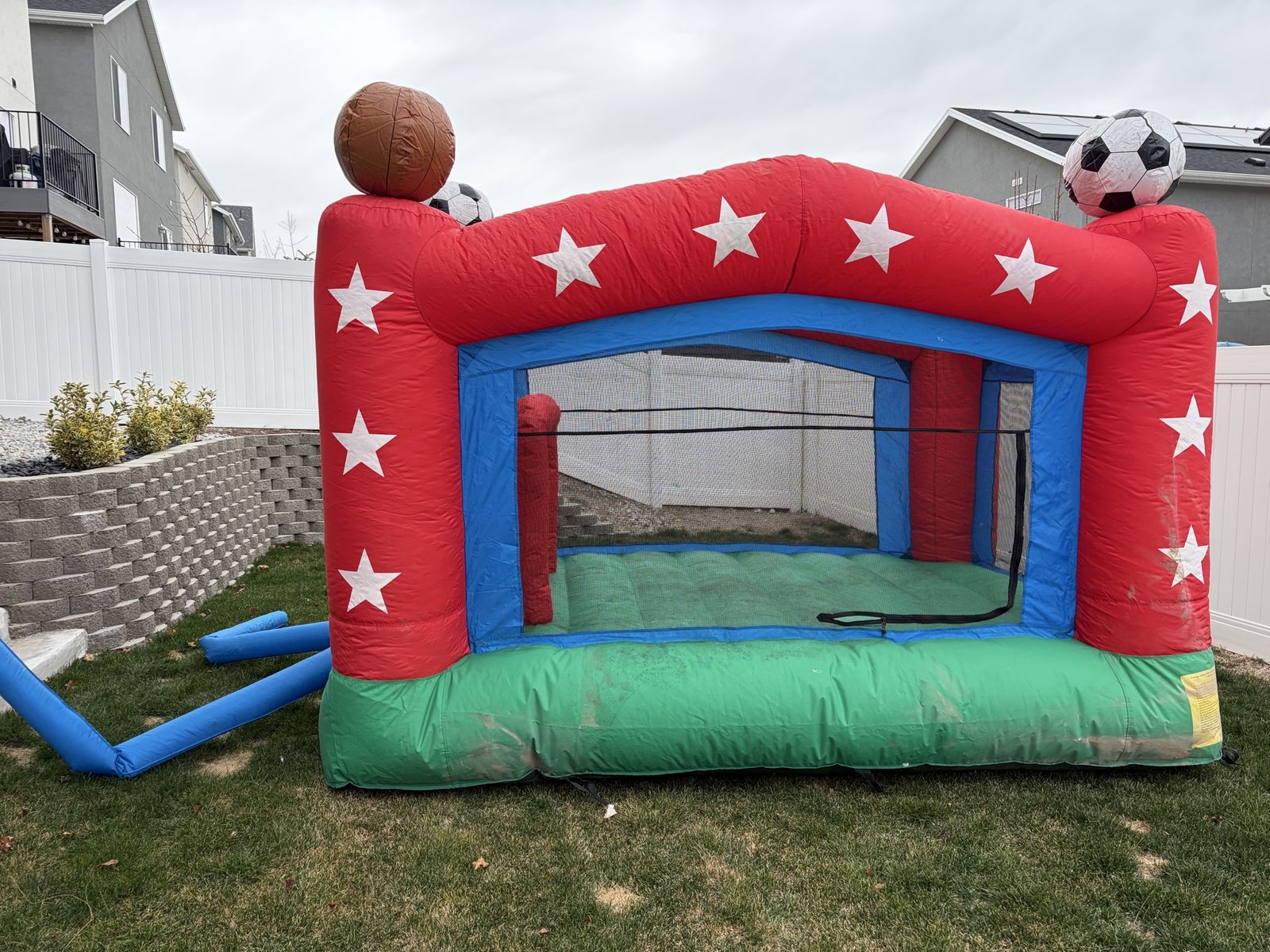 ZelleCommercial-grade inflatable bounce house with sports theme (inflatable soccer goal inside). Heavy-duty PVC (not the cheap nylon versions). Much stronger and more durable than residential models. Fits multiple kids at once. Great for parties, events, or even rental business. Good condition and fully functional. Blower included but open to sell separately. Approx. 11’x7’x8’ (LxWxH) Pickup only.