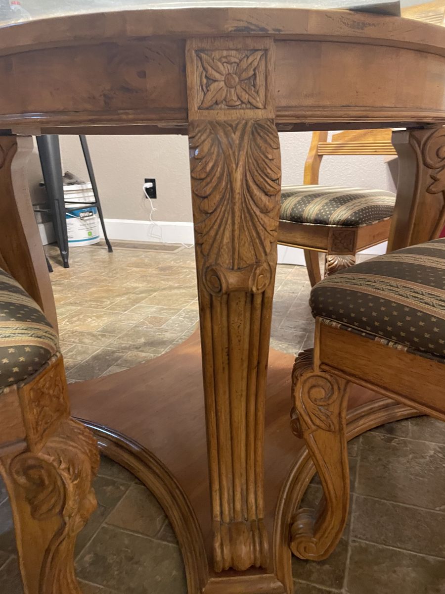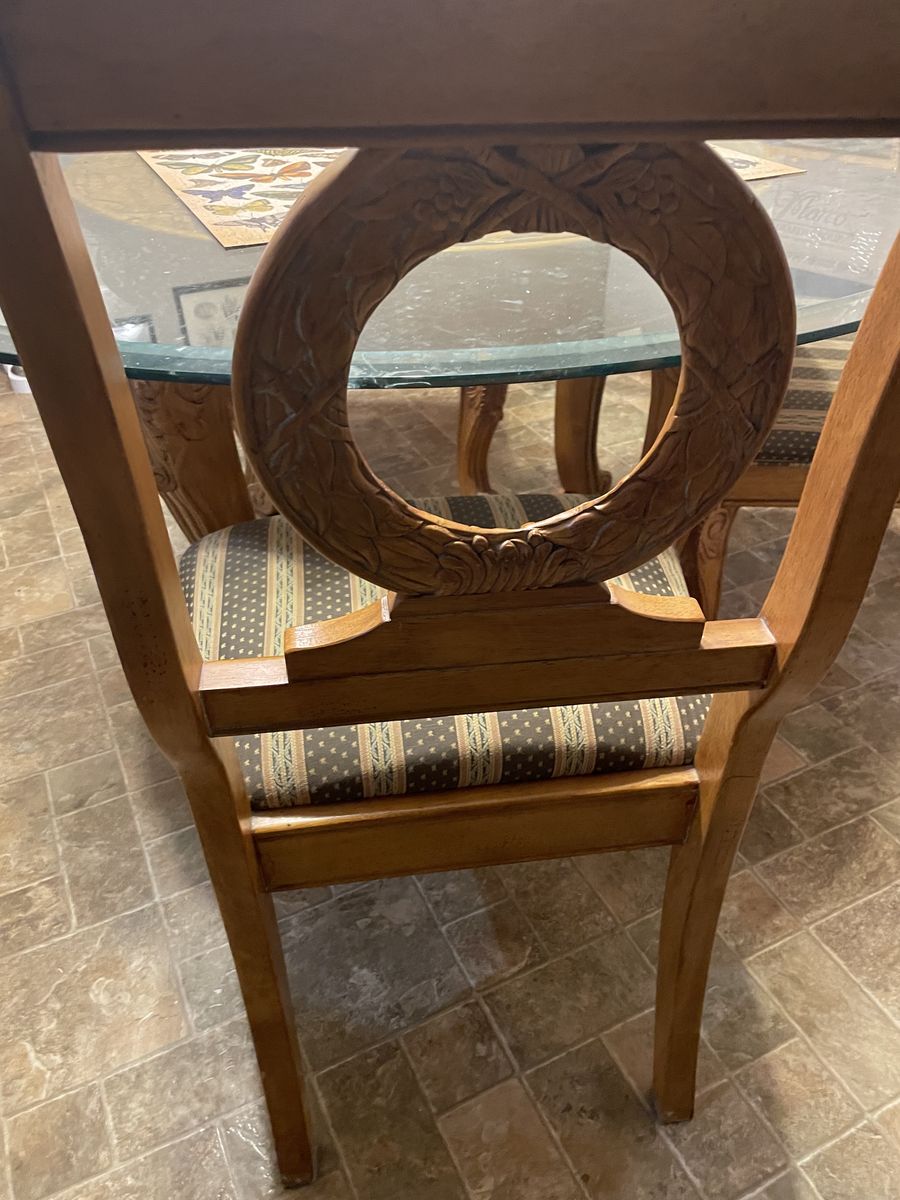This is a beautiful kitchen table with a large glass top and has 4 chairs. It has the most beautiful woodwork on the chairs and the table legs.