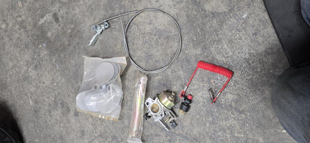 Venmocarb, 3 props, kill switch, throttle cable, and spark plug wrench. props are 7, 7.5, and 8 inch
