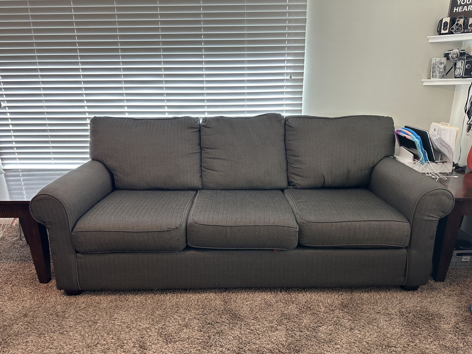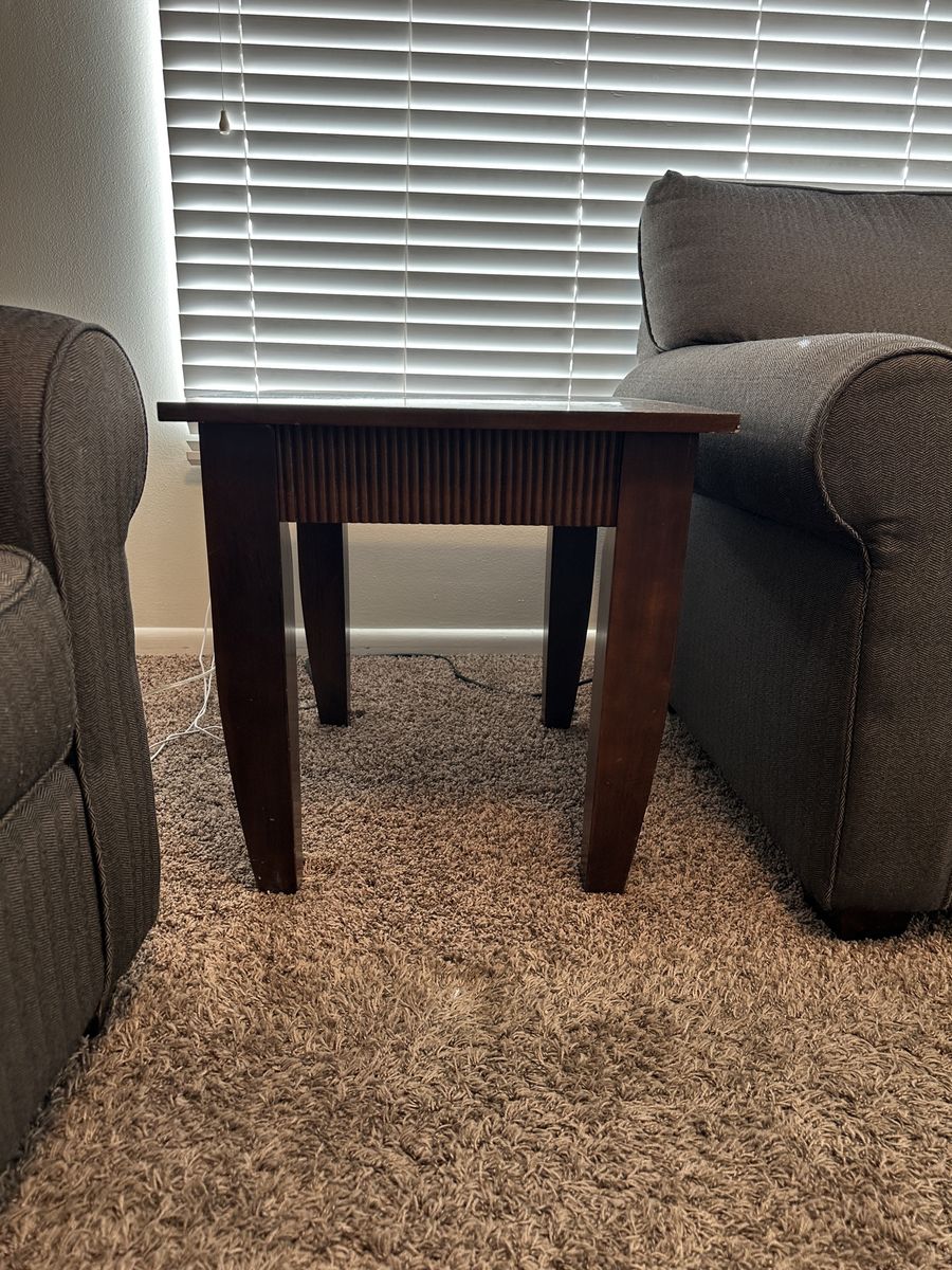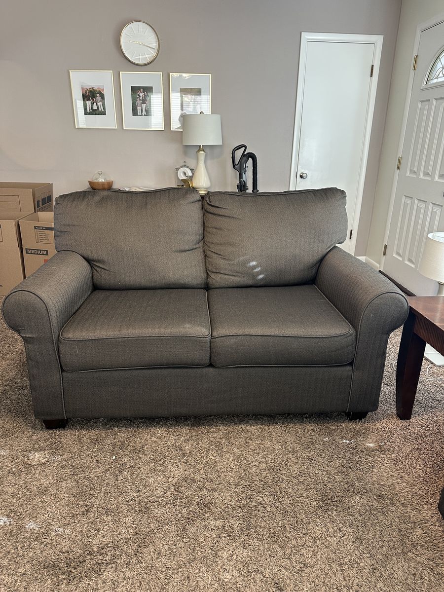 ApplePayGreat condition. Smoke-free/Pet-free home. Gray herringbone fabric. 88” length couch + 63” length love seat + 27” length x 22” width x 22” height brown wood side table. $100 OBO for set, OOS, FCFS, pickup in So. Ogden.