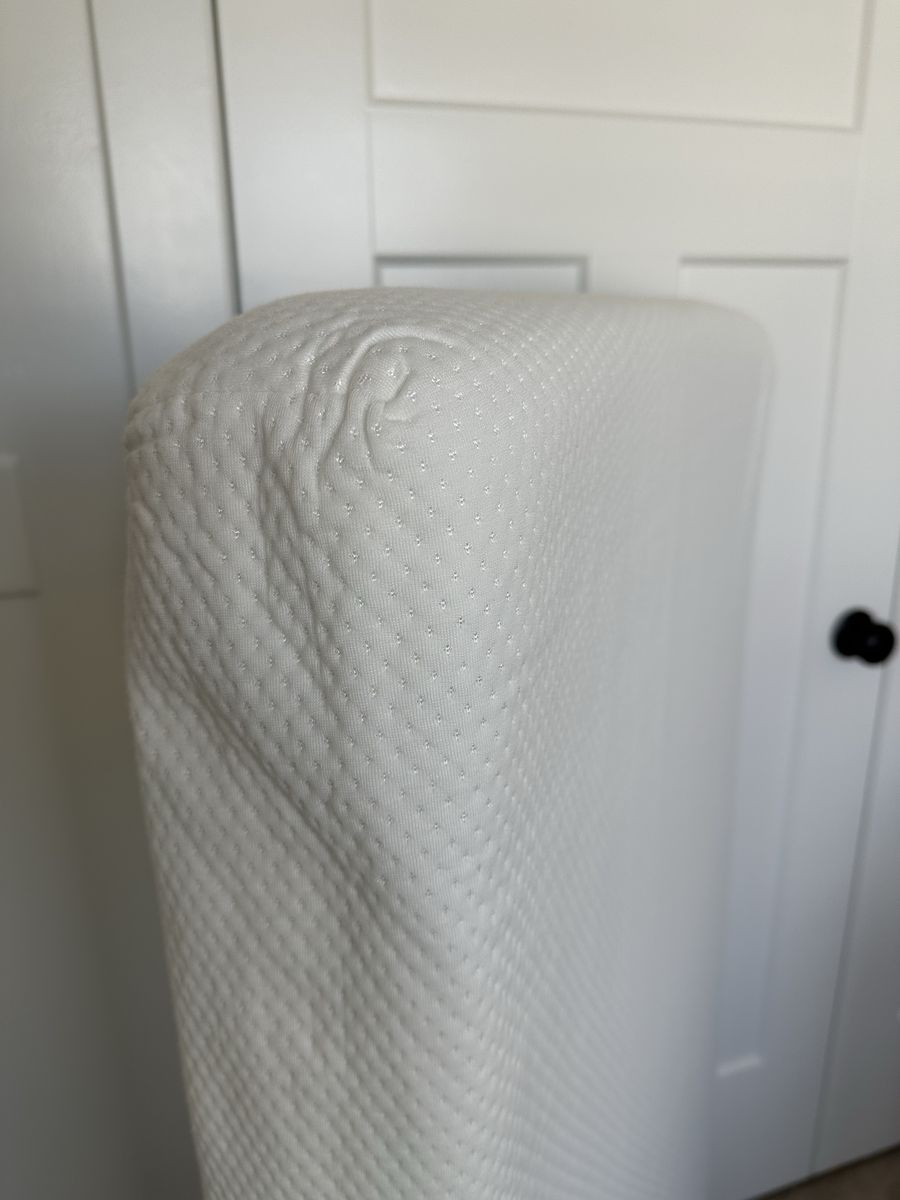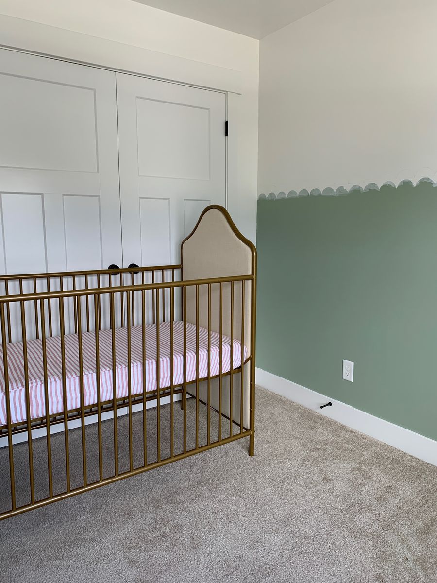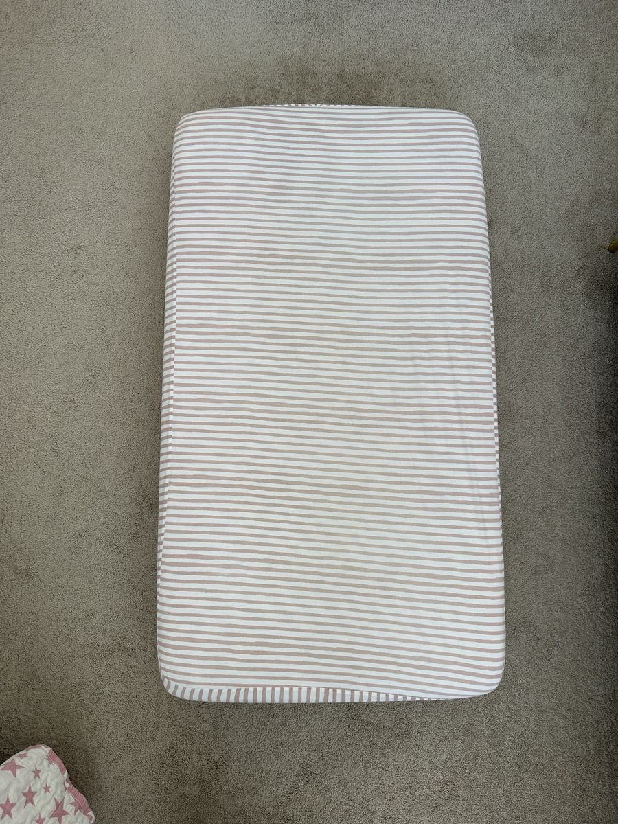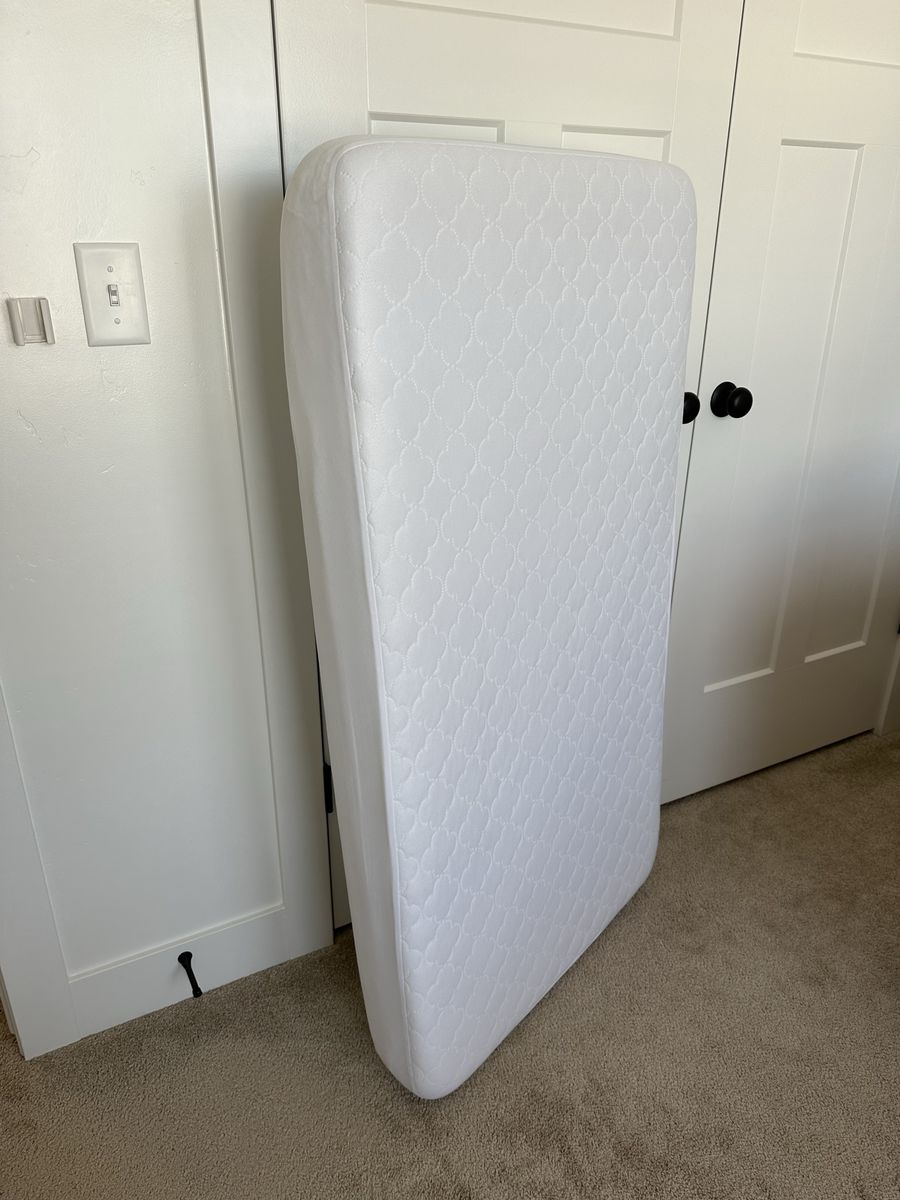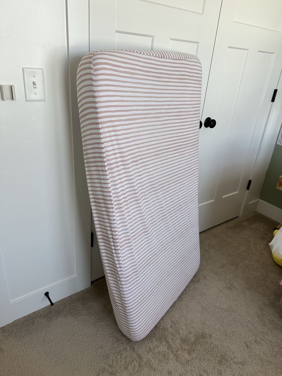 VenmoCrib has a metal frame with upholstered ends. Measures 54” wide 29” deep 52” high. Three adjustable mattress height settings. No scratches, scuffs or stains. Mattress with mattress protectors and 2 sheet sets all included. Everything is in great condition and the sheets have been washed. This setup was fantastic for my daughter but she recently graduated to a big girl bed. Everything is disassembled and ready to move.