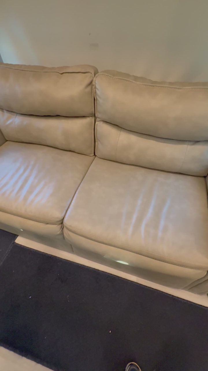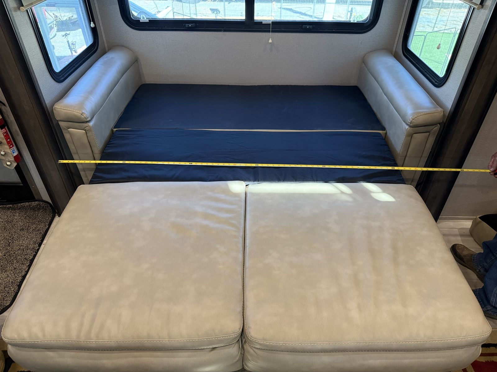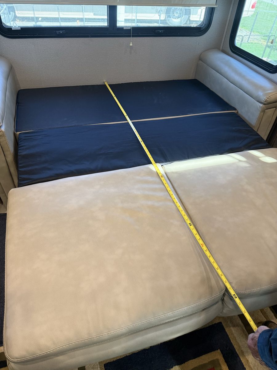 VenmoVersatile leather sofa sleeper. Great for your RV or small living area. Pulls out into a bed. Never slept on. Excellent condition with no scratches, cracks or blemishes. Measures about 62-63 inches wide and 70-71 inches long when extended. Light tan color.