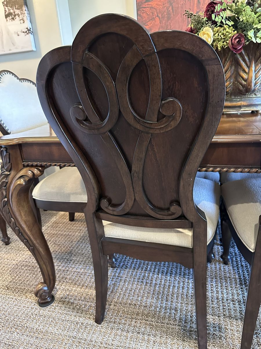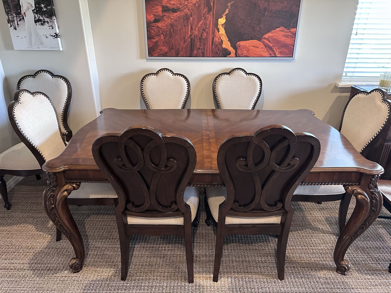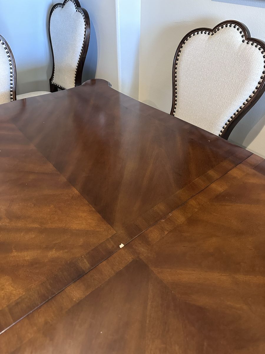 VenmoThis beautiful wood dining table is in great condition and comes with 2 leaves 18” each leaf. Table is 72” x 44” without leaves. Height is 30 1/2”. 8 beautiful cream colored chairs.