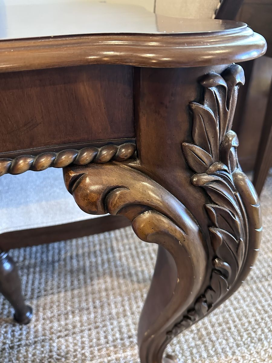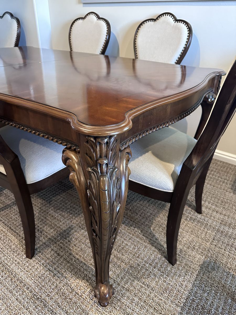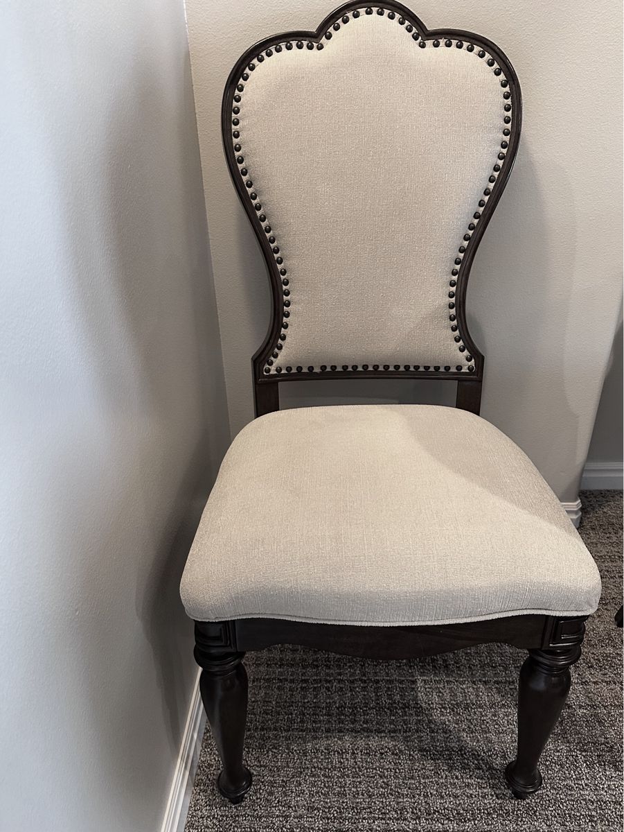 VenmoThis beautiful wood dining table is in great condition and comes with 2 leaves 18” each leaf. Table is 72” x 44” without leaves. Height is 30 1/2”. 8 beautiful cream colored chairs.