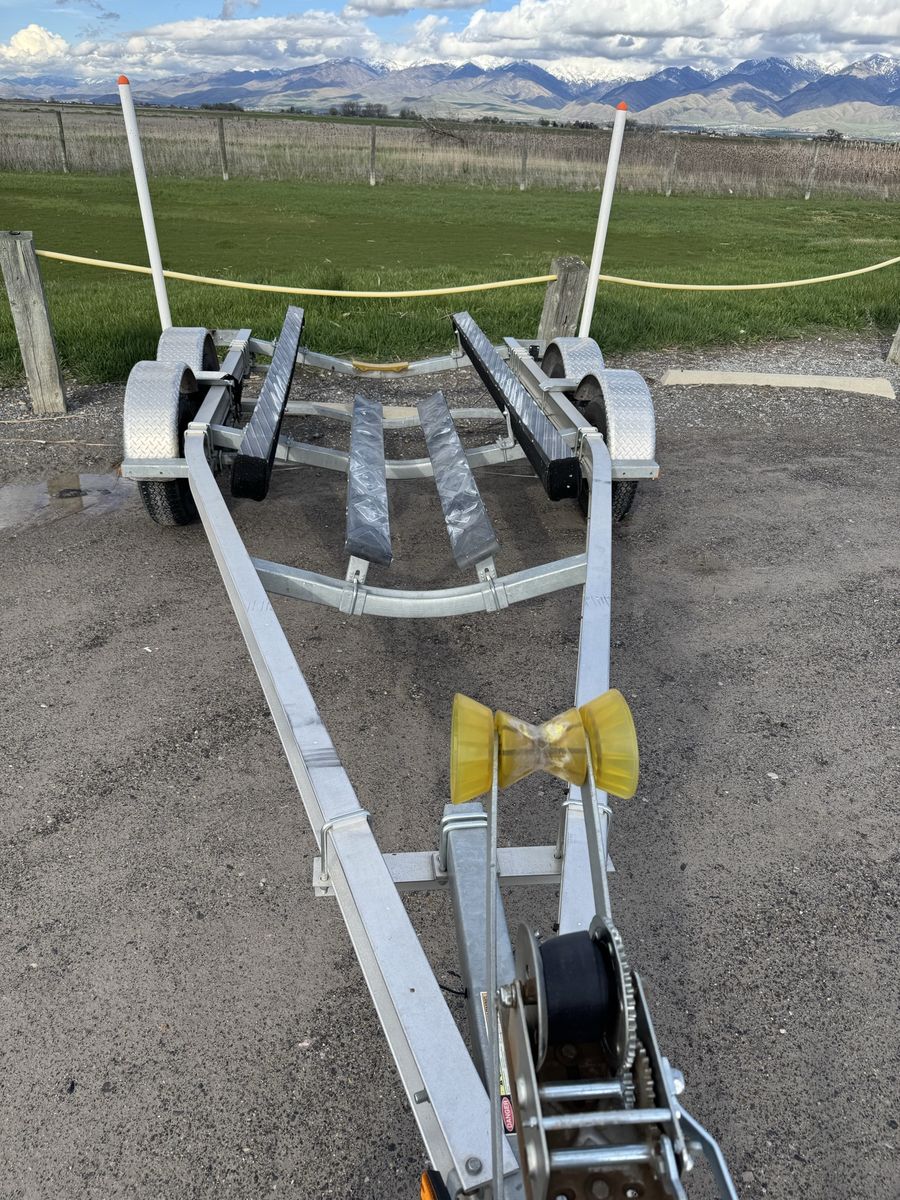 Zelle23’ double axle aluminum trailer. Setup for a 19’ boat currently but would accommodate an 18-21’ boat. Overall length 23’6”. Capacity of 5,300 lbs. only used in fresh water. Clean title in hand. Asking $3,800