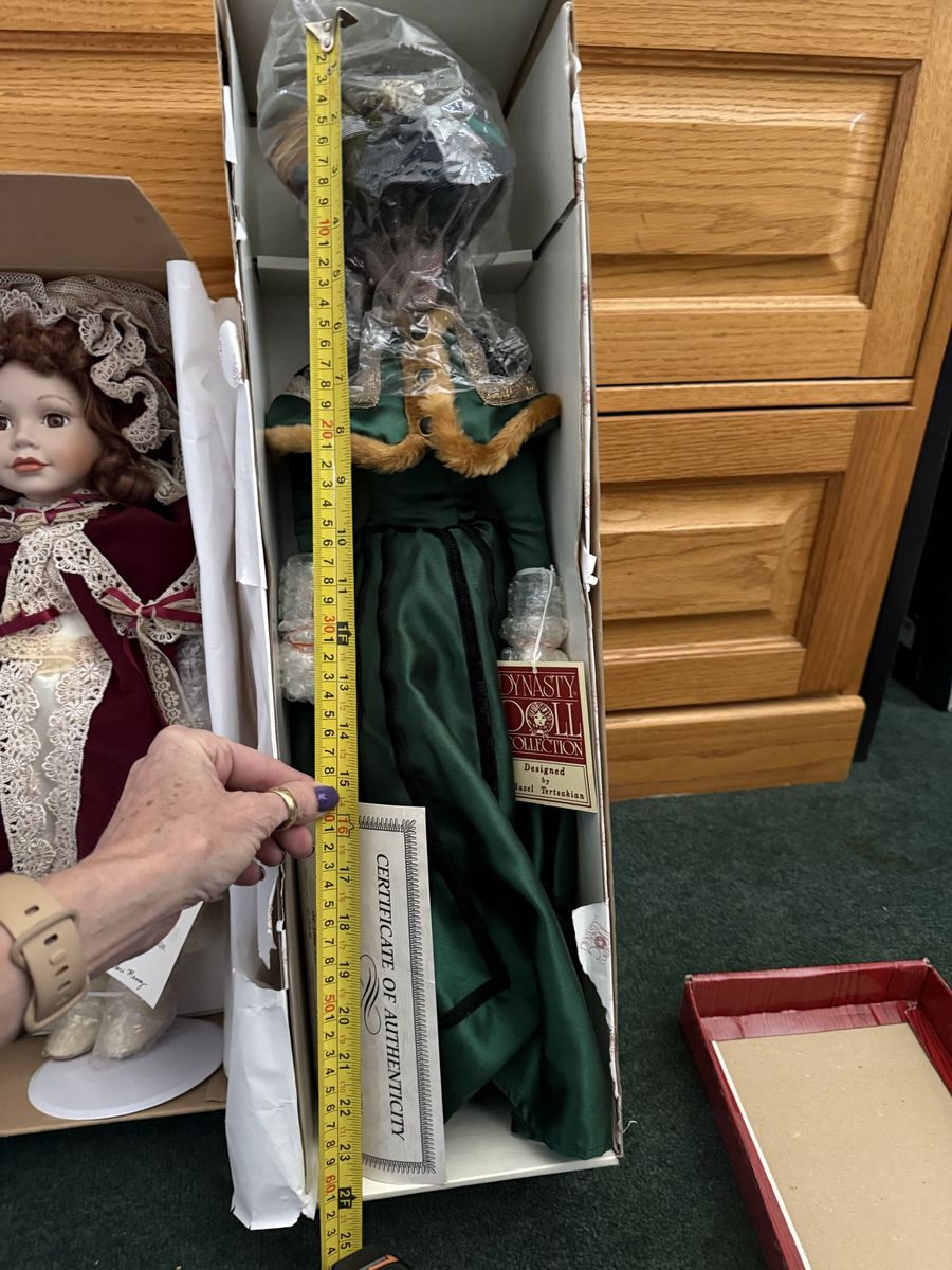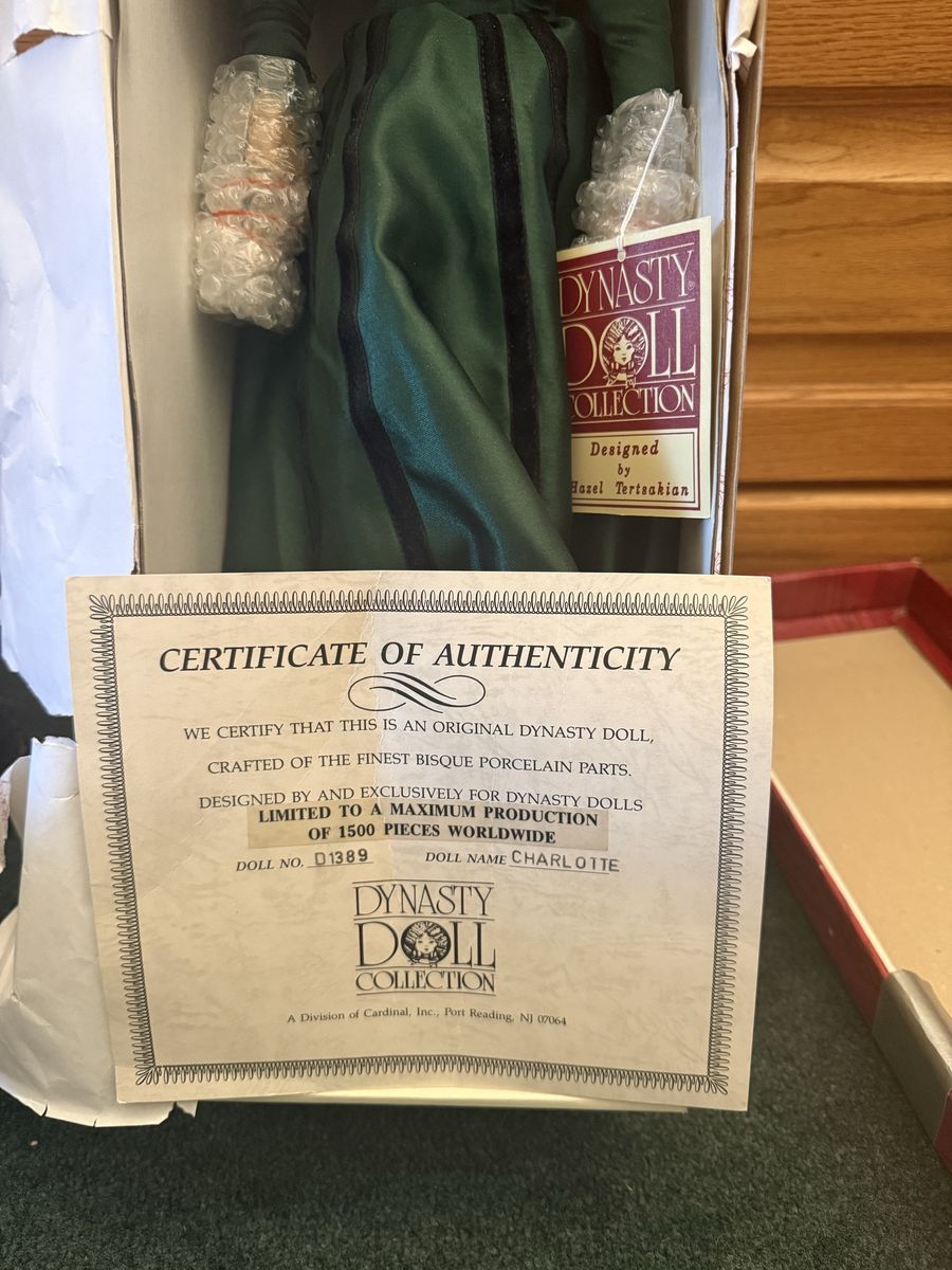 VenmoPorcelain doll Dynasty doll collection by Hazel Tertsakian has a certificate of authenticity. Doll is 23 inches tall has dark updo hair with dark eyes, green velvet dress with collar with gold fur pan three snaps down the front hands have a muffin warmer gold fur with black fringe.