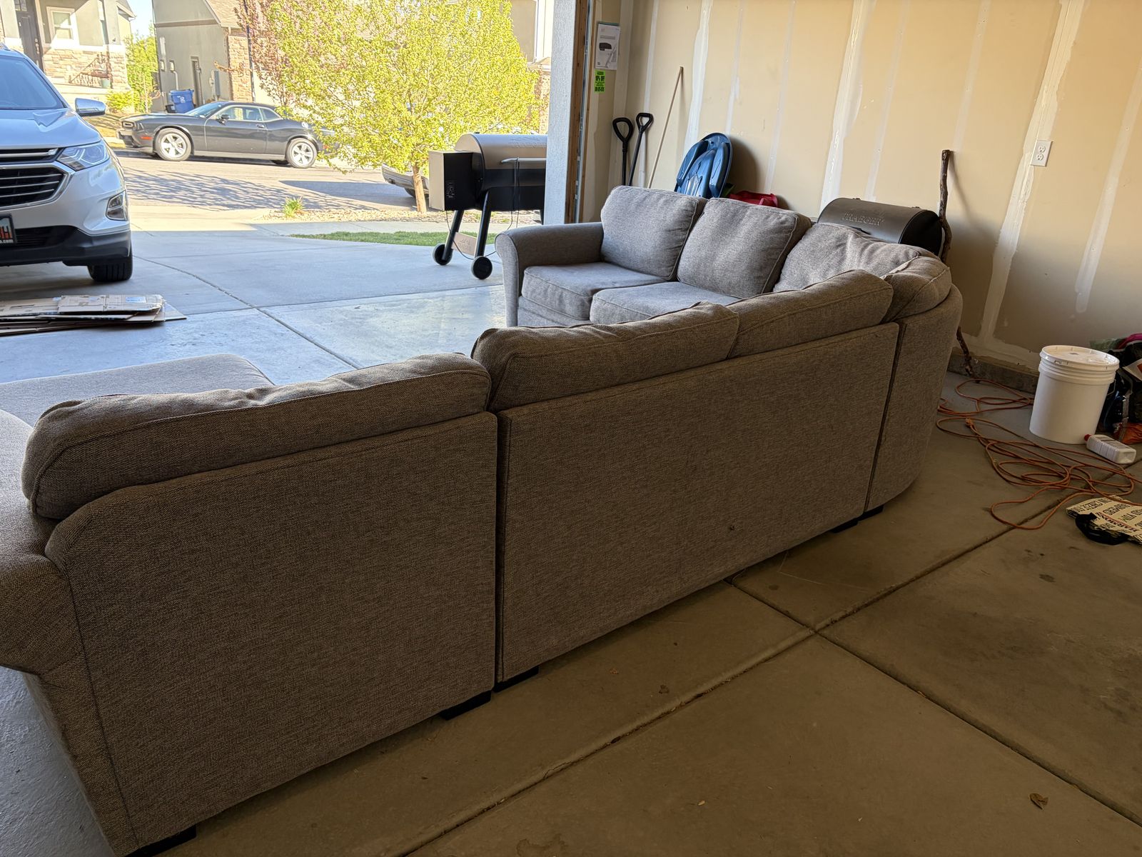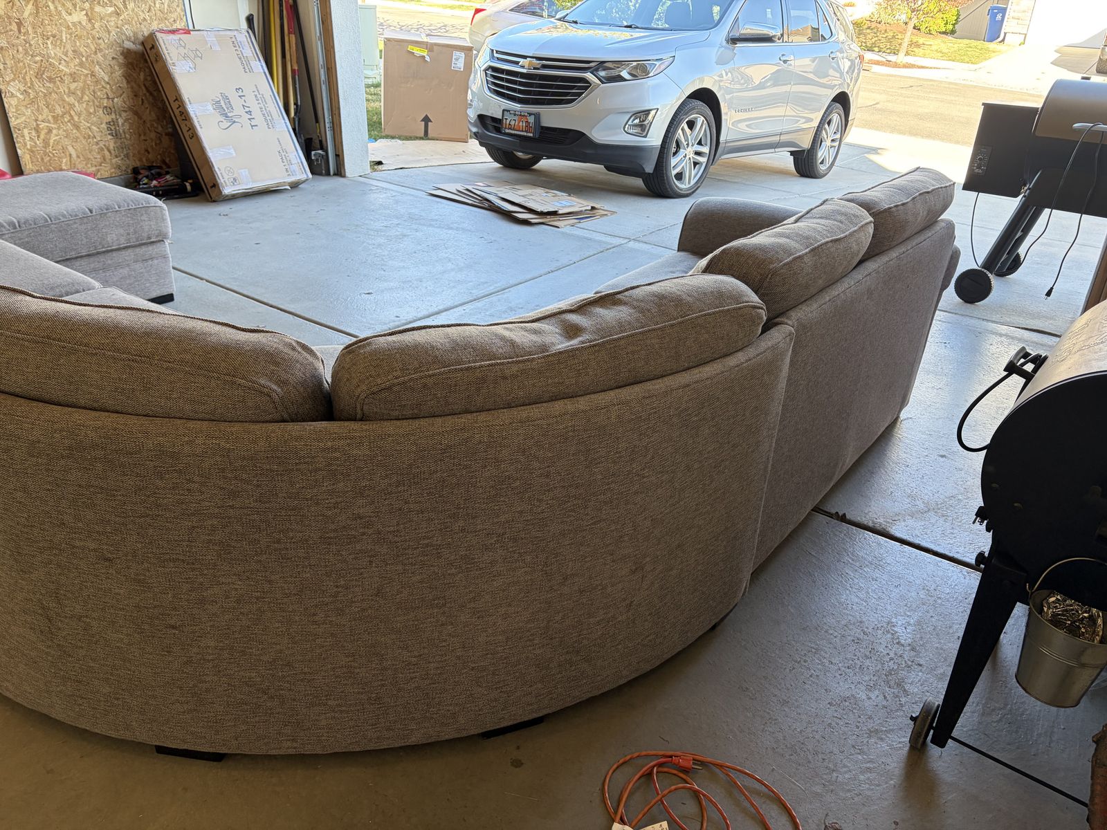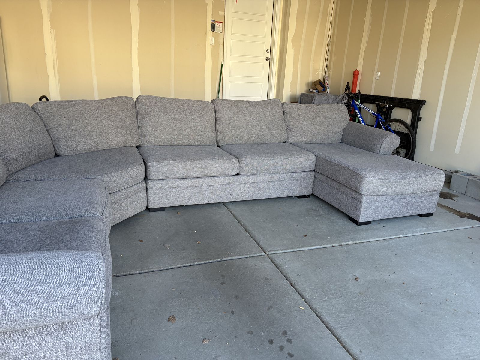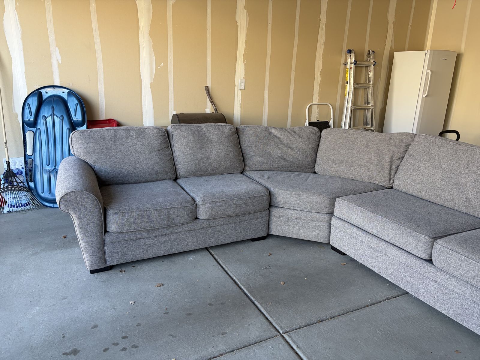 VenmoUsed gray sectional sofa. Good condition, aside from one supporting board having popped out of place in the back. Should be easy to open some stitching in the back, put into place and re-stitch. Almost no aesthetic impact if the back faces a wall. Can also be used as-is if you don't mind sinking in the the center a bit. Pets in home, but no significant rips or tears and no odor.
