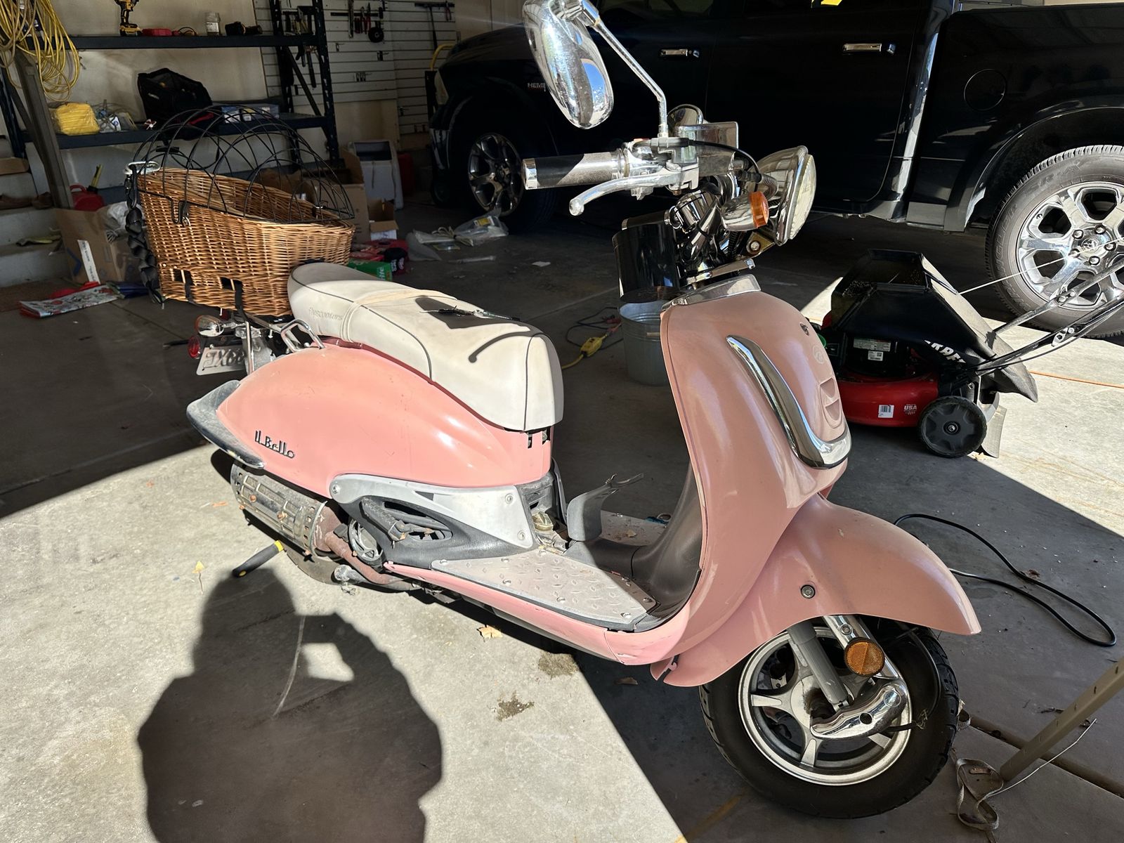 VenmoMeet Astrid. Or as my kids like to call her ‘Assturd’. As is- needs fresh gas and likely battery. It worked great two summers ago when I used it last but it’s been garaged while we lived out of state. It was registered at some point but I’ve never done it. Can draw up a bill of sale but no title available if you’re really worried about making it ‘legal’. Basket on back for your small pups or groceries. Super cute and fun project scooter!