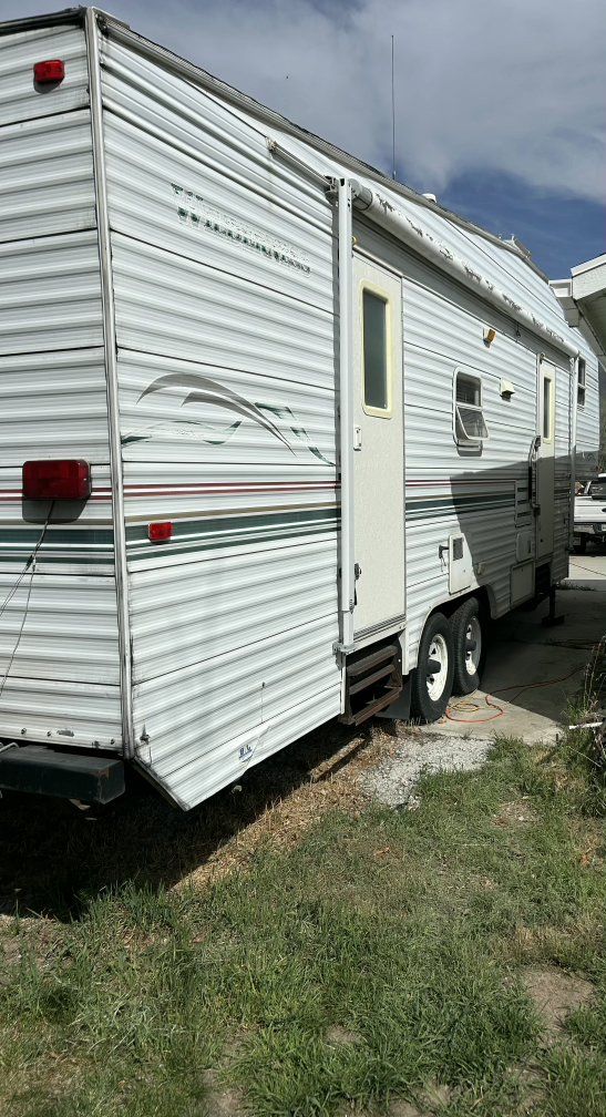 Venmo2000 Fleetwood wilderness fifth wheel camp trailer with slide out. water damaged and leaking. simply want it gone. clean title! appliances were in working order when parked, tires are good to pull trailer now. located in Provo