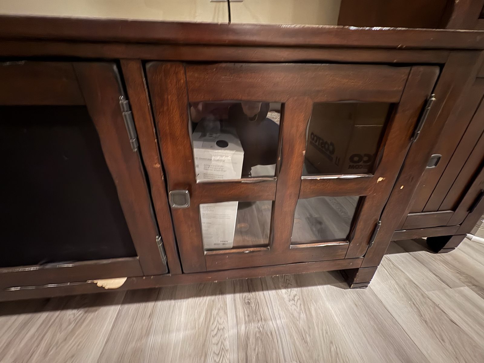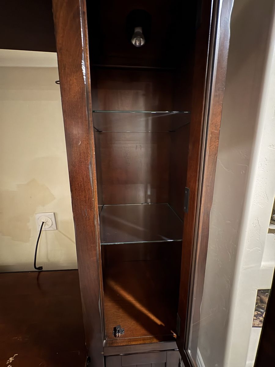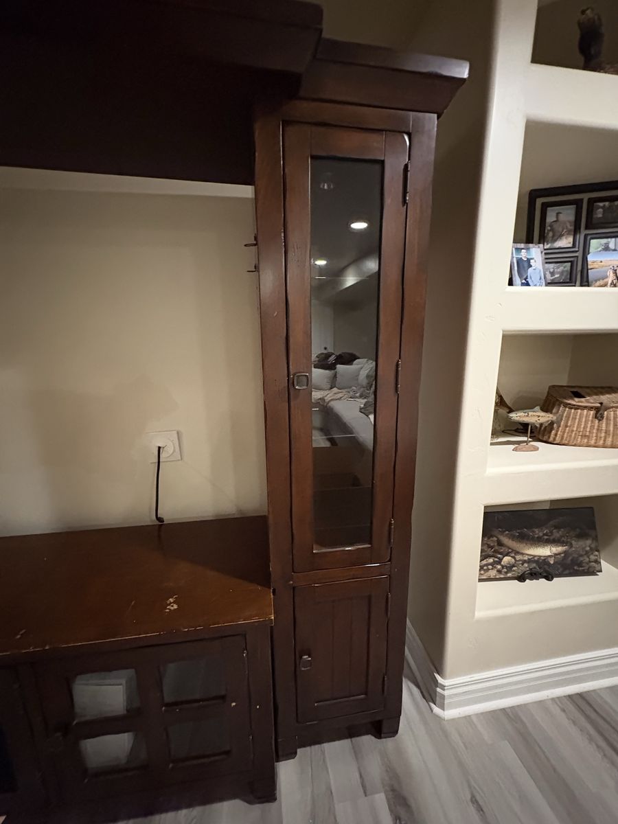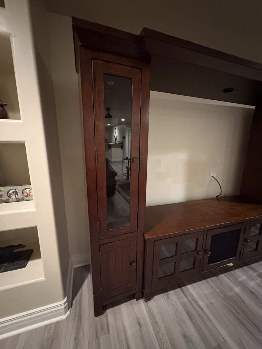 Real wood entertainment center. Lights on the shelves areas some damage.