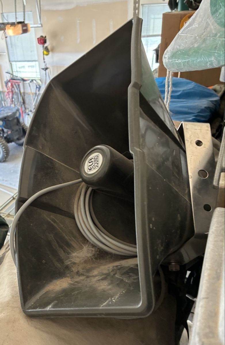 VenmoELA Sound For sale is a heavy-duty ELA Sound Paging Horn Speaker. This is a professional-grade, re-entrant horn designed for high-clarity voice paging and signaling in large areas. It is built with a rugged, weather-resistant housing, making it perfect for outdoor use, warehouses, sports fields, or industrial sites. Key Features: • Condition: Good used condition. Some surface dust from storage, but the unit is solid and includes the original wiring. • Mounting: Includes a heavy-duty stainless steel "Omni-Purpose" mounting bracket for easy installation on walls or poles. • Durability: All-weather construction designed to withstand the elements. • Audio: High-efficiency driver for superior voice intelligibility over background noise. Technical Specs (Typical for this model): • Brand: ELA Sound • Type: Paging / Talkback Horn • Application: 70V/100V systems or standard PA setups