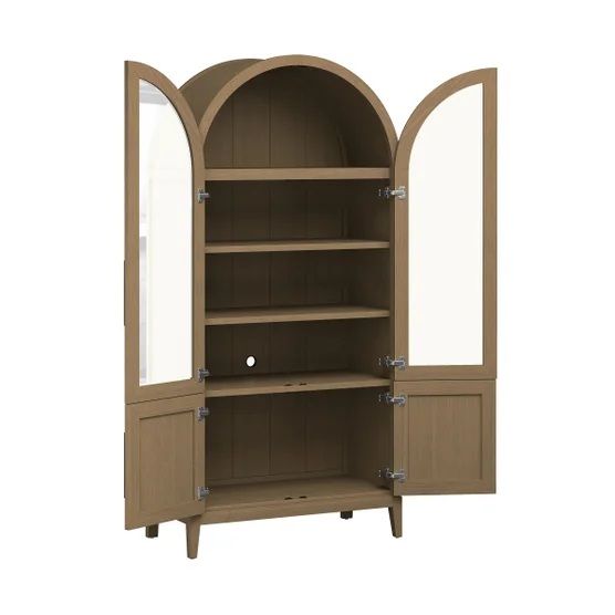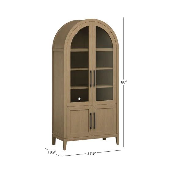 The Aspen bookcase brings classic charm and thoughtful function to your home. It's arched top and picture frame molding create a graceful silhouette available in natural or brown finishes that complement any space. Crafted from FSC certified rubberwood solids with acacia veneers, it balances beauty with sustainability. Two tempered glass doors offer a clear view of your favorite items while protecting them from dust. Adjustable shelves and a lower storage cabinet provide flexible organization. Refined yet practical, Aspen is a timeless piece that elevates your space with softness, sophistication and everyday elegance.