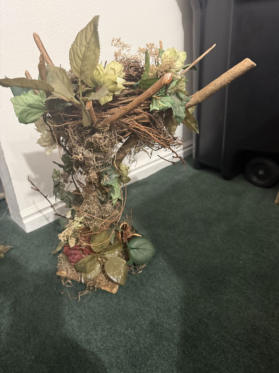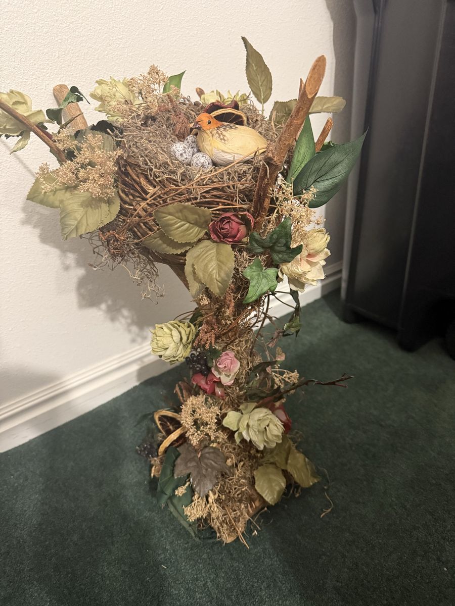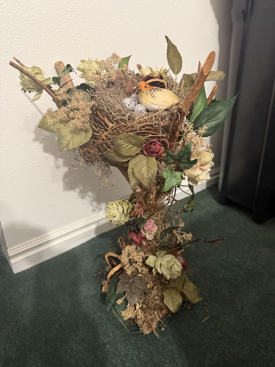 VenmoFloral arrangement in kind of a tree wood stand with a birds nest on top with a small bird with a orange head with eggs fun arrangement has various flowers of light green to pink and some orange peels with some grapes purple.