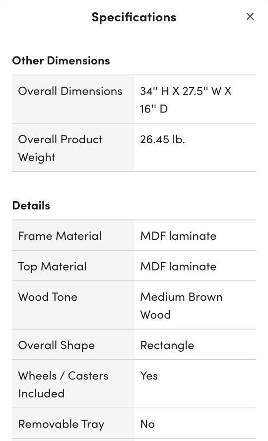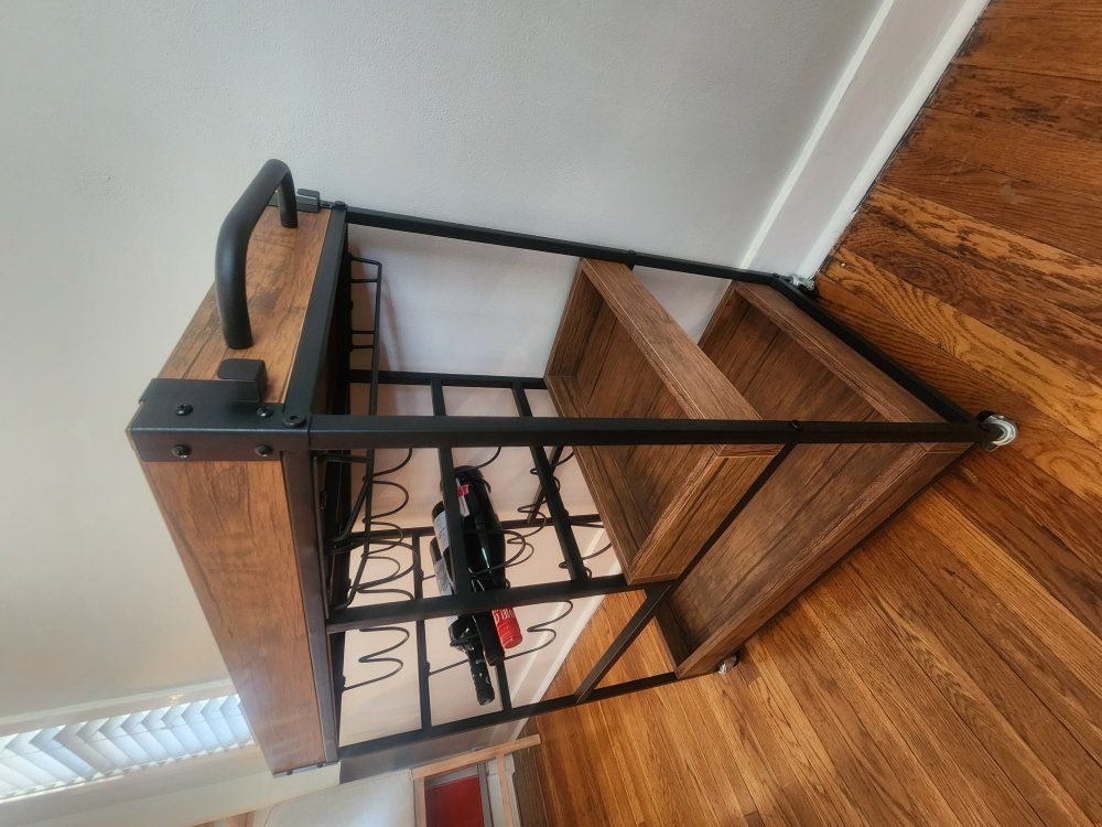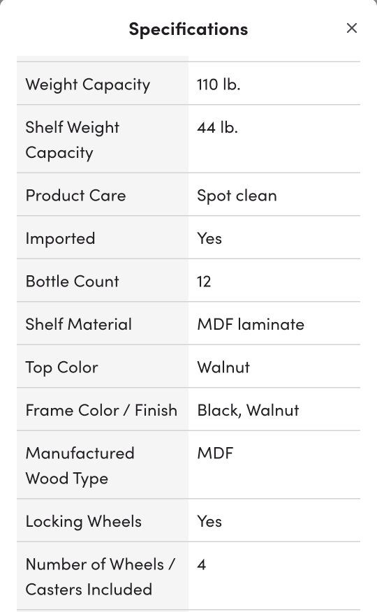 PayPalLightly used bar cart Black metal frame MDF laminate with a warm walnut finish See pictures for specifications