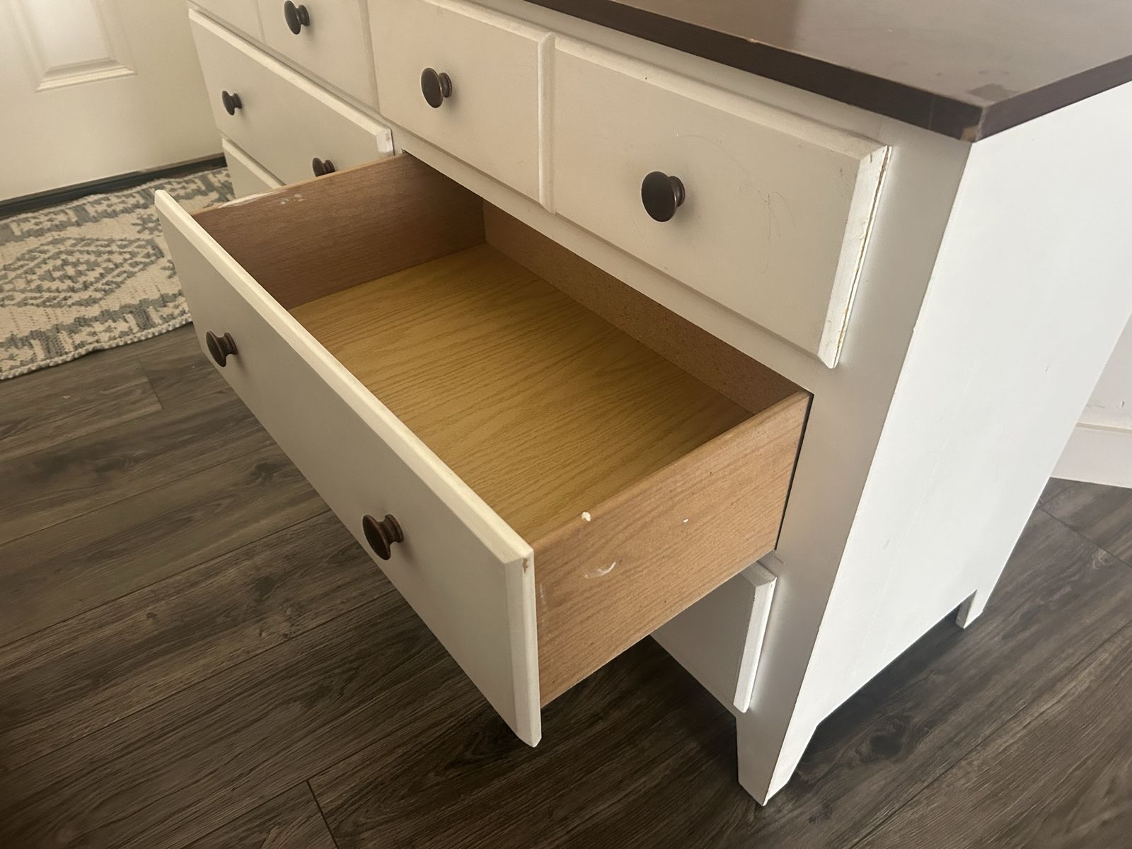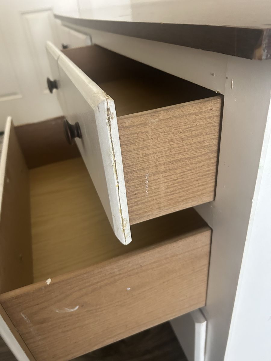 VenmoGreat sturdy dresser. 55 inches long, 18 inches wide, 30 inches tall. One drawer face broke off but has been glued back together. Also one rail is broken but the drawer still works.