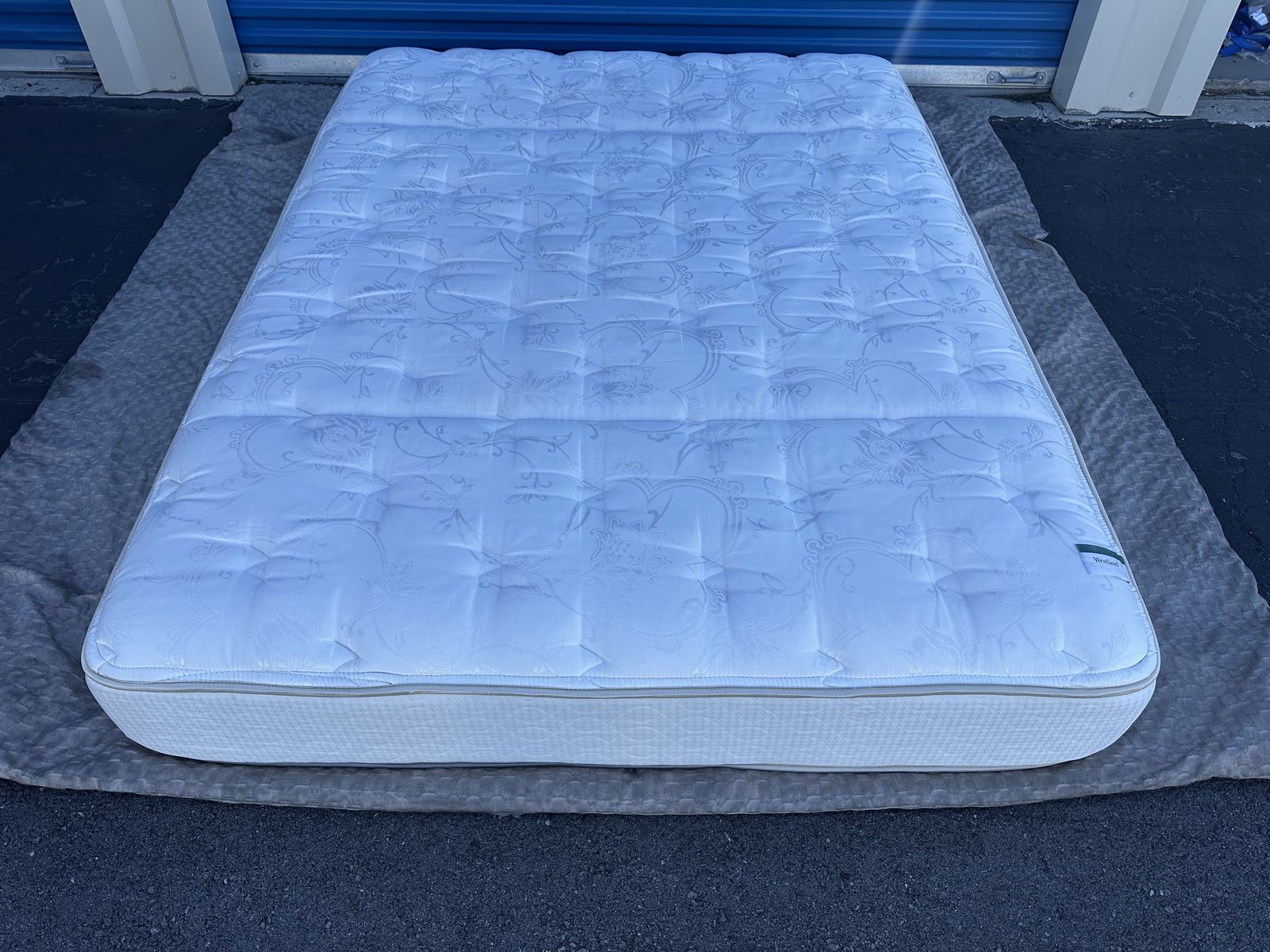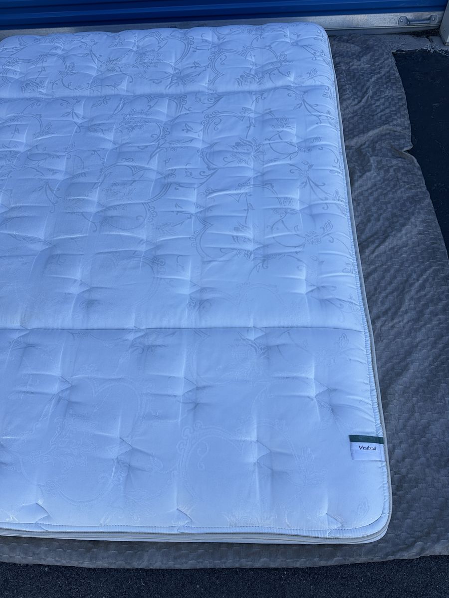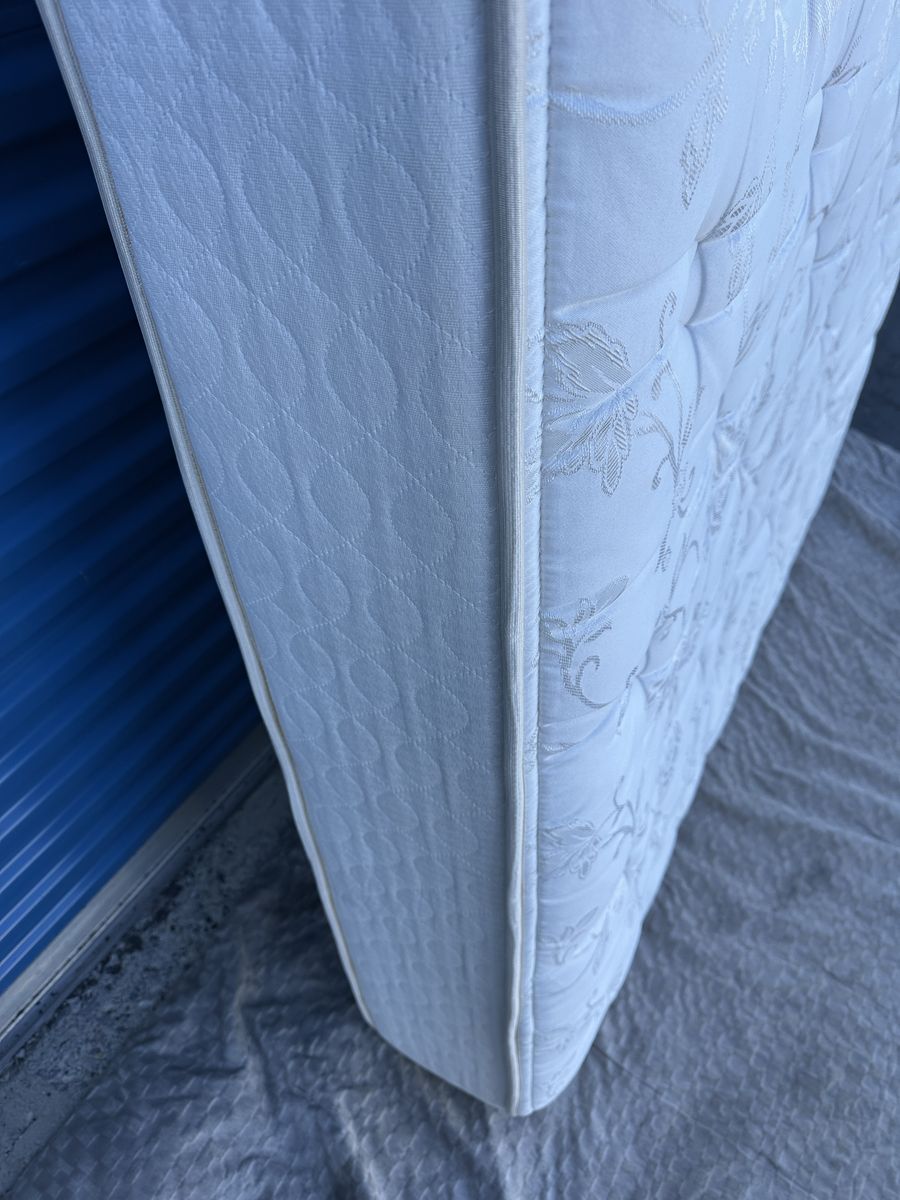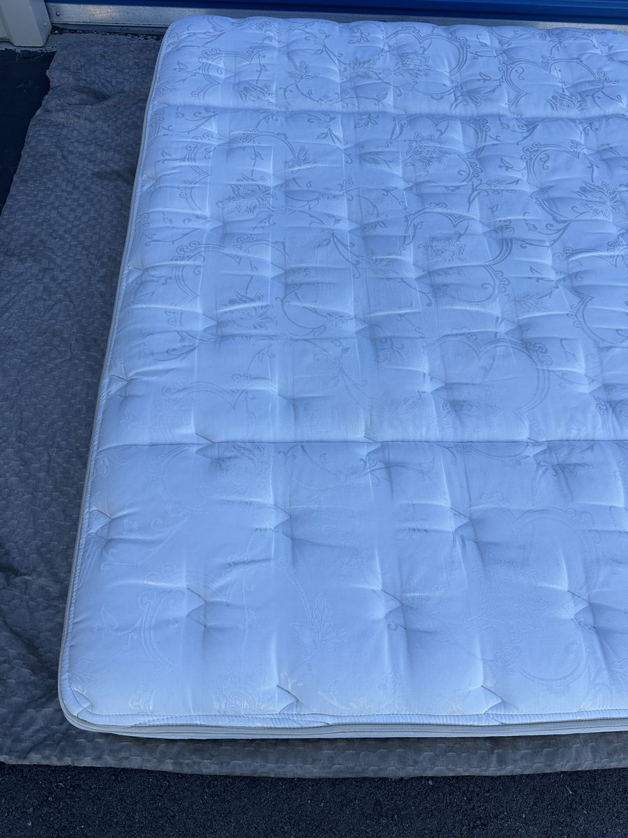 Check out this 9” queen mattress. Overall, it is in great condition. There are some noticeable signs of imperfections,a light water stain on the front, some signs of use, etc.